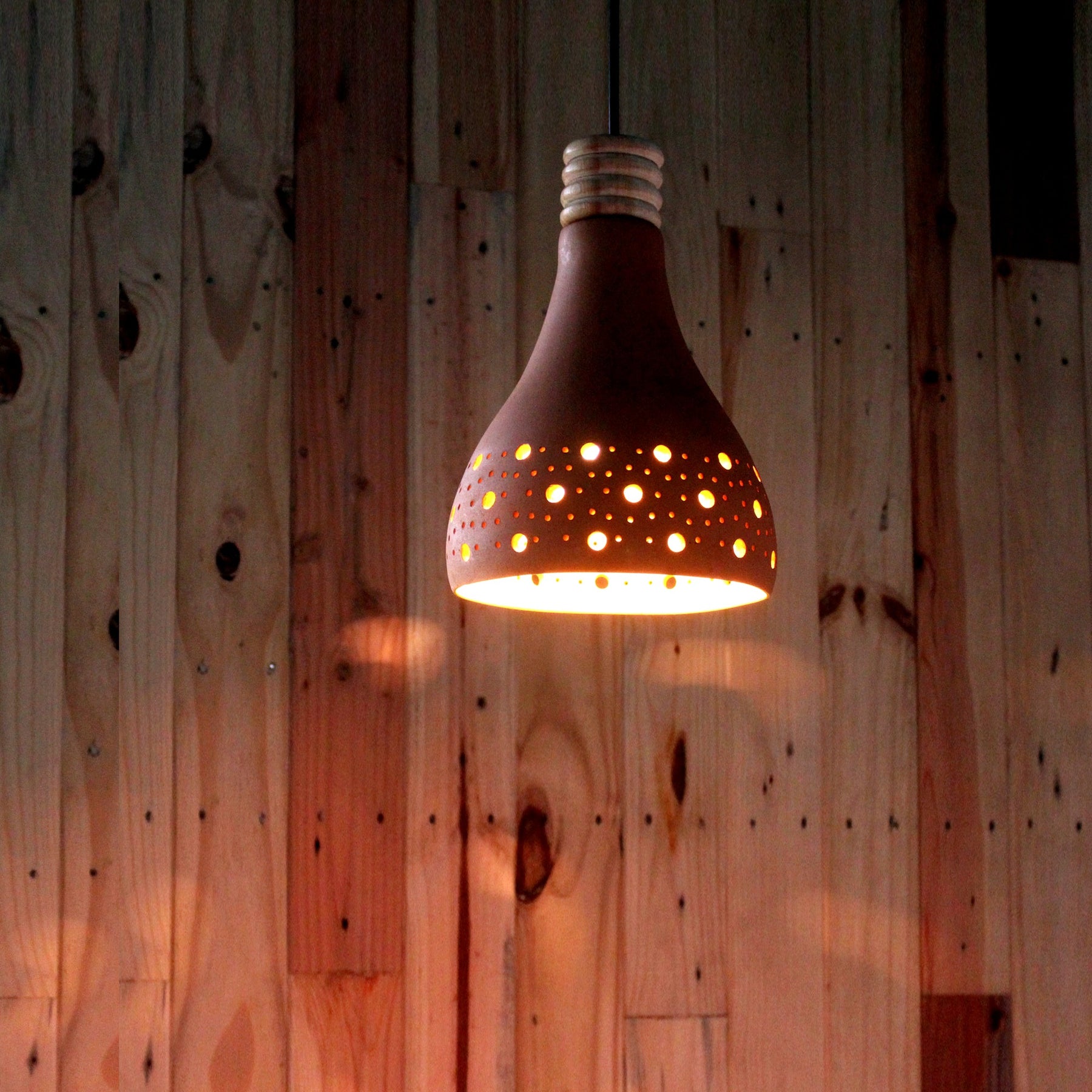 HOLLO XL1 LINEA Design is a BIG beauty with Abstract Wavy Lines inscribed with the help of many small perforations on the surface. It can shine in the middle of any rooms. Multiple pieces can enhance the decor drastically. Main Shells of the Light are made of Burned Clay (Terracotta) and designed with many styled perforations. The complete light unit is assembled together with B22/E27 holder & spacer with 6mm dia CE marked PVC wires which can straightway be hanged from ceiling with a help of a MS powder coated canopy as given. Bulb costs are not included with this product price.