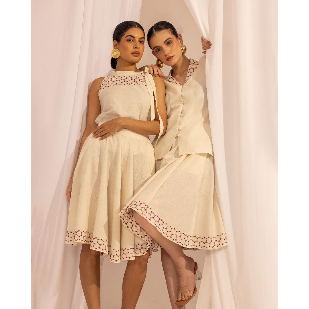 Our knee-length skirt flares out in a full circle, with hand embroidery at the hem.