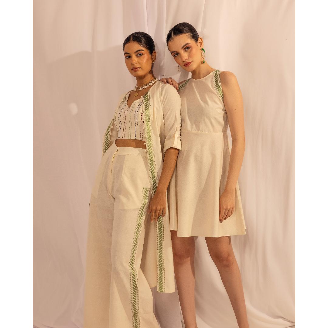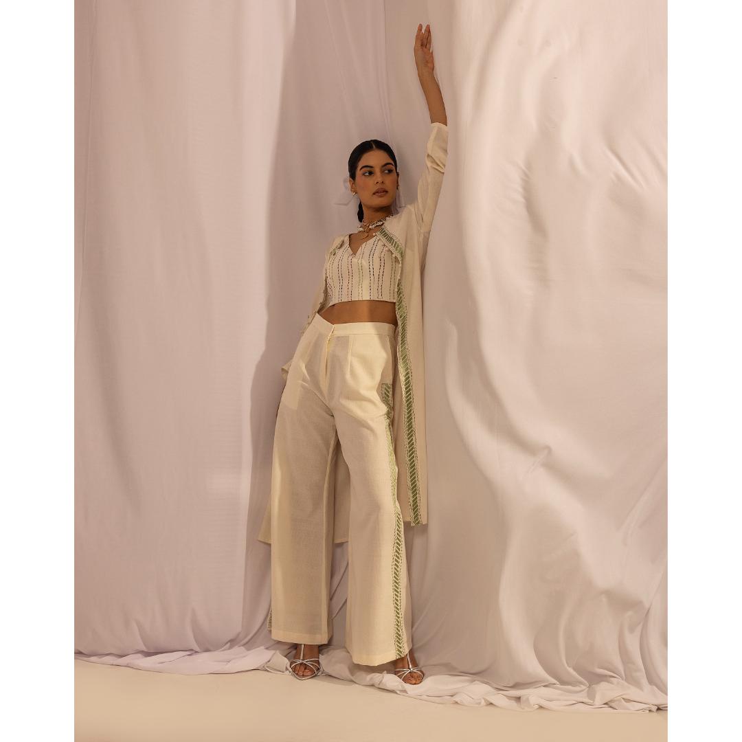 Our Wide Leg Trousers has been worn with Kantha Crop and Kantha Jacket that can be purchased separately.