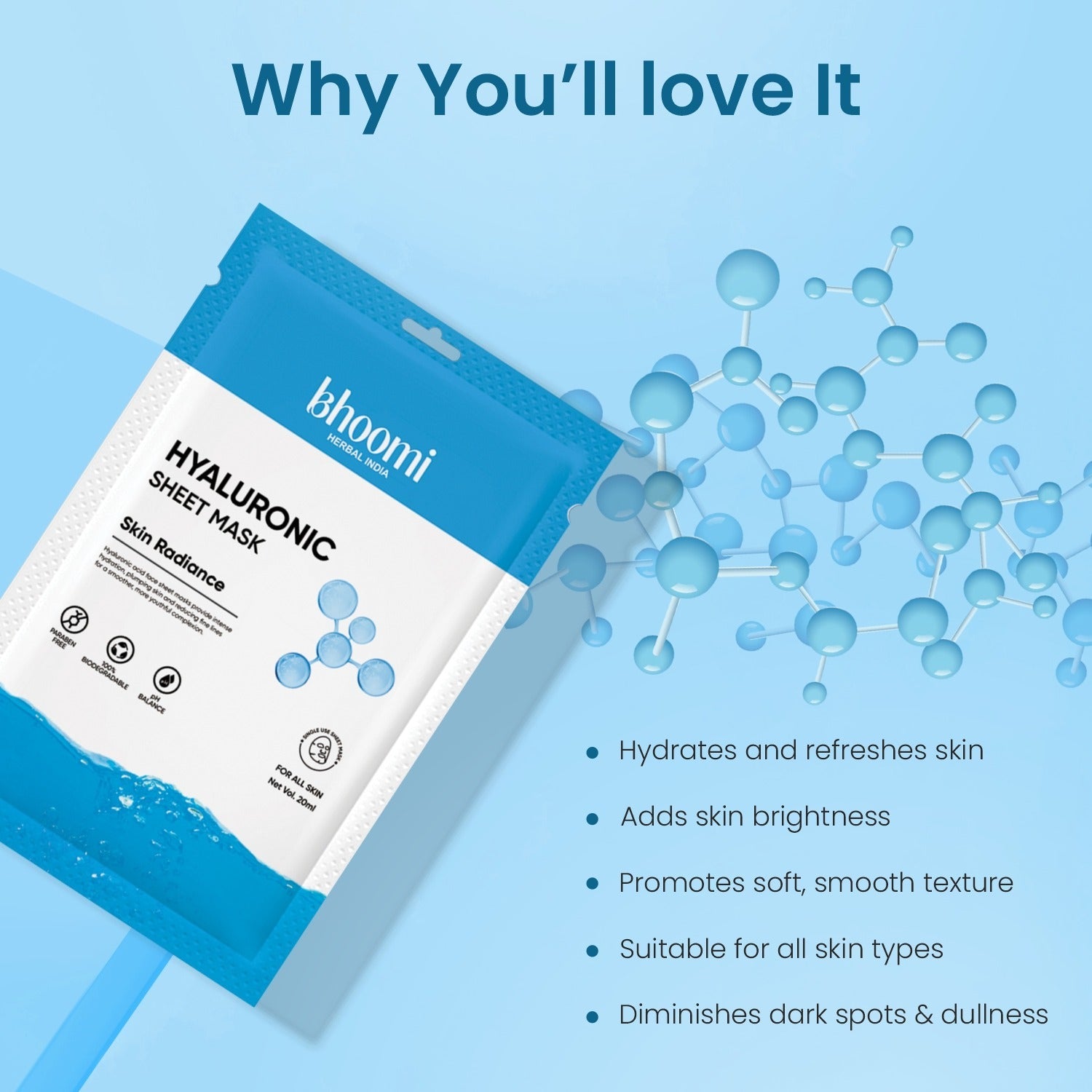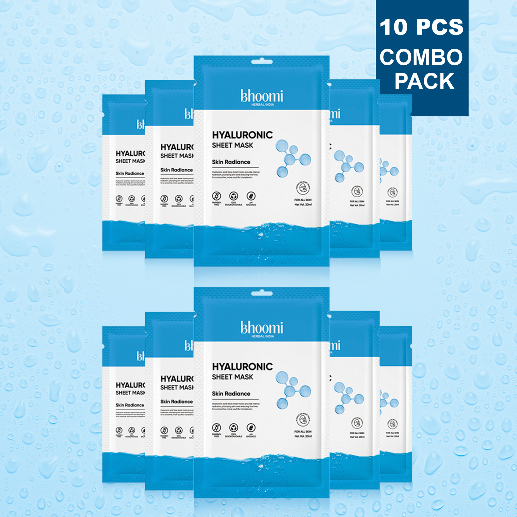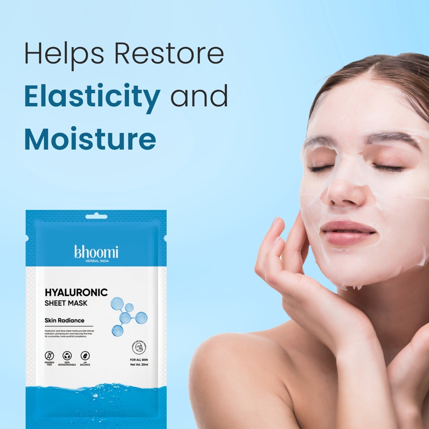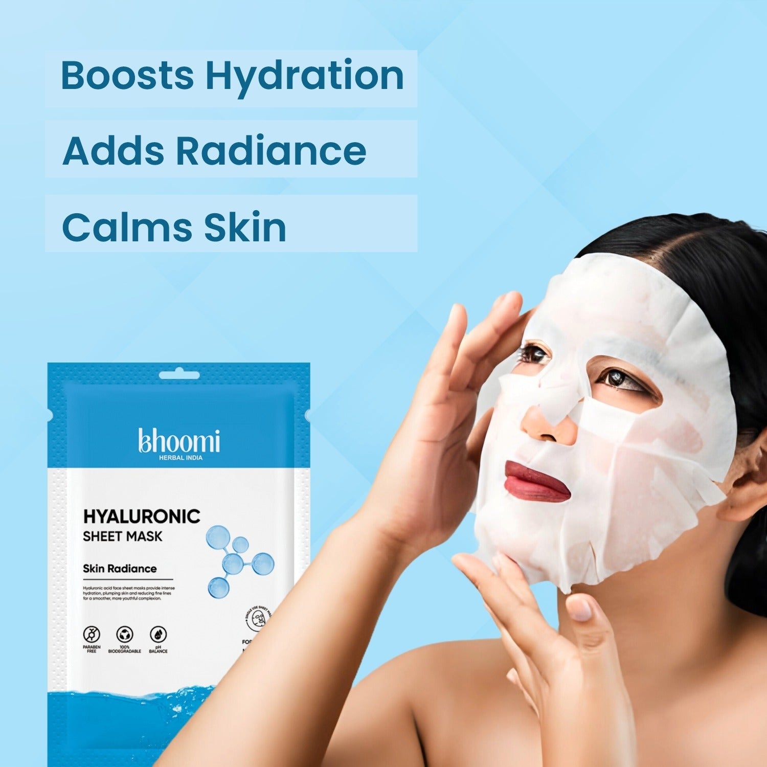 Care Instruction Get your glow in just 15 minutes: 1. Adjust the mask evenly to the contours of your cleansed face. 2. Relax and keep the mask on for 15 mins. 3. Remove and gently pat on maximum absorption. Why to Use It: Paraben-Free: Our formula is free from harmful parabens, so you can feel good about what you're putting on your skin. 100% Biodegradable: We're planet-friendly. Our mask is made from materials that break down naturally, leaving no harmful footprint. pH Balanced: Our formula is gentle and matches your skin's natural pH levels, ensuring a comfortable experience for all. Keeps your skin happy. For All Skin Types: Whether your skin is normal, dry, oily, combination, or sensitive, our mask is suitable for everyone. Skin Radiance: Get a natural glow that makes your skin look alive and vibrant. Rich in Antioxidants: Protects your skin from damage with it's antioxidant-rich ingredient. Brightens the Skin: Say hello to a brighter and more even complexion. Evens Skin Tone: Reduces the appearance of dark spots and uneven skin tone. Calms Skin: Soothe and calm irritated skin for relief. Intense Hydration: Deeply moisturizes your skin, leaving it feeling refreshed and revitalized. Reduce Fine Lines: Smooths out fine lines and wrinkles, promoting a smoother and more youthful complexion. Plumping Skin: Firms and plumps up your skin, restoring its natural elasticity and suppleness. Diminishes Dark Spots and Dullness: Fade dark spots and dullness for a brighter appearance. Promotes Soft and Smooth Texture: Enjoy silky-smooth skin that feels great to the touch. Hydrates and Refreshes Skin: Gives your skin a hydration boost for a refreshed feeling. Helps Restore Elasticity and Moisture: Keep your skin elastic and moisturized for a youthful look. The Bhoomi Herbal India Hyaluronic Sheet Mask is perfect for anyone seeking radiant, hydrated, and youthful-looking skin. Whether you're facing signs of aging, dealing with dryness, or simply want to pamper yourself with a luxurious skincare experience, this mask is your go-to solution. Experience visible results with regular use, as each mask contains the goodness of a full bottle of serum, delivering an unparalleled hydration and nourishment to your skin. Elevate your skincare routine with the Bhoomi Herbal India Hyaluronic Sheet Mask and achieve a complexion that radiates beauty and confidence. Disclaimer: If you have any sensitivities or allergies to any listed ingredients you should not use these products. You should test the products on a small area before using any new product for the first time.