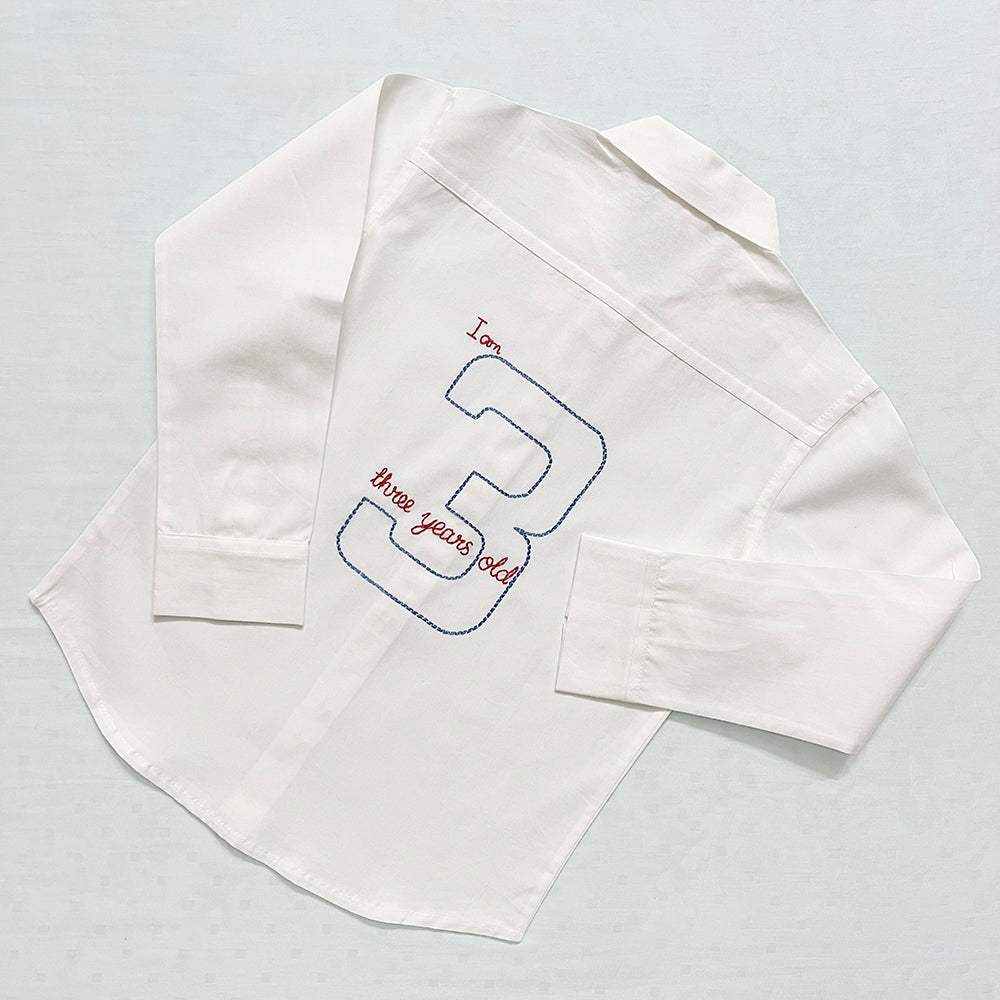 Celebrate your little one's day with our exquisite Hand-Embroidered Personalized Shirt specially designed for their third birthday! With the embroidered words "I am three years old" on the back of the shirt and the childäó»s name on the front, itäó»s a unique and personalized garment that is as special as the occasionäó»s celebrations. The handcrafted touch adds a level of charm and uniqueness that makes this garment a perfect keepsake.