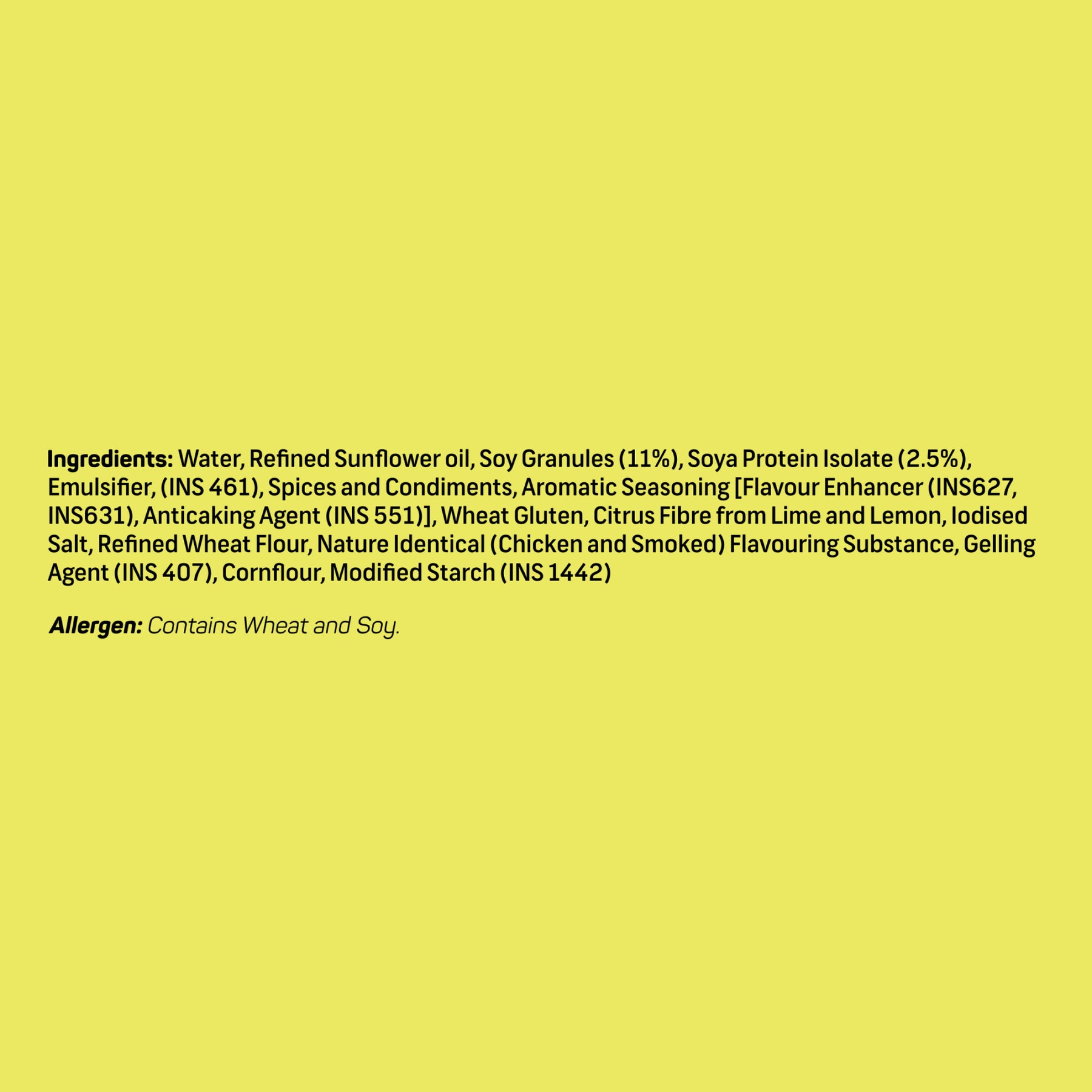 Ingredients: Water, Textura Fibrous Soy, Refined Sunflower Oil, Methly Cellulose E461, Potato Starch, Iodized Salt, Refiner Wheat Flour, Wheat Gluten, Refiner Soybean Oil, Spices, Natural Smoke Flavour, Thickener Carragenan E407, Contains Added Flavours (Natural And Natural Identical Flavouring Substances)