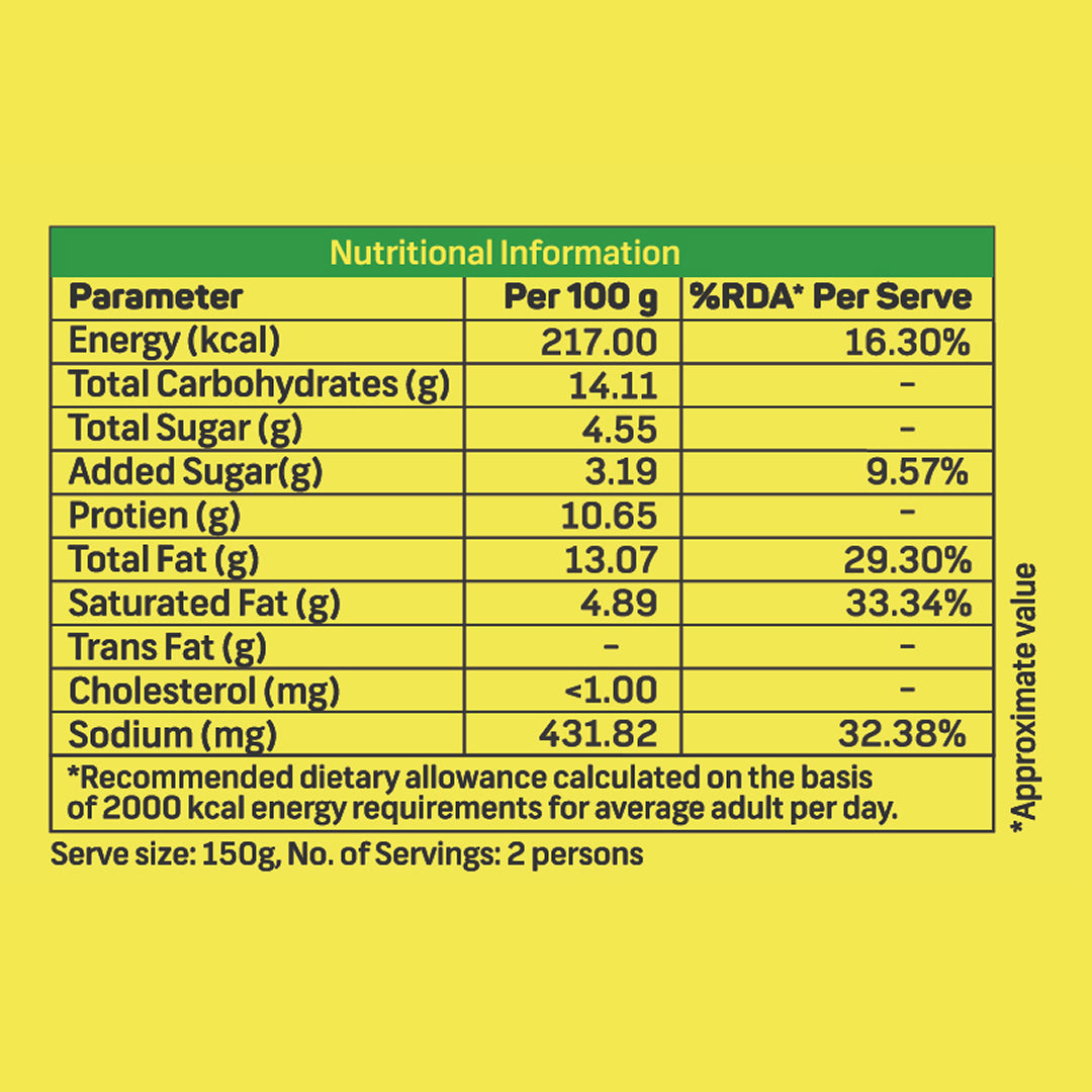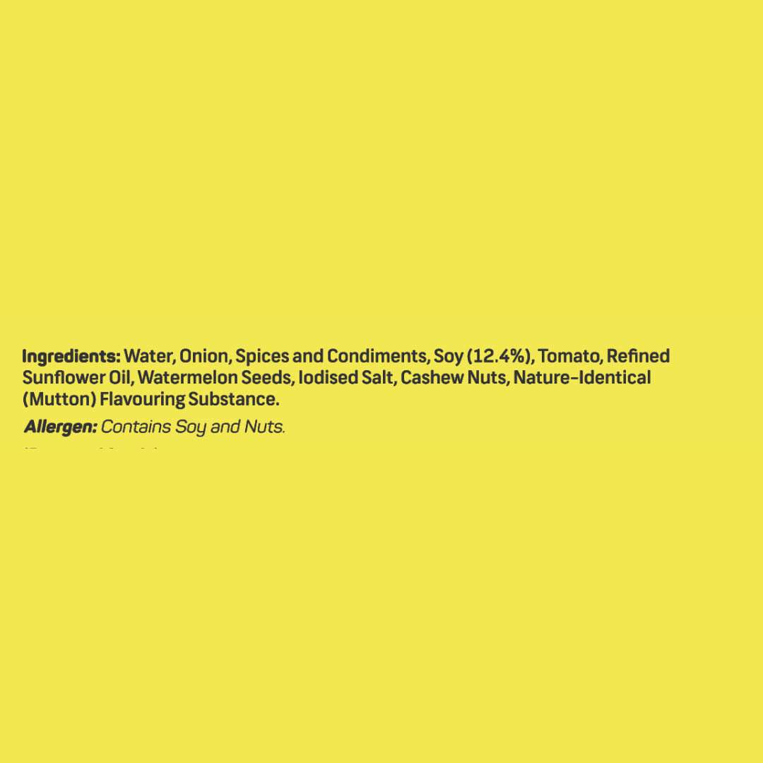 Ingredients: Water, Frozen Vegetables, Textured Soy Protein Concentrate, Refined Sunflower Oil, Culinary Paste, Vegetable Protein Blend Powder, Fresh Vegetables, Fat Flakes, Spices and Condiments, Cocoa Butter, Iodized Salt