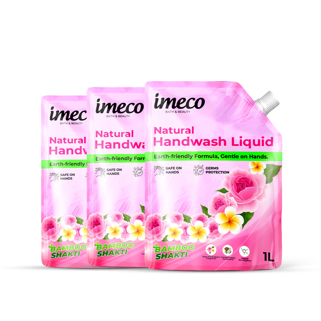 IMECO Bamboo Shakti Bath & Beauty Natural Hand Wash 1 Liter (Pouch) - pH Neutral - No Toxic Effluents, Removes Odors, 99.9% Germs Protection