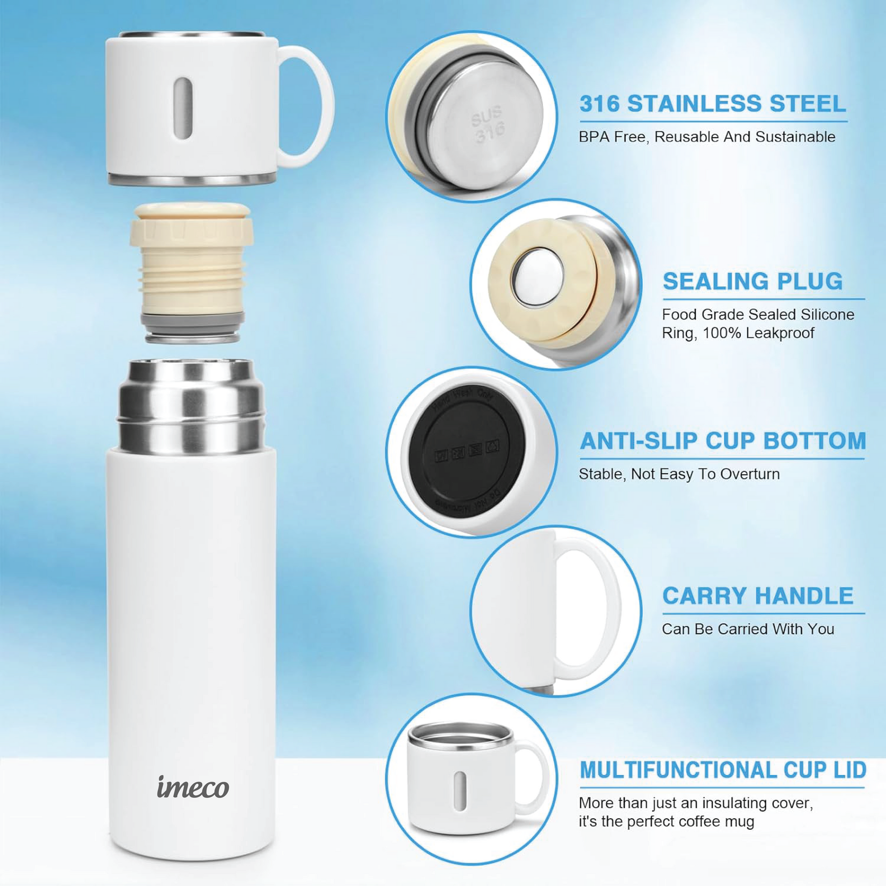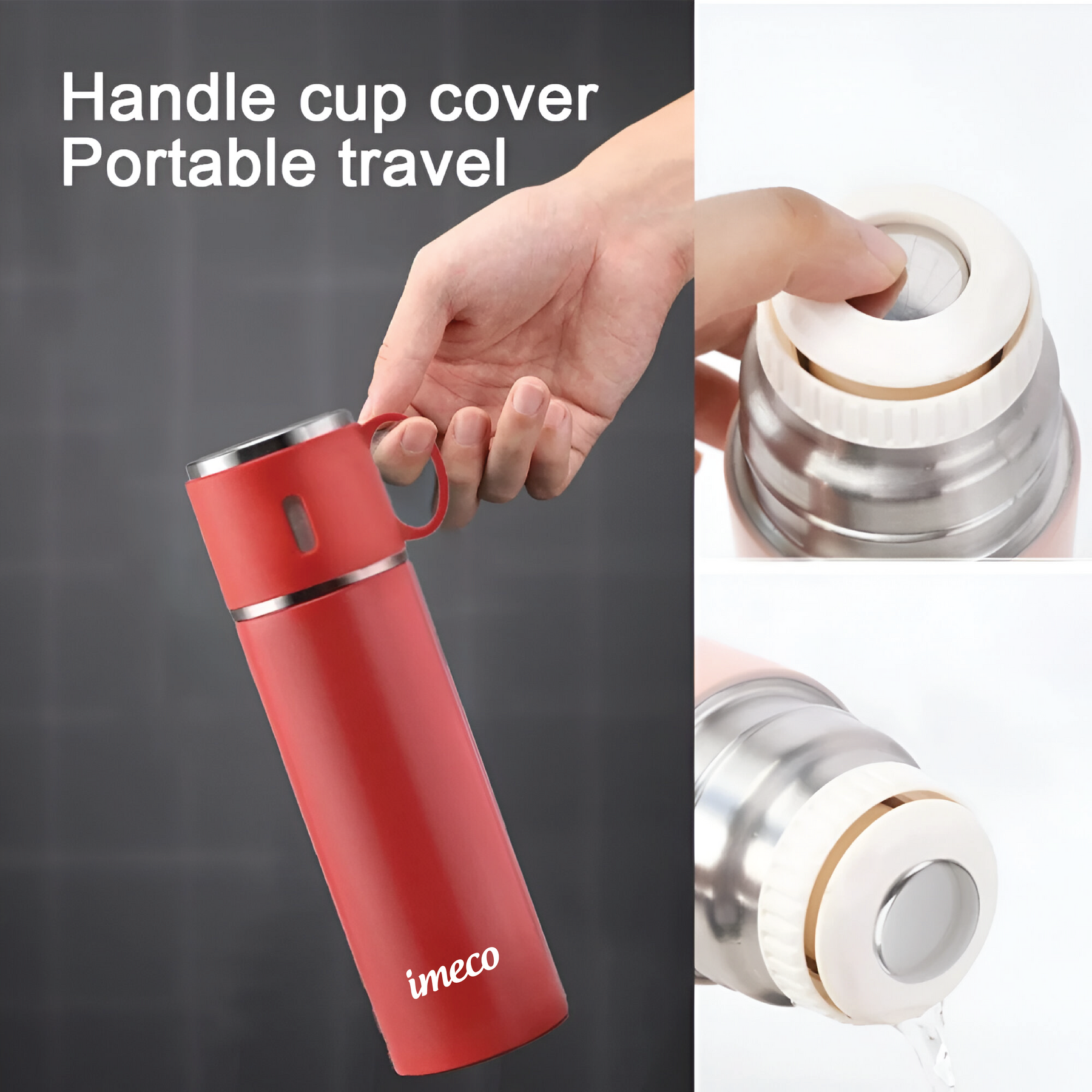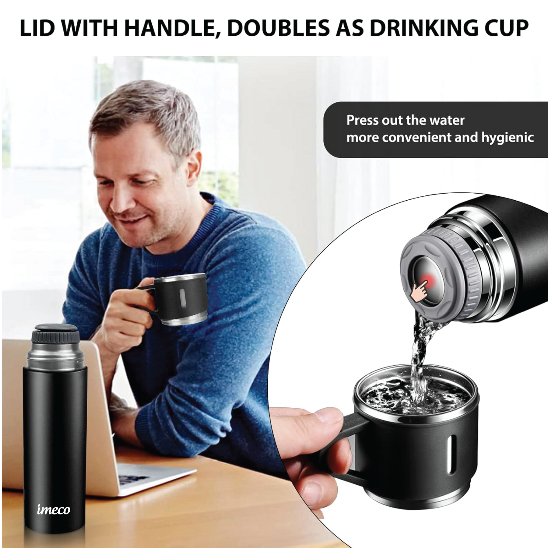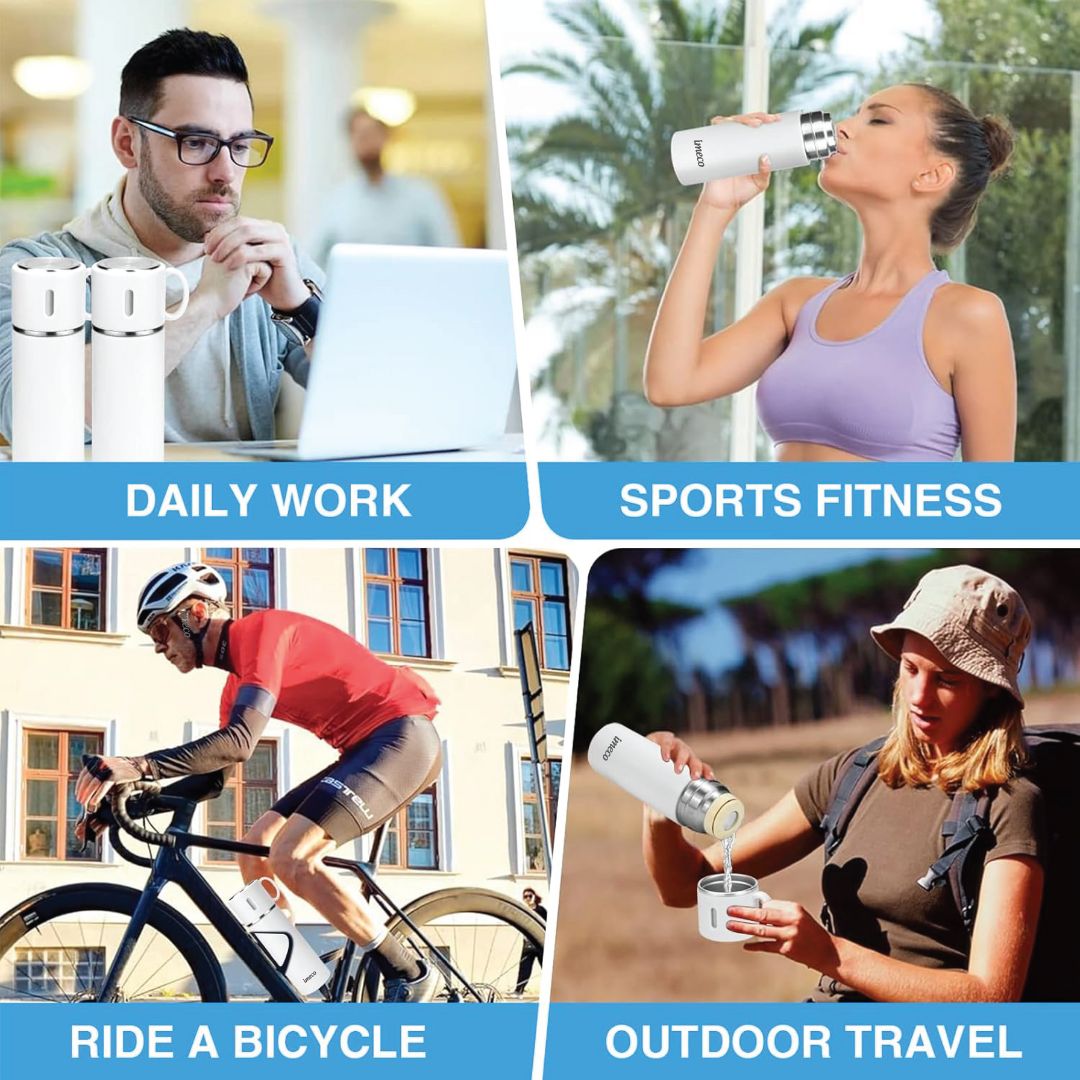The IMECO Premium ECO-FLASK Water Bottle combines sustainability and durability with its double-wall vacuum insulation and food-grade stainless steel construction, keeping drinks hot or cold for over 12 hours. Its convenient teacup lid, non-slip silicone base, and leakproof design make it ideal for hiking, camping, and commuting. With a sleek matte finish and 500 ml capacity, it easily fits in purses and cup holders. Perfect as a travel companion or a stylish, eco-friendly gift, the IMECO ECO-FLASK is the ideal solution for staying hydrated while reducing single-use plastics. Stay refreshed, with IMECO. Outstanding Temperature Retention: Enjoy your beverages at the perfect temperature for hours. With advanced double-walled insulation, hot drinks stay hot for up to 8 hours, while cold drinks remain chilled for 12 hours, making it ideal for any occasion.