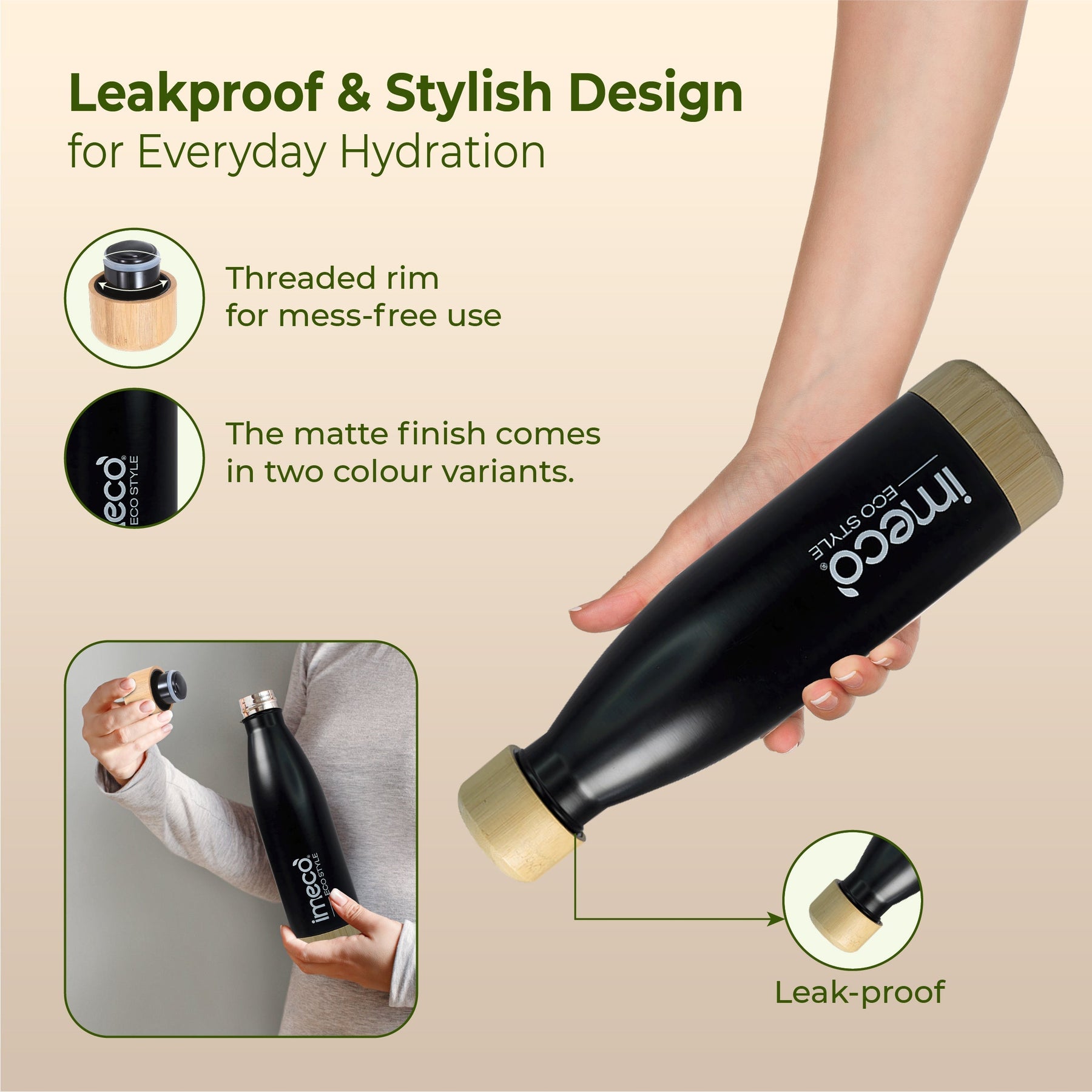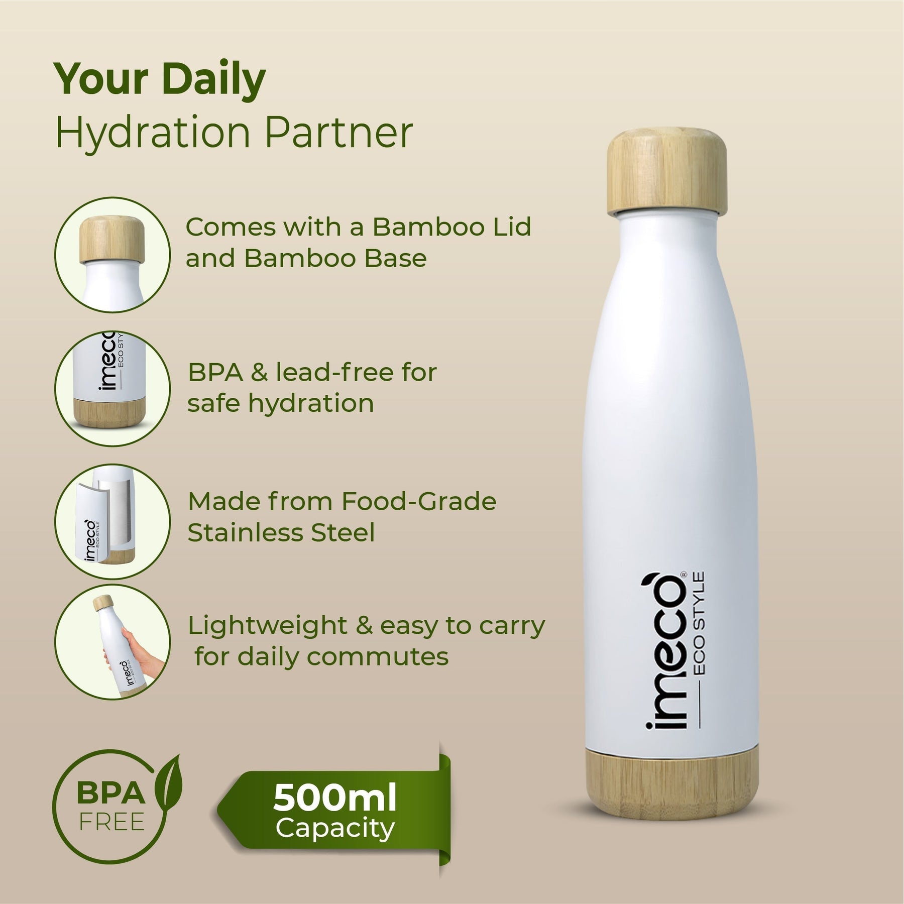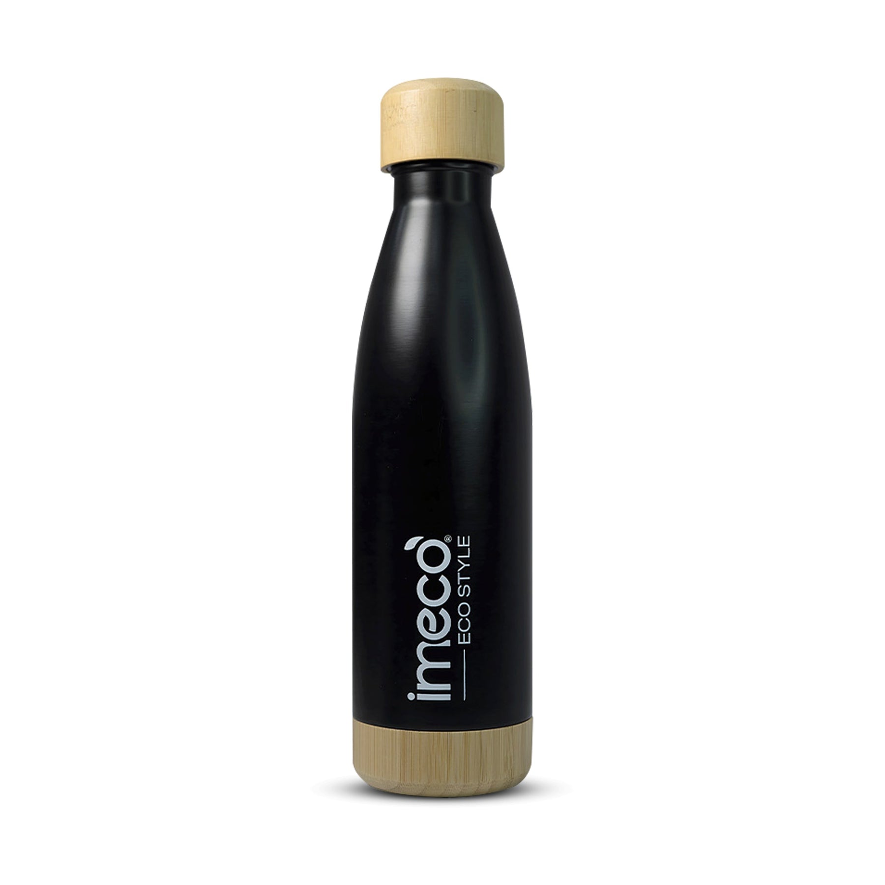 IMECO ECO STYLE Stainless Steel Water Bottle with Bamboo Base – 500 ml | BPA-Free, Leak-Proof & Travel-Friendly | Food-Grade Steel, Lightweight & Eco-Friendly for Office, School & Gym