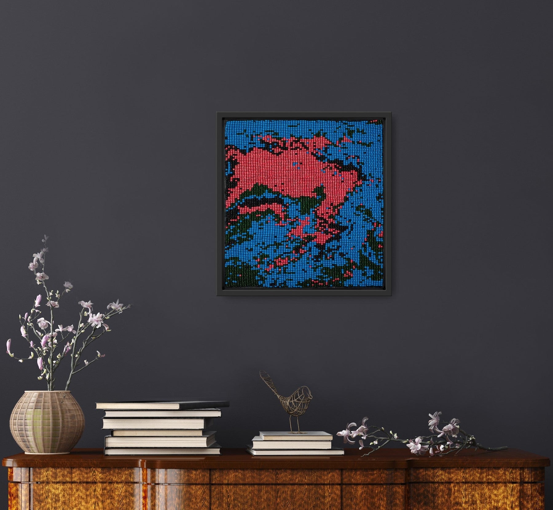 About the Collection: Handwoven on simple wooden looms by artisans in Bhavnagar, Gujarat, this piece embodies India’s fading bead-loom tradition. Tiny glass beads are woven into intricate patterns inspired by nature and geometry, preserving a craft once used to create torans that symbolized welcome and good fortune. Each artwork tells a quiet story — a meditative play of texture, light, and patience.