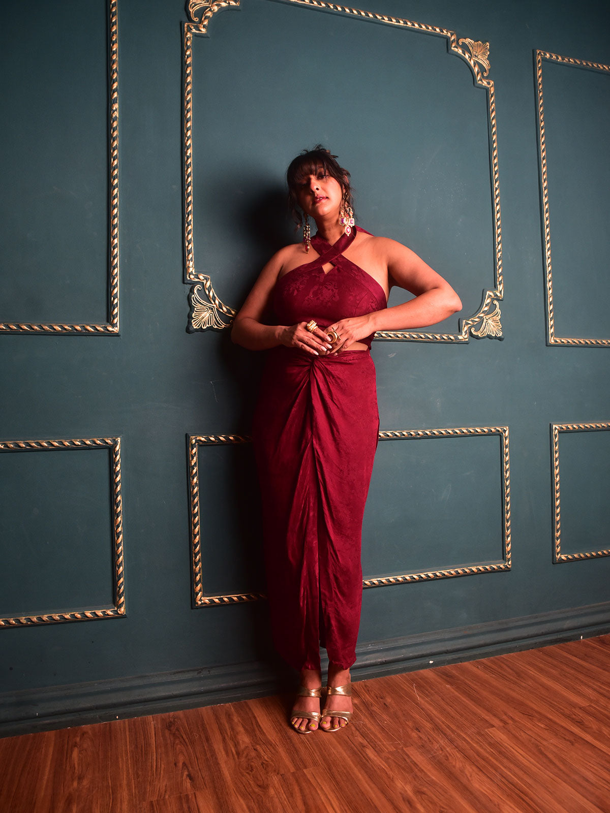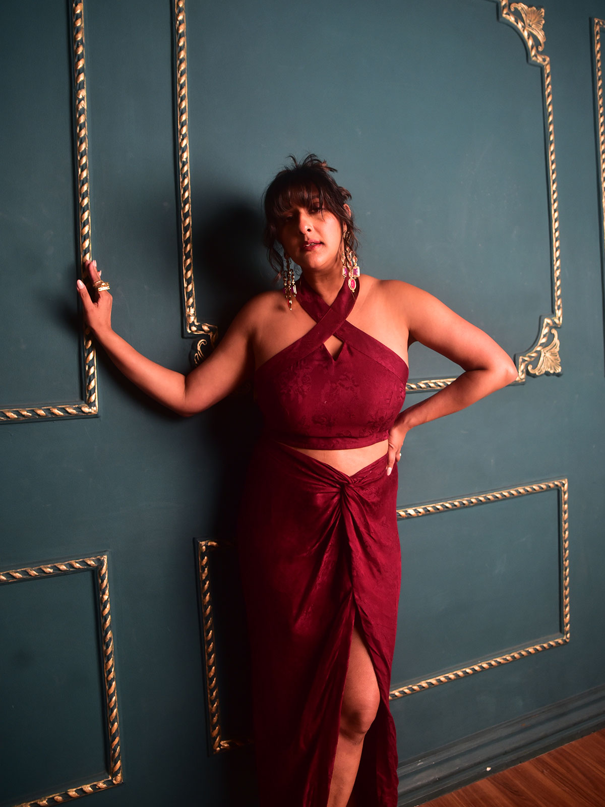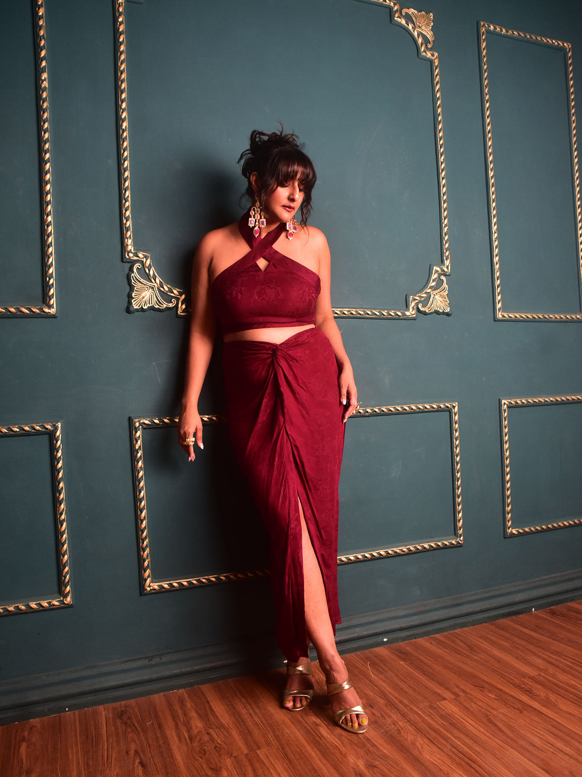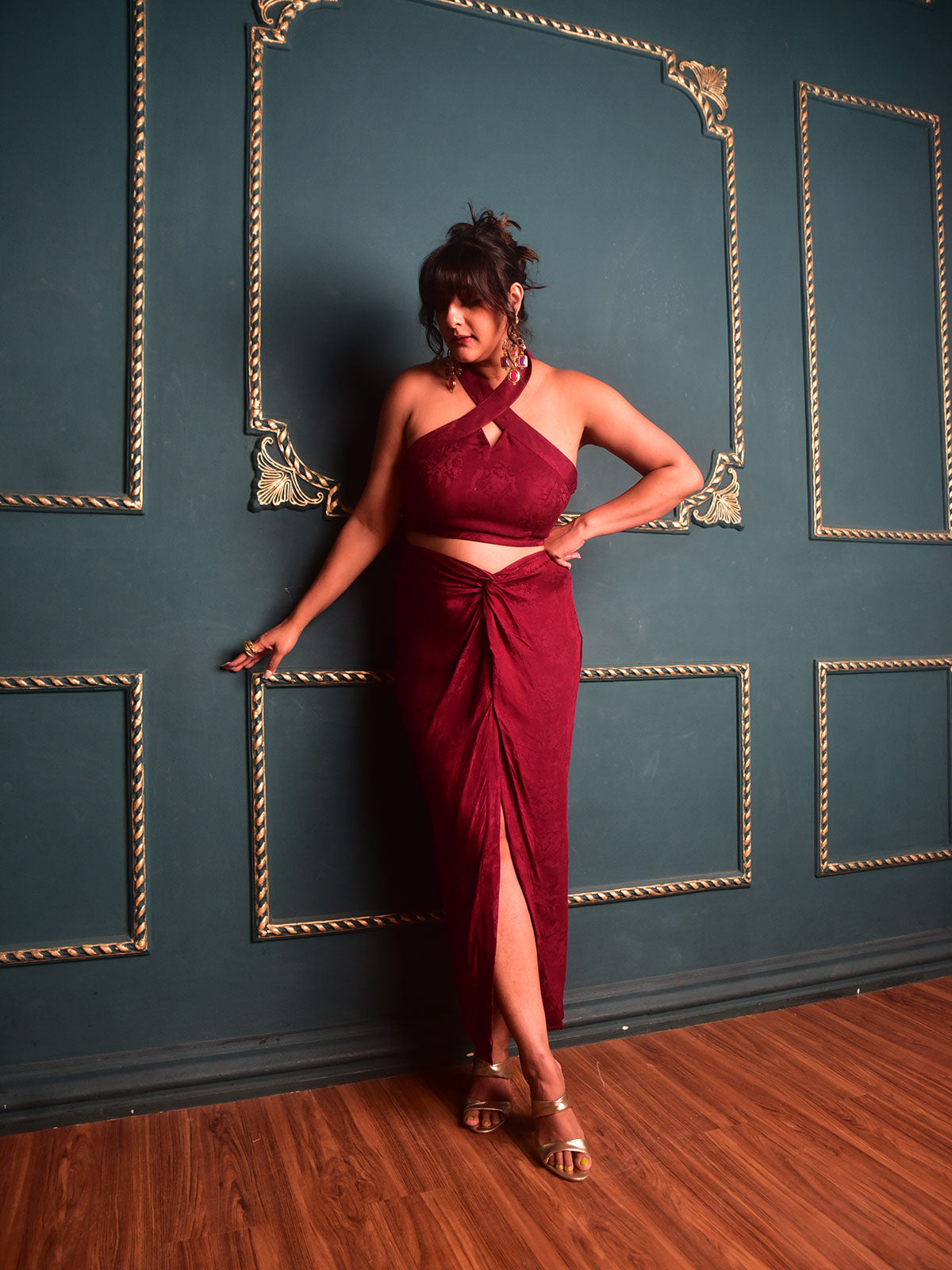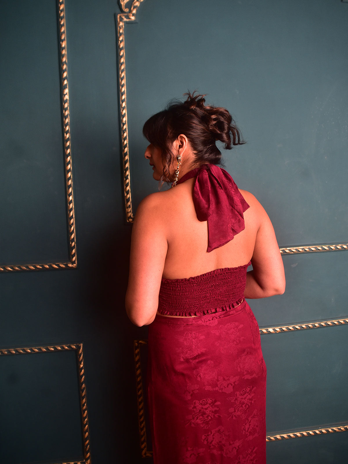 A halter neck blouse to pair with sarees, skirts and everything in between. Cut in our exclusive rich maroon viscose modal jacquard fabric, with a woven pattern and elevated sheen a classic cross-tie up halter neck top with a smocking detail at the back.