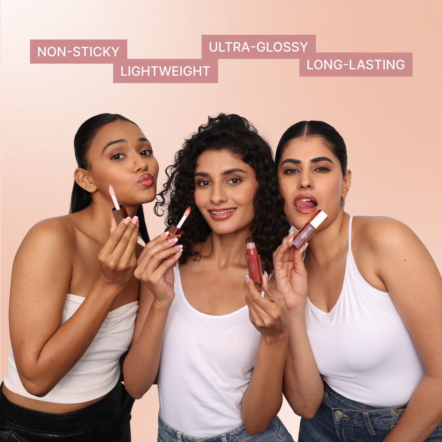 Glow big with Talk Glossy To Me Shimmer Lip Gloss — your one-swipe secret to glossy & pouty lips. This ultra-glossy formula gives a crystal-like shine with a sheer shimmer tint, all in a lightweight, non-sticky finish. Powered by Crystal Bubble Tech, it delivers a mirror-like shine and an instant fuller look that lasts longer. With Hyaluronic Acid and Collagen, it deeply hydrates, smooths, and improves elasticity so your lips feel as good as they look. Vegan. Paraben-free. Clean. Plus, a chubby doe-foot wand for effortless application — it’s shine, care, and comfort in every swipe. Whether you’re running errands, hustling through a 9-to-5, or touching up for a night out, this gloss is your go-to glam buddy. Quick, easy, and fuss-free. Need to add slay.