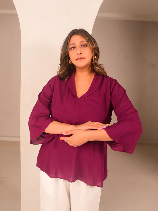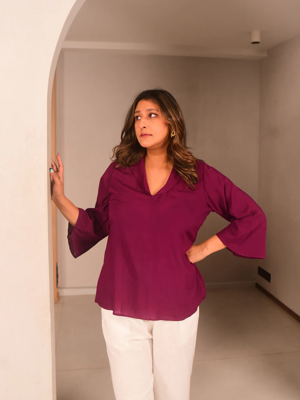 Crafted in our dark purple modal cotton, the Isa Top features a distinctive flap detail at the V-neckline, relaxed silhouette, and high-low bell sleeves for movement and elegance. Its mid-length sleeves offer seasonless wearability, making it a stylish layering piece. Tuck into high-waisted pants  or pair with structured skirts for a polished office look. Ideal for team meetings, creative brainstorms, or casual work-from-home days.