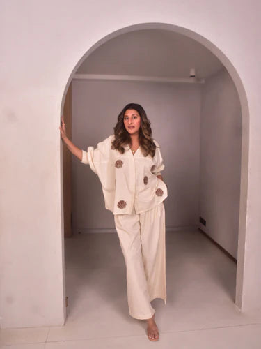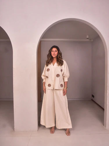 An oversized cotton linen shirt with smocked cuffs and delicate embroidered appliqués, the shirt combines ease with refinement. Perfect for artful travel days or creative meetups, it’s effortlessly chic. Style it with tailored shorts or our flared pants in the same fabric and sneakers for a relaxed yet polished look.