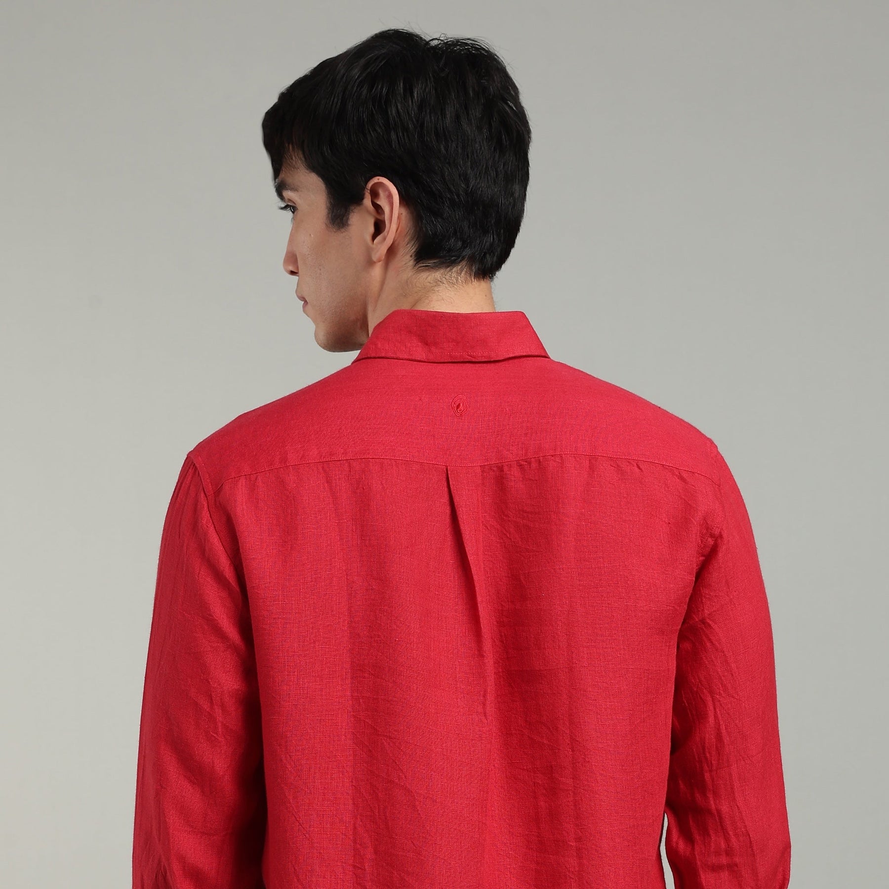 Man wearing a red linen shirt sitting on a chair against a gray background