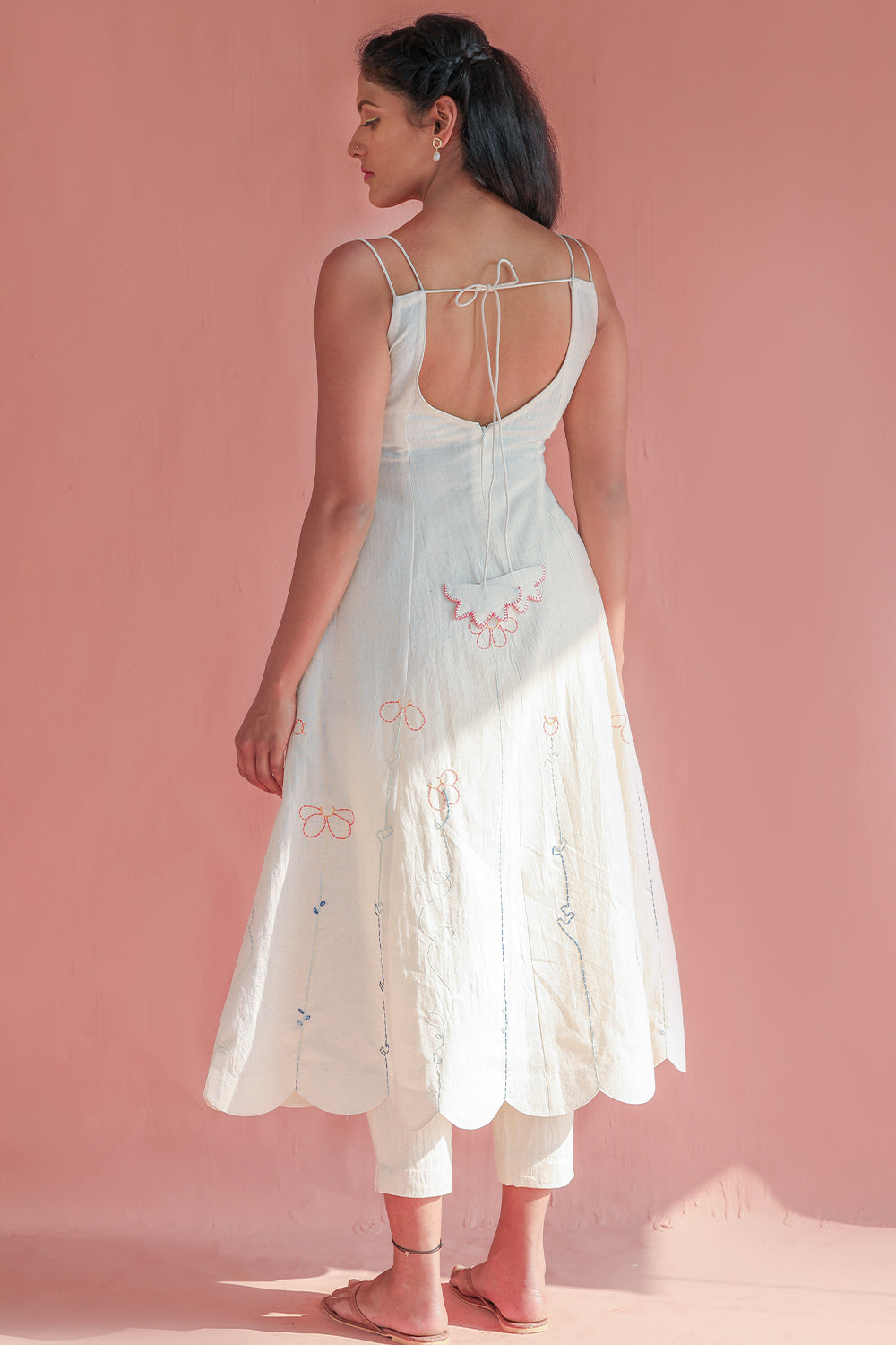 Handwoven Kora-Khadi Boat neck Manipulated stylelines Front side slit Hand embroidered flare hem with contemporized daisies Low back with dori tie-up and zipper fastening Embroidered tassels Side pockets Curved hem Length 47 inches Model is 5’6” and wearing size S Important Note : All our products are purely handcrafted with love and care, the colors and prints might vary. Subject to the availability of the colous, prints and fabrics. Image only for reference. No returns or exchange, as all our products are make-to-order or tailor-made to suit your custom body type, size and fit. Shipped in 7-8 working/business days.