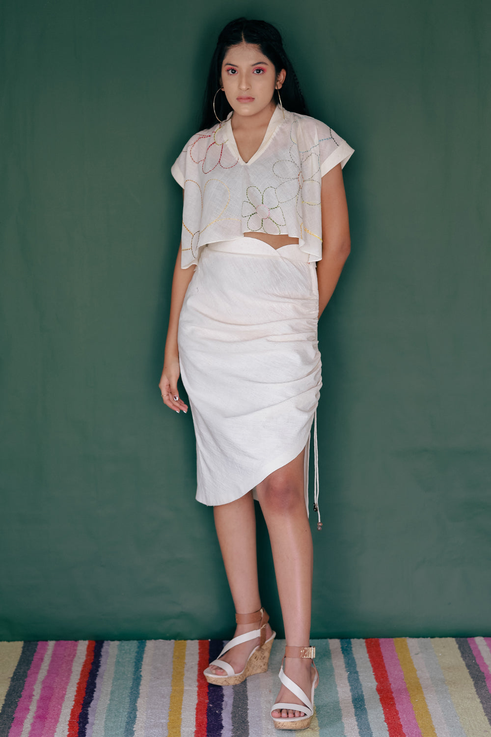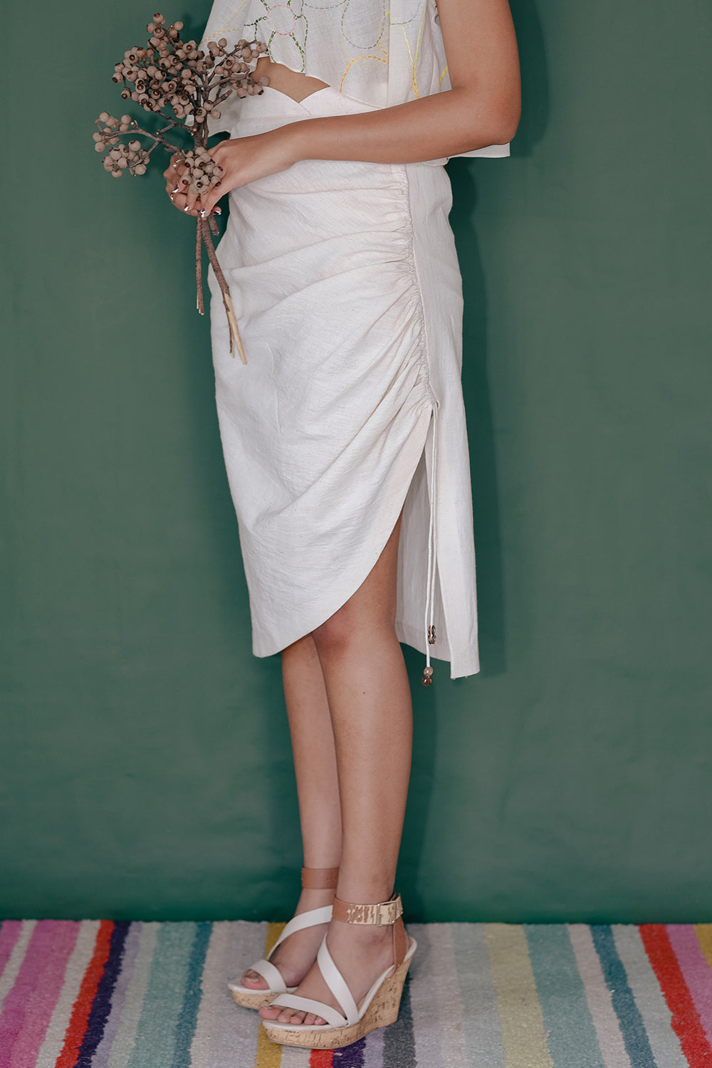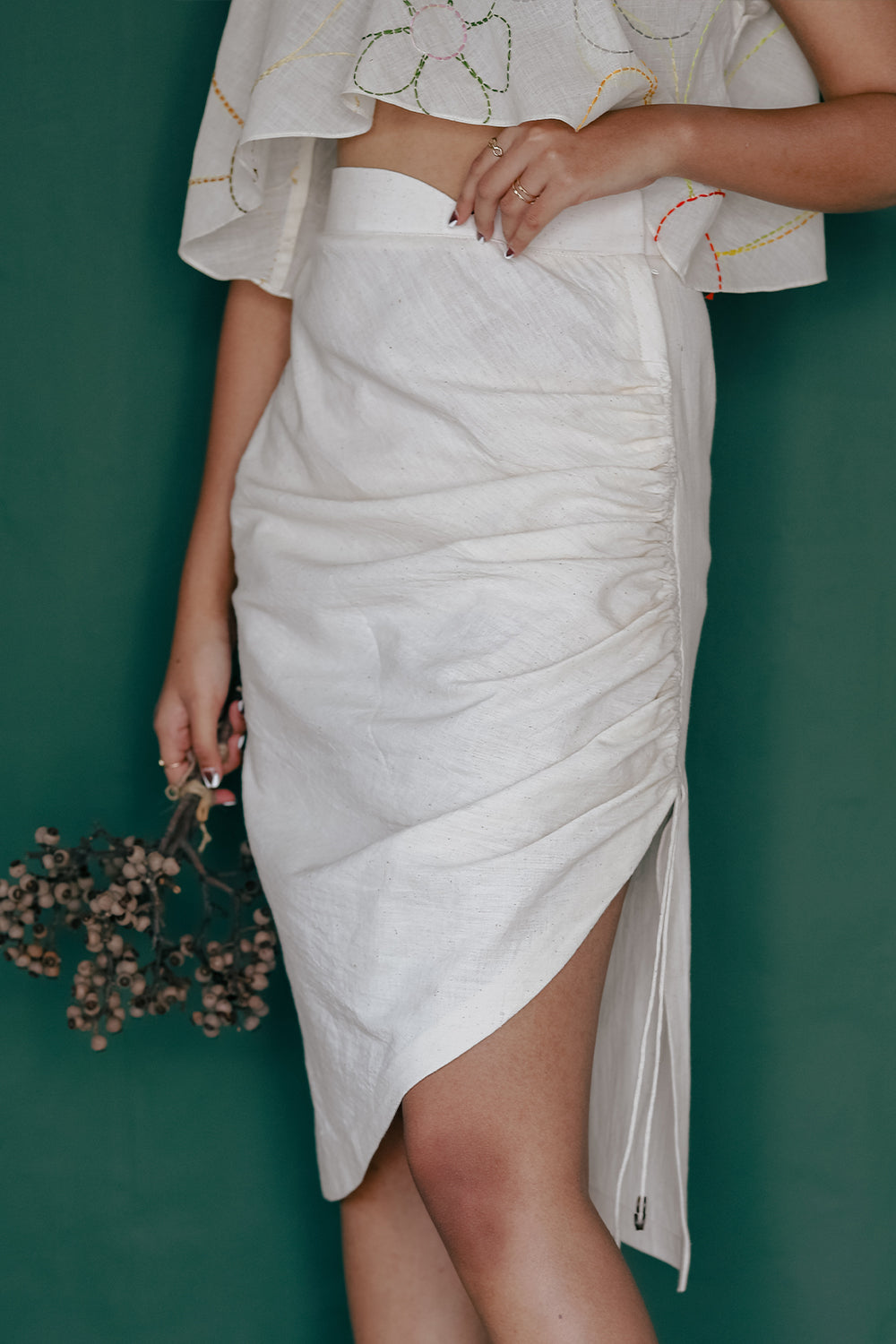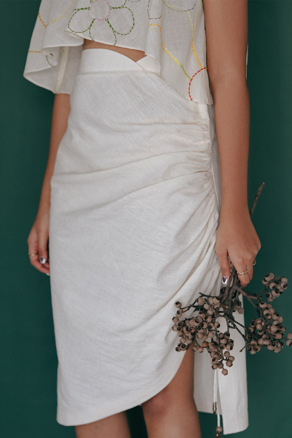 Handwoven Kora-Khadi Slim fit Overlapped belt High waist tea length skirt Gathered front with a tie-up Side zipper fastening Length 30 inches Model is 5’6” and wearing size S Important Note : All our products are purely handcrafted with love and care, the colors and prints might vary. Subject to the availability of the colous, prints and fabrics. Image only for reference. No returns or exchange, as all our products are make-to-order or tailor-made to suit your custom body type, size and fit. Shipped in 7-8 working/business days.