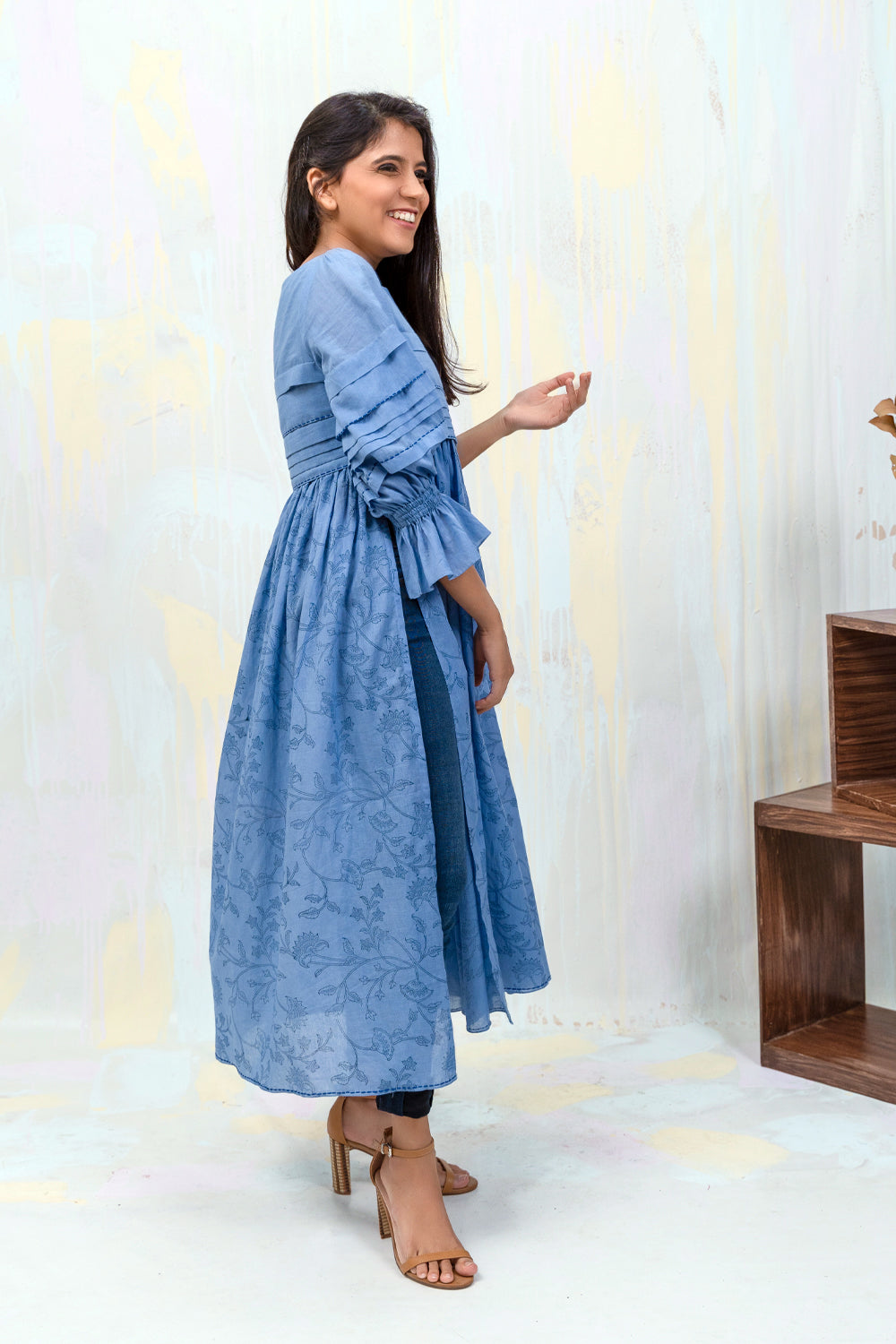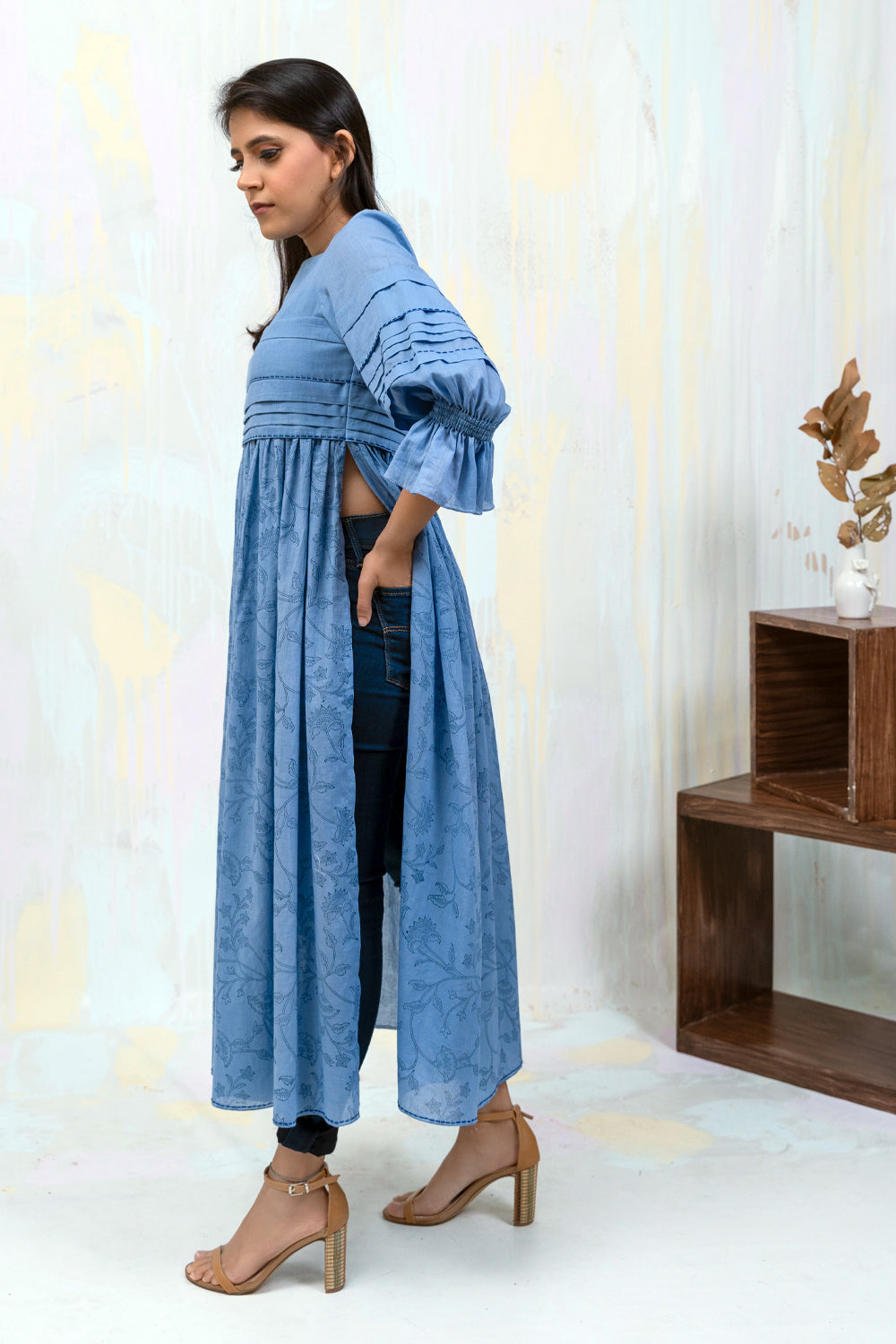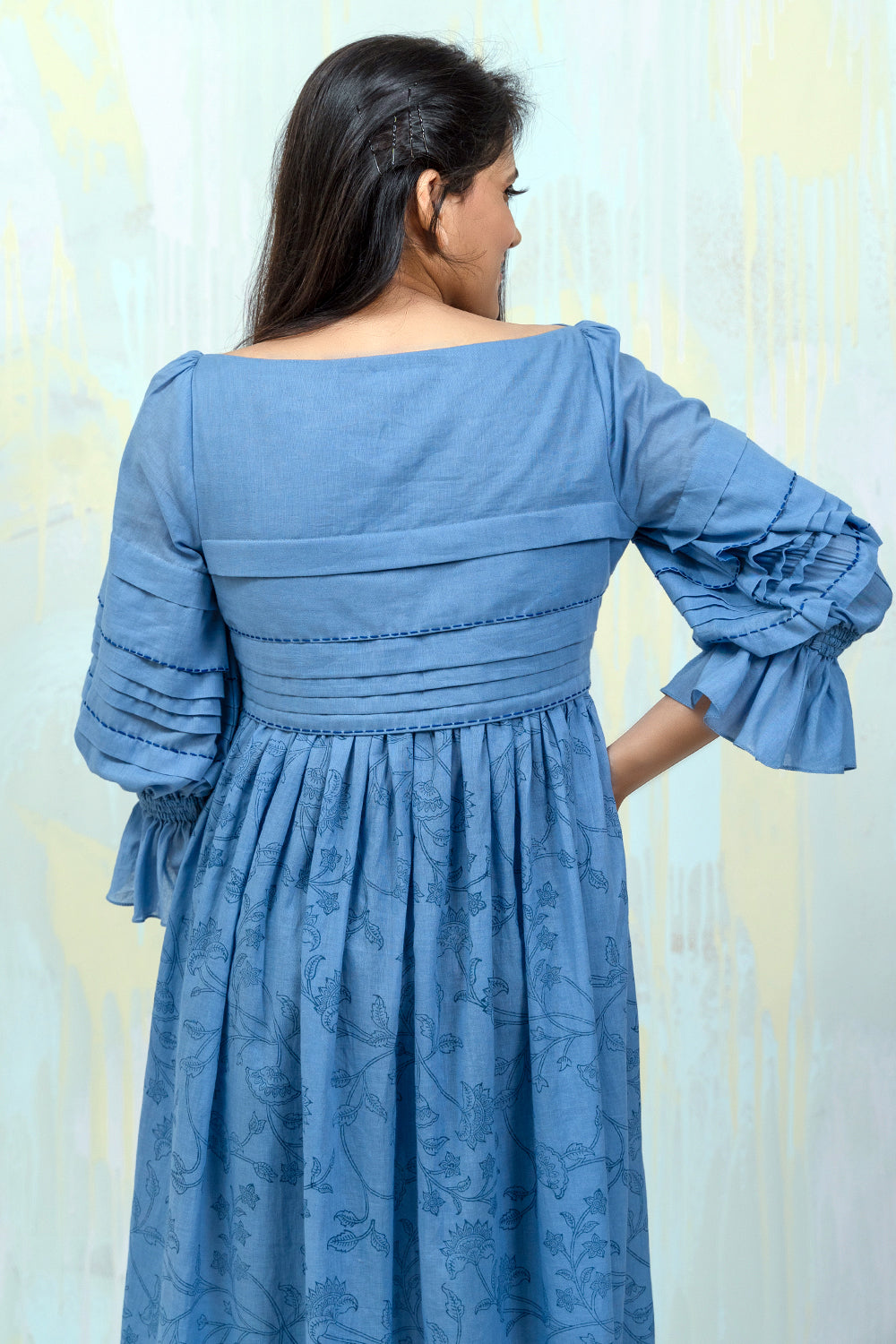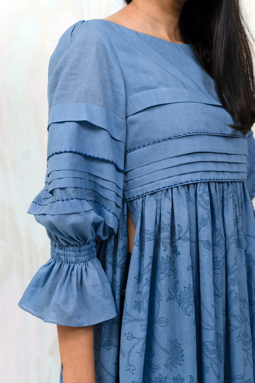 100% mul mul Faded denim Custom made Bagru hand blocked print Regular fit Uneven pleated body and sleeves High side slit Bishop sleeve with pleats Boat neck Threadwork Cold hand wash Length 44 inches Model is 5’1” and wearing size S
