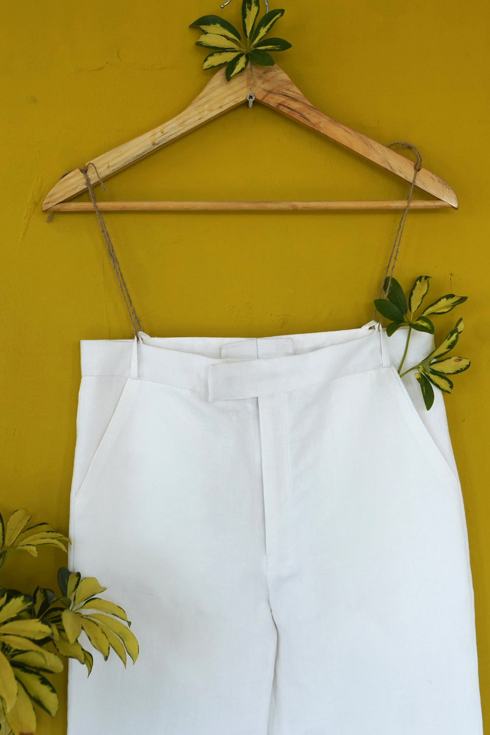 Pure Linen White Slim fit Low waist Ankle length Pleated front Side and back pockets Cold hand wash Length 36 inches Important Note : All our products are purely handcrafted with love and care, the colors and prints might vary. Subject to the availability of the colous, prints and fabrics. Image only for reference. No returns or exchange, as all our products are make-to-order or tailor-made to suit your custom body type, size and fit. Shipped in 7-8 working/business days.