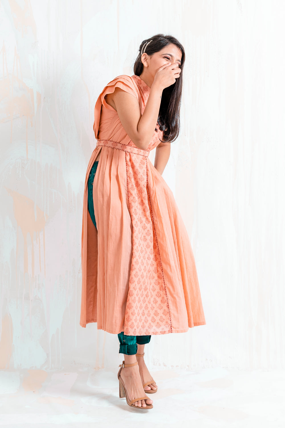 100% mul mul Coral peach Custom made Bagru hand blocked print Slim fit Heavy pleated sides in one piece Back opening with a Chinese collar tie-up and a button Comes along with a belt Side slits Threadwork Cold hand wash Length 44 inches Model is 5’1” and wearing size S