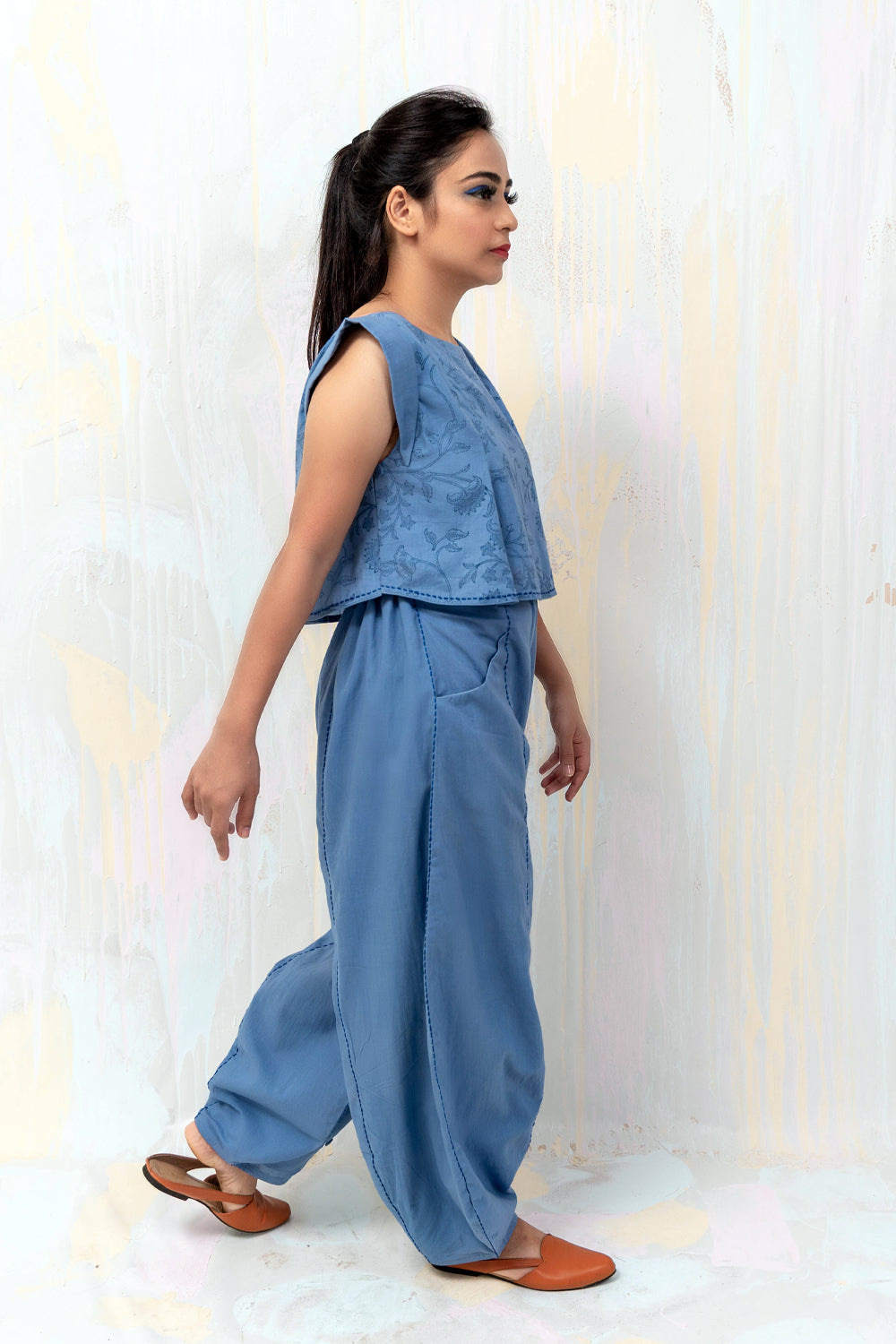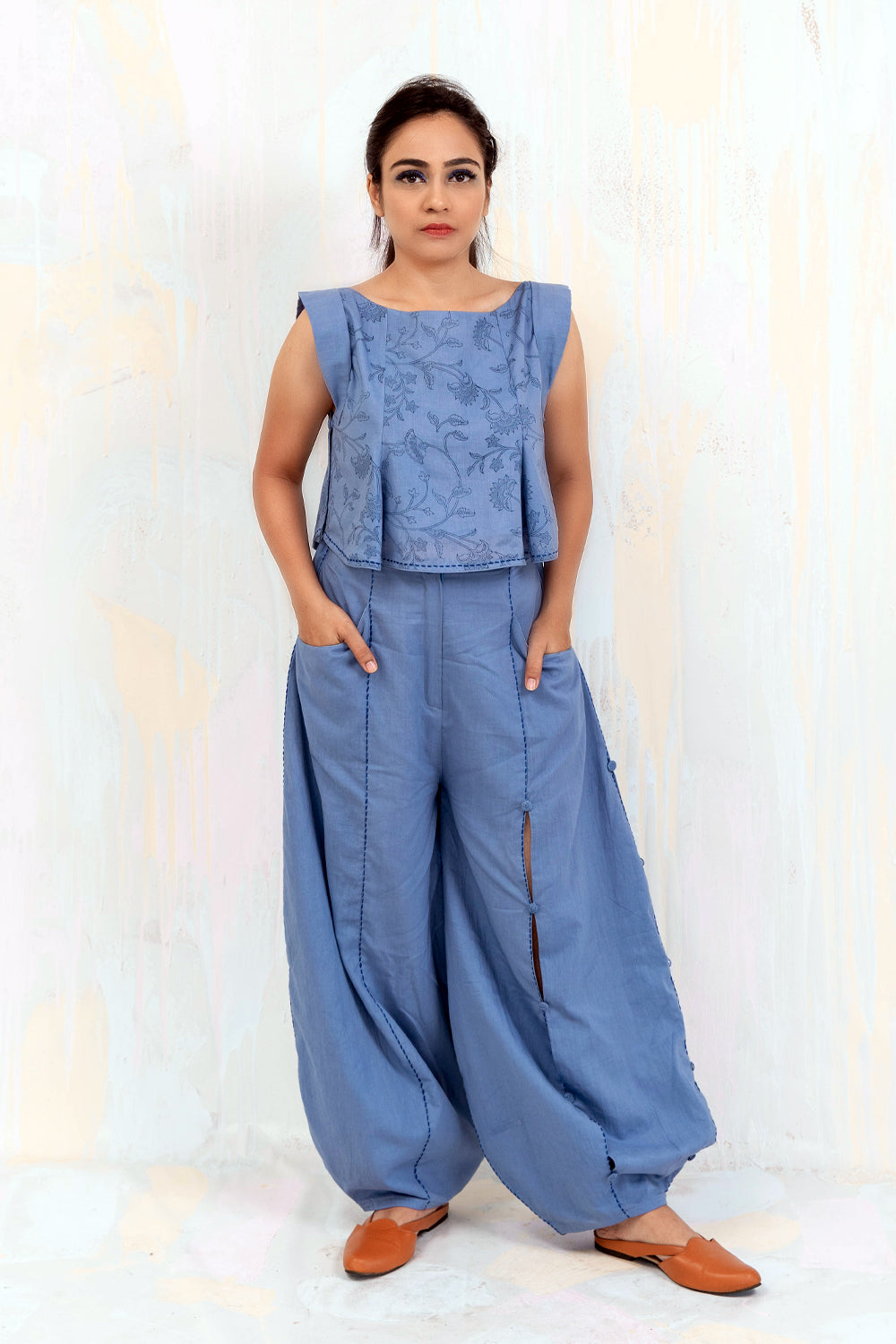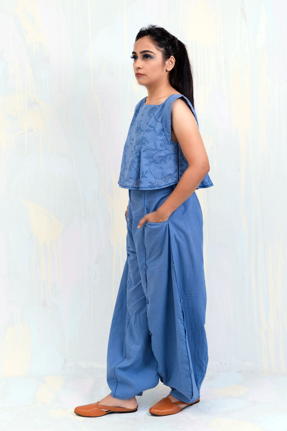 100% mul mul Faded denim Custom made Bagru hand blocked print Relaxed crop Box pleated sleeves Side opening with cloth button and loops Threadwork No darts Cold hand wash Length 14 inches Model is 5’1” and wearing size S