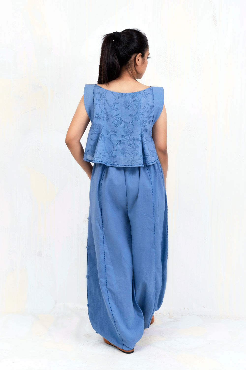 100% cambric cotton Faded blue Relaxed fit Mid rise Front opening Front pockets Elastic at back waist Panelled bottoms with one side printed cloth buttons Threadwork Cold hand wash Length 37 inches Model is 5’1” and wearing size S Important Note : All our products are purely handcrafted with love and care, the colors and prints might vary. Subject to the availability of the colous, prints and fabrics. Image only for reference. No returns or exchange, as all our products are make-to-order or tailor-made to suit your custom body type, size and fit. Shipped in 7-8 working/business days.
