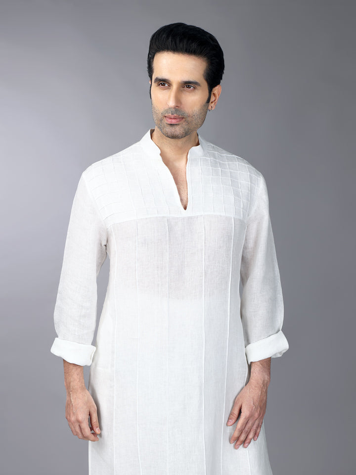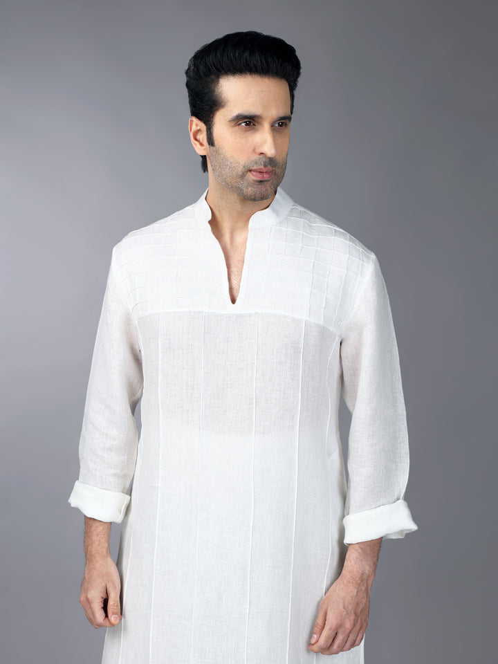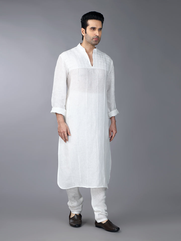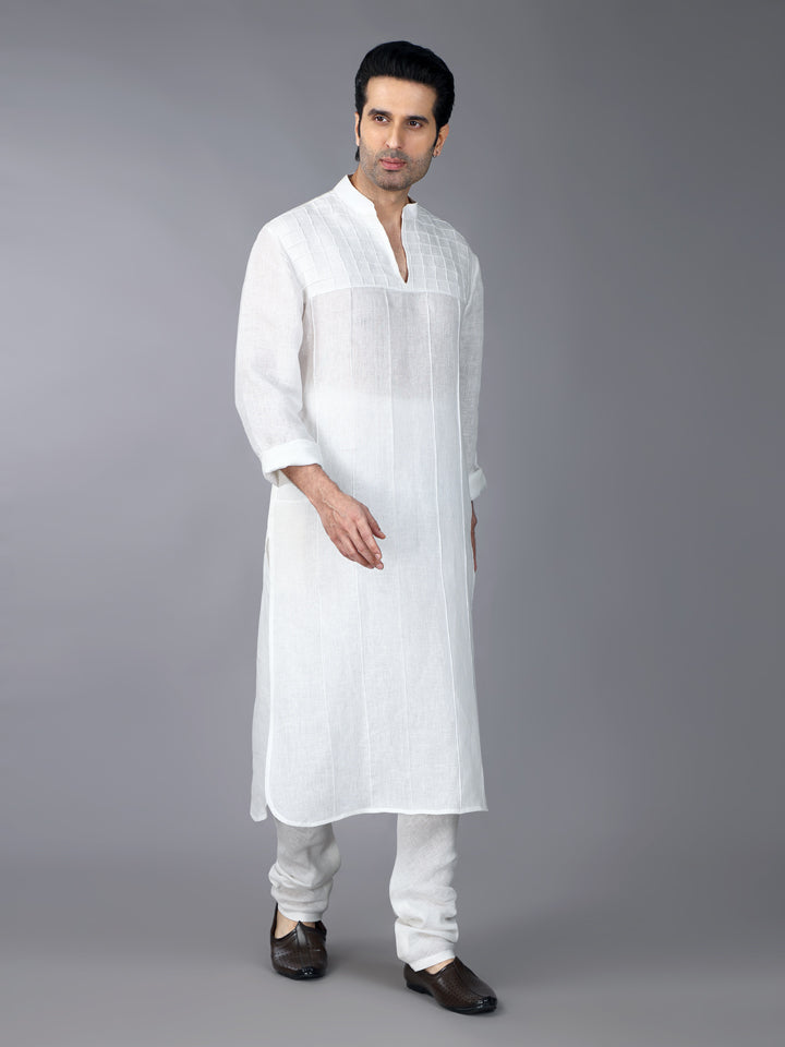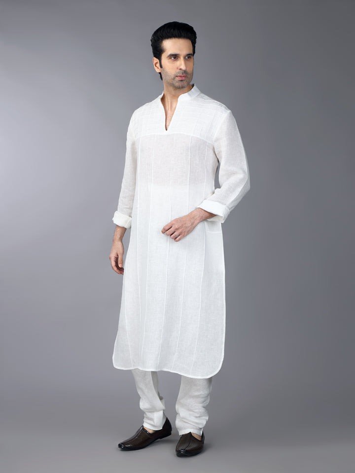 Elevate your traditional wardrobe with this timeless ivory pure linen pintucks kurta set, blending sophistication and comfort effortlessly. Crafted from breathable pure linen, this kurta is designed with fine vertical pintucks, adding a touch of understated elegance to its minimalistic appeal. The straight silhouette, complemented by a mandarin collar with a classic split neckline, offers a refined yet relaxed vibe perfect for any occasion. The full-length sleeves can be styled rolled up for a casual charm, while the side slits enhance ease of movement. Paired with matching ivory linen churidar bottoms, this set is a versatile pick for festive gatherings, summer weddings, or casual celebrations. Style it with traditional mojaris or contemporary loafers for a dashing look. Feel cool, confident, and effortlessly classy in this versatile kurta set, a must-have for any modern man embracing tradition with a contemporary twist!