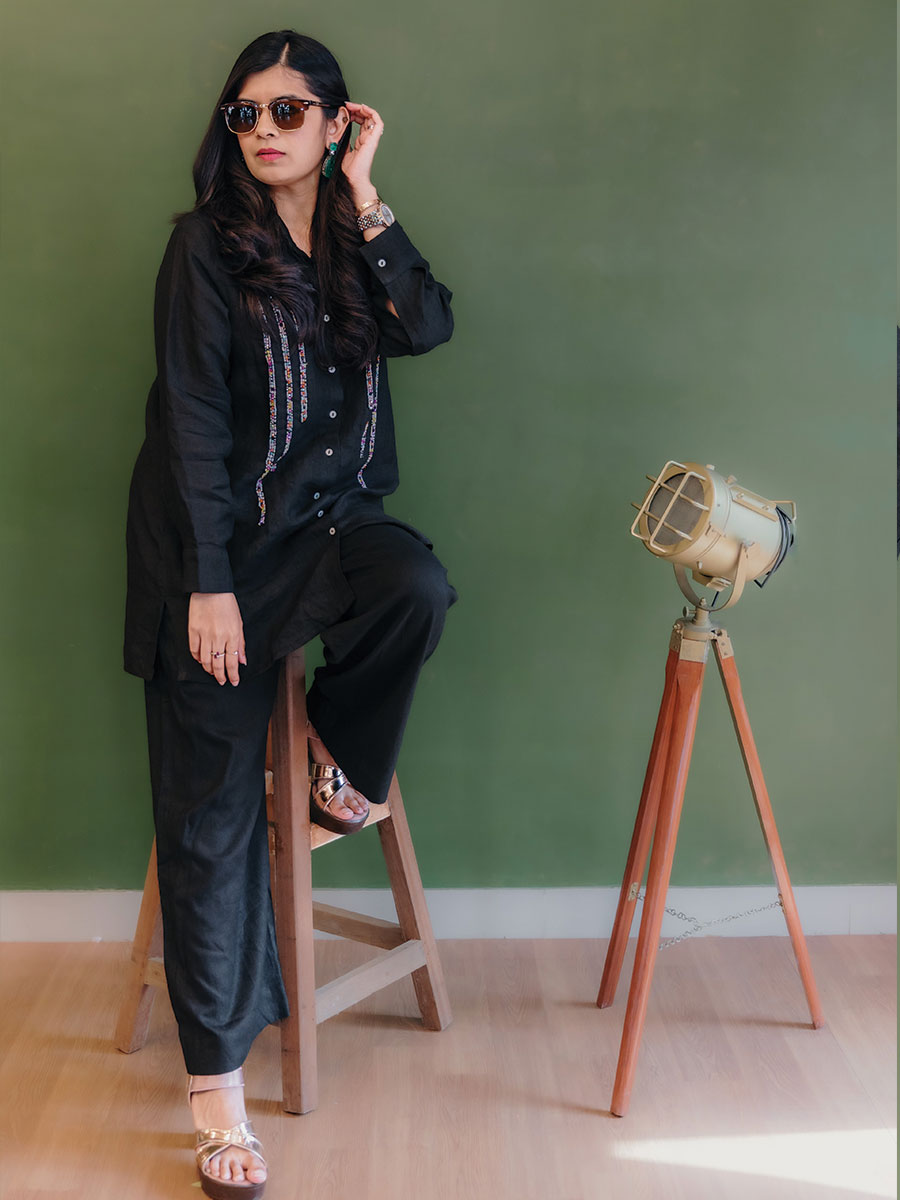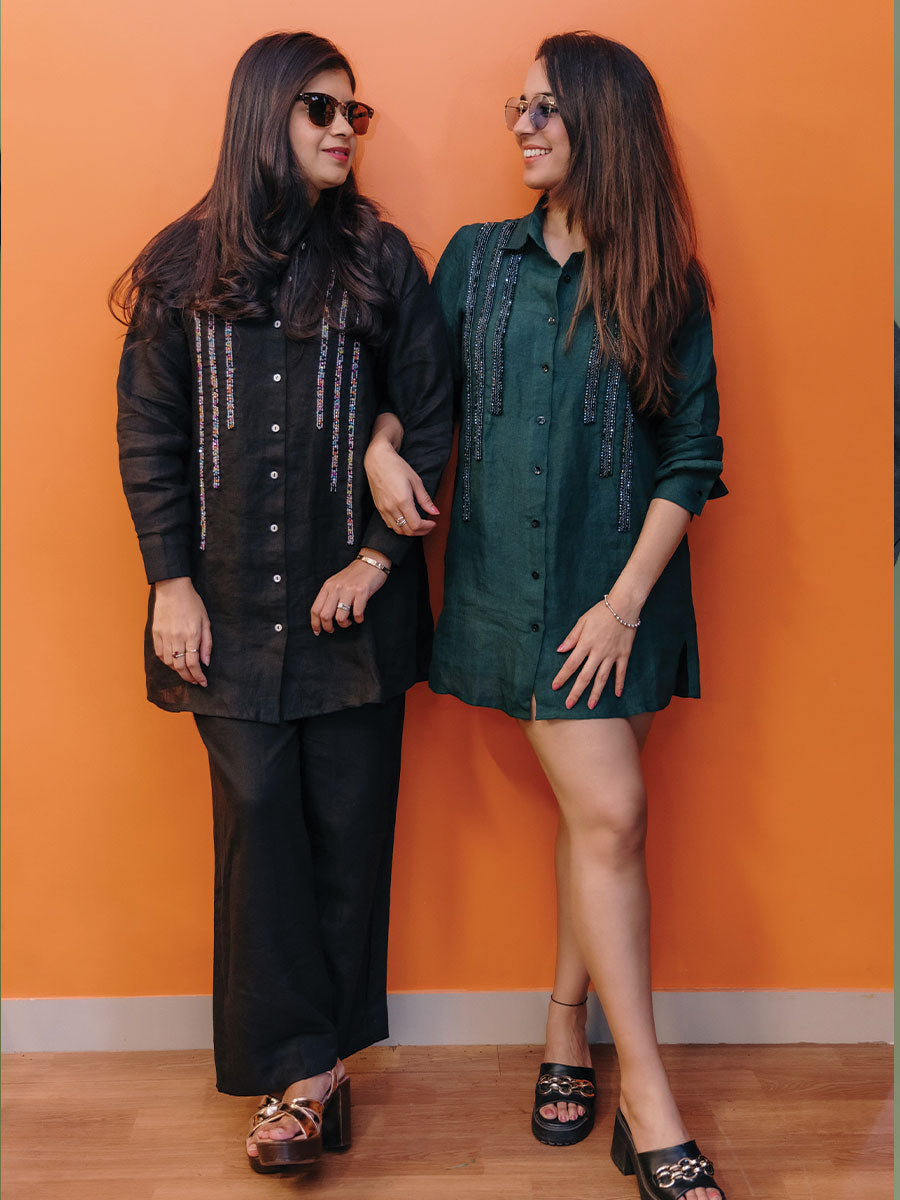 Understated bling meets timeless black in the Jashn Linen Tunic — a celebration-ready silhouette designed for comfort with just the right dose of drama. Crafted in rich black linen, this longline shirt-style tunic features subtle metallic embellishments along the front placket, adding sparkle without shouting.