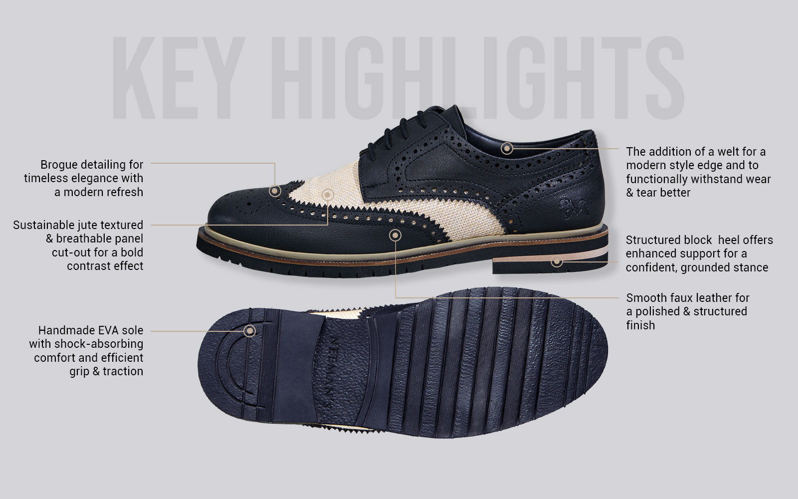 Presenting our most complete dress shoe yet - The Jute Dress Oxfords. Here’s why! That bold jute-textured cut-out? Its eco-friendly flair makes a statement without screaming for attention. The traditional brogue detailing? A hallmark of premium craftsmanship. What about the sturdy heel? A modern style edge to own every room. And the handmade sole with welt? Decorative, with ample cushioning, grip & traction. Rock them in classic grey, brown, or black. Once you’ve laced them on, you’ll get exactly what we mean.