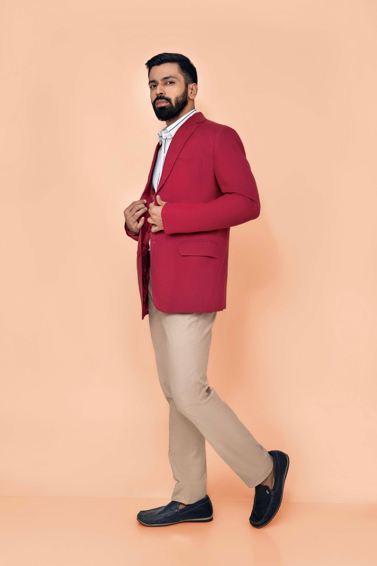 • This model Mihir in a crimson red blazer is 5'09'' tall and has 102cm (40") around the chest and 74 cm (29") around the waist and wears an M-Medium and model Ambuj in Green, blue and black blazer is 6'01'' tall and has 107cm (42") around the chest and 79 cm (31") around the waist and wears an L-Large.
