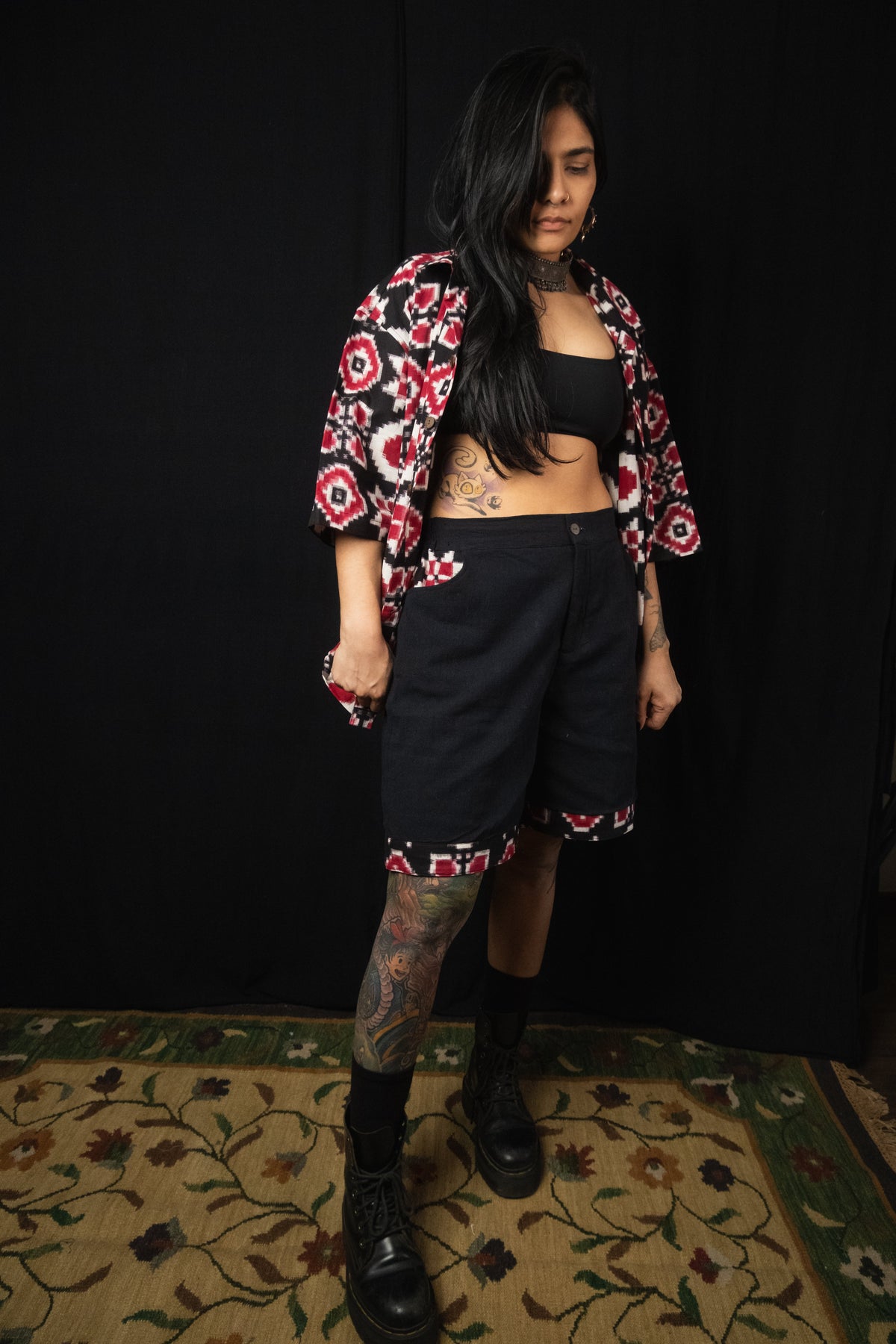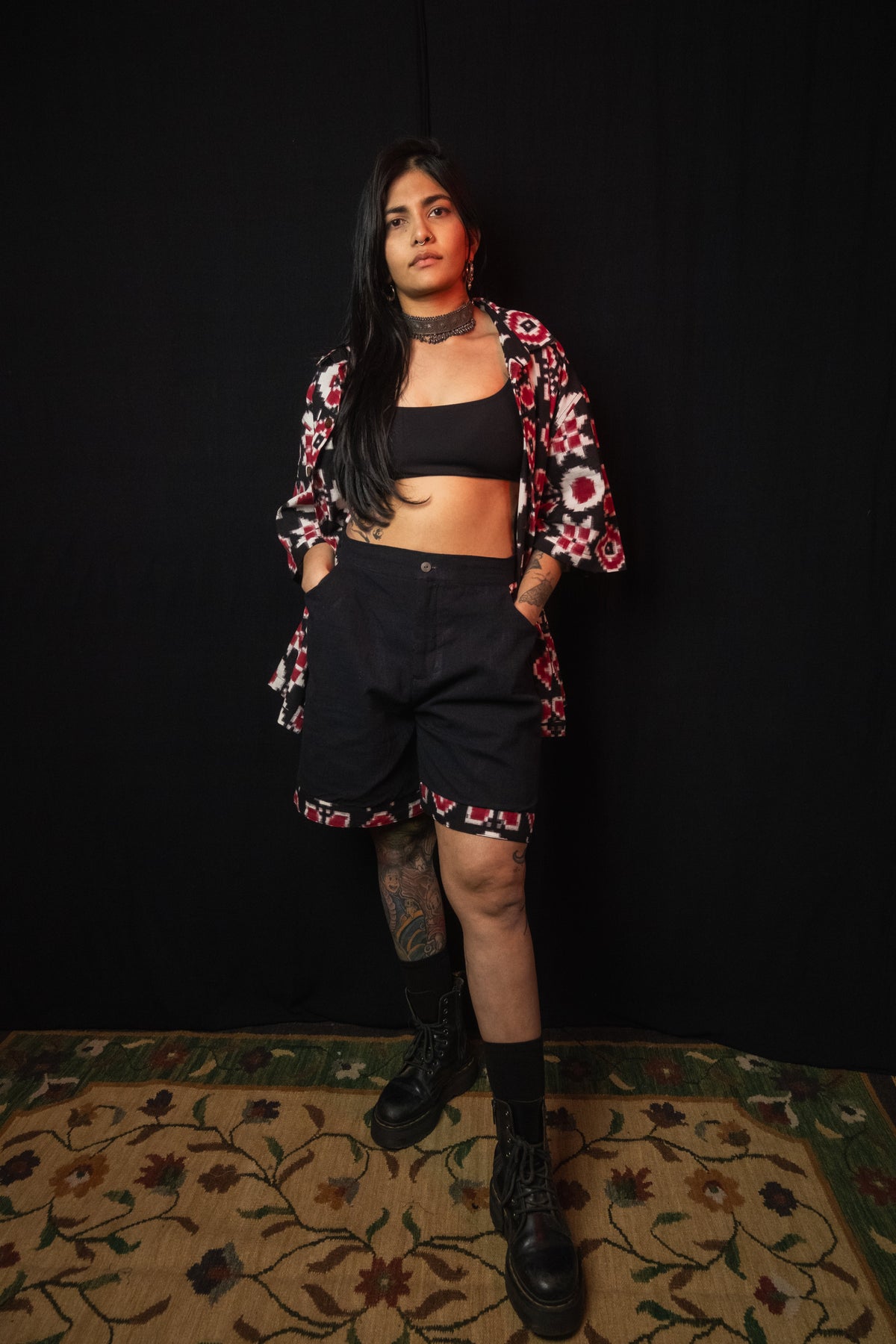 Meticulously handwoven and dyed by artisans from Telangana. From a relic to contemporary clothing, this piece seamlessly merges the rich tradition of Telia Ikat with urban apparel,making it a must-have for those who appreciate both culture and style.