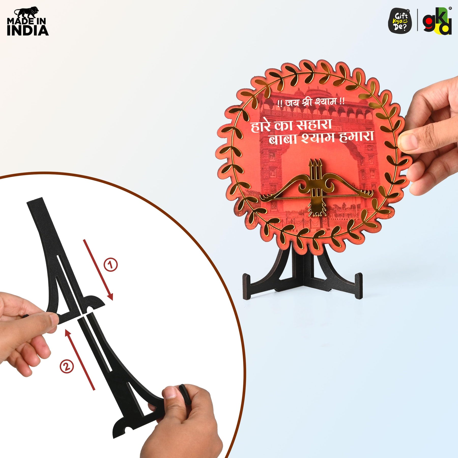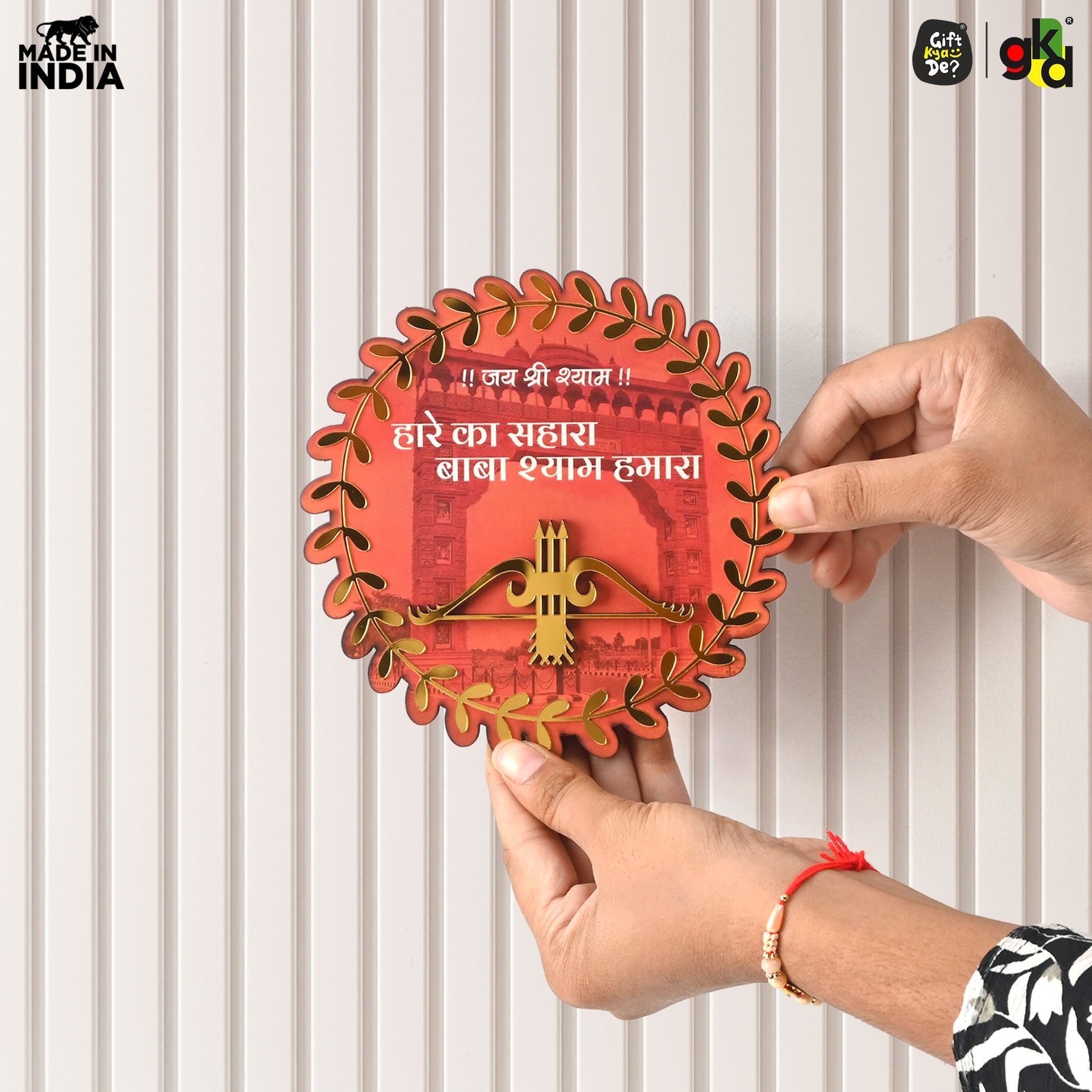 • Divine Khatu Shyam Ji Design – Beautifully crafted round wooden frame with “!! जय श्री श्याम !! हारे का सहारा बाबा श्याम हमारा” inscription, bringing positivity and devotion.