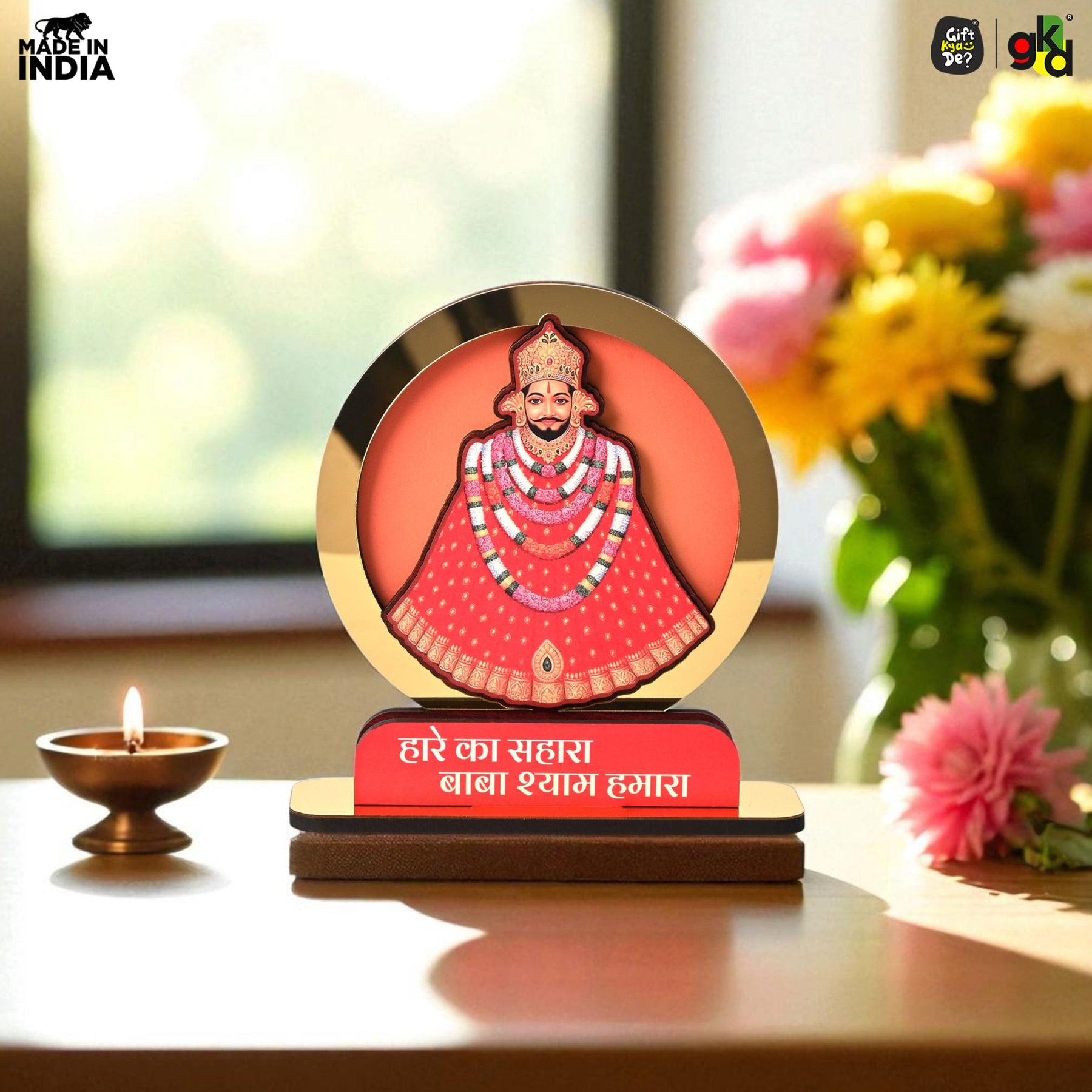 •  Spiritual Desk Showpiece – Beautiful Khatu Shyam Ji idol with the sacred quote “हारे का सहारा बाबा श्याम हमारा”, ideal for pooja rooms, work desks, or gifting.
