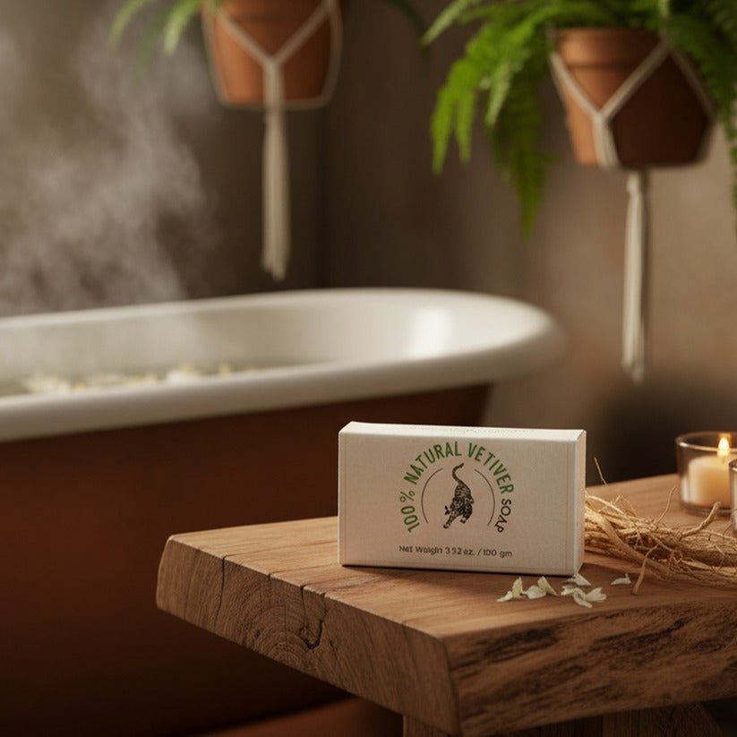 Immerse yourself in the earthy freshness of Vetiver, nature’s cooling and grounding essence. Our 100% Natural Vetiver Soap is handcrafted with pure Coconut Oil and Vetiver Essential Oil to gently cleanse, hydrate, and refresh your skin. Known for its calming aroma and skin-soothing benefits, Vetiver helps restore balance and vitality, leaving your skin soft, supple, and naturally fragrant. Reason To Love Deeply cleanses while preserving natural skin moisture Refreshes and cools the skin with natural Vetiver oil Soothes irritation and supports skin renewal Rich, creamy lather from pure coconut oil Suitable for all skin types, including sensitive skin Ingredients Coconut Oil, Aqua, Sodium Hydroxide, Vetiver Essential Oil How To Use Wet your skin with warm water to open pores.Lather the soap between your hands or on a loofah to create a rich, creamy foam. Gently massage the lather onto your face and body in circular motions. Rinse thoroughly with clean water. Pat dry with a soft towel and follow with your favorite natural moisturizer if desired. Sustainability Factor Made from 100% natural, biodegradable ingredients Plastic-free and recyclable packaging Cold-processed to conserve energy and retain natural glycerin Cruelty-free and vegan — no animal testing or by-products Ethically sourced Vetiver oil supporting eco-friendly farming