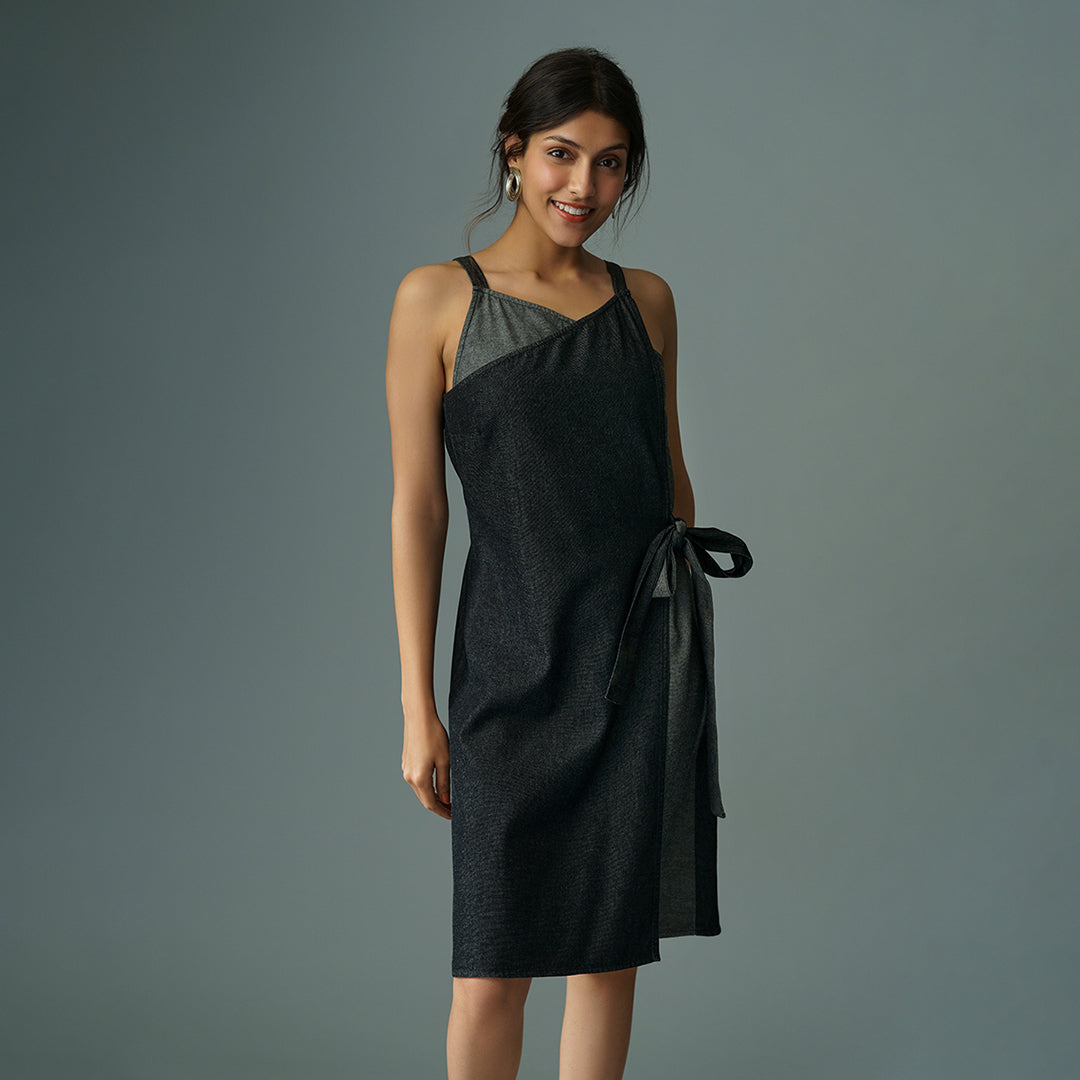 Make a statement with the B77 Eco Denim Colour Block Wrap Dress, designed to combine durable fashion with modern style. Crafted from eco-friendly denim, this knee-length dress features an overlap V-neckline, tie-up details, and contrasting color panels for a chic, contemporary look. The wrap-around design ensures a comfortable fit while adding elegance to your everyday wardrobe. Perfect for casual lunches, dinners, or weekend outings, style it with sneakers or tie-up flats for effortless versatility.