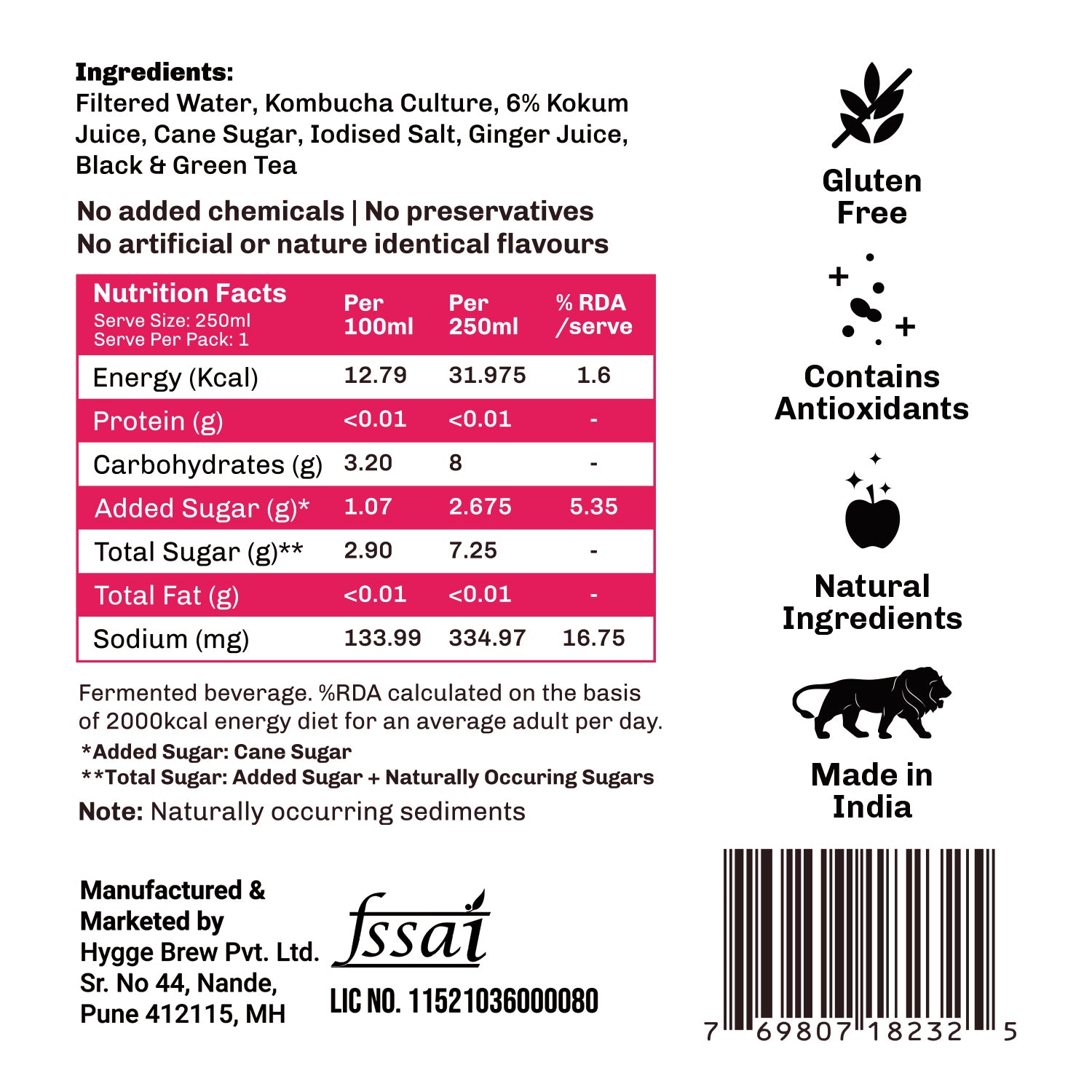 Ingredients: Filtered Water, 3.2 % Kokum Juice, Kombucha Culture, Cane Sugar, Ginger Juice, Salt, Black & Green Tea, Carbon Dioxide