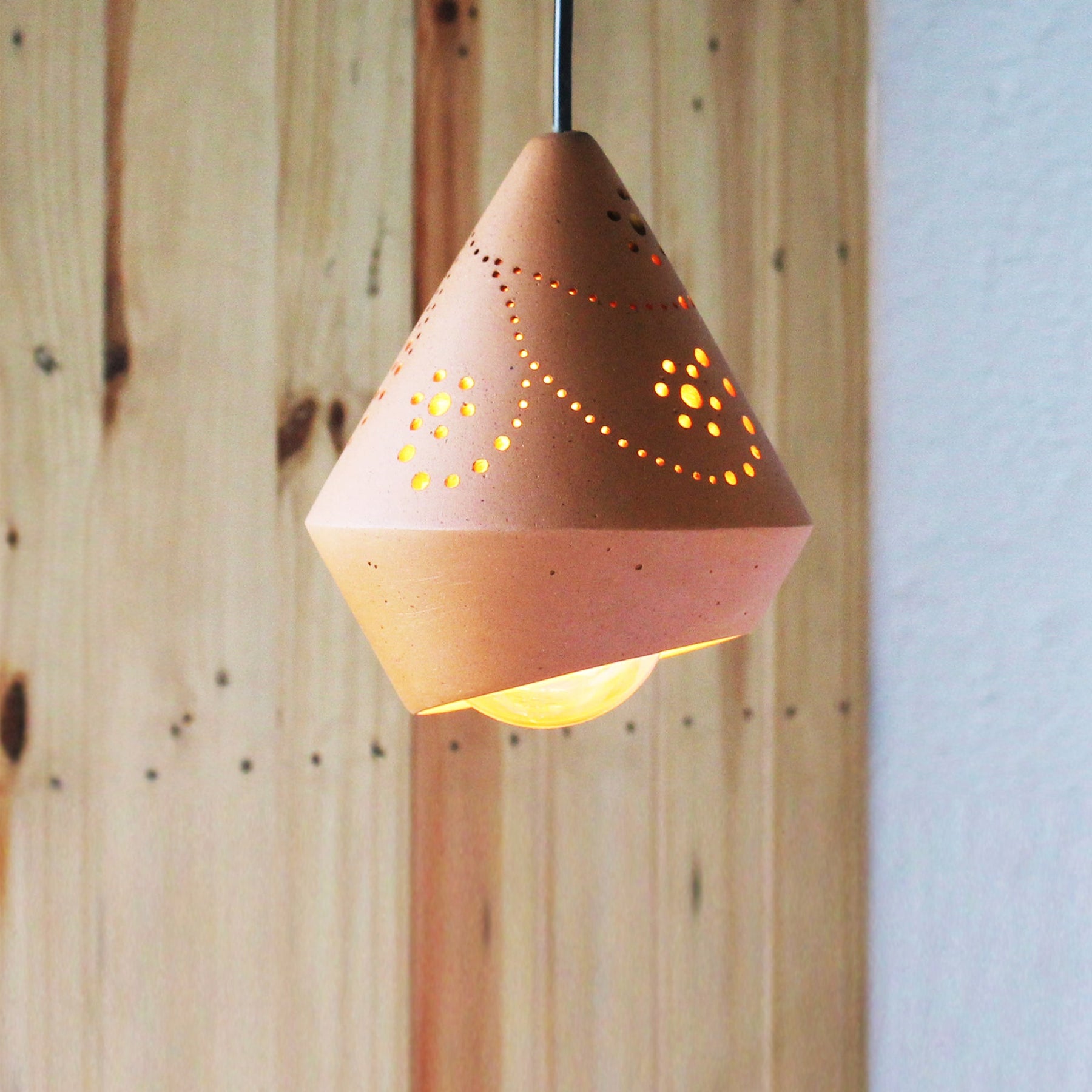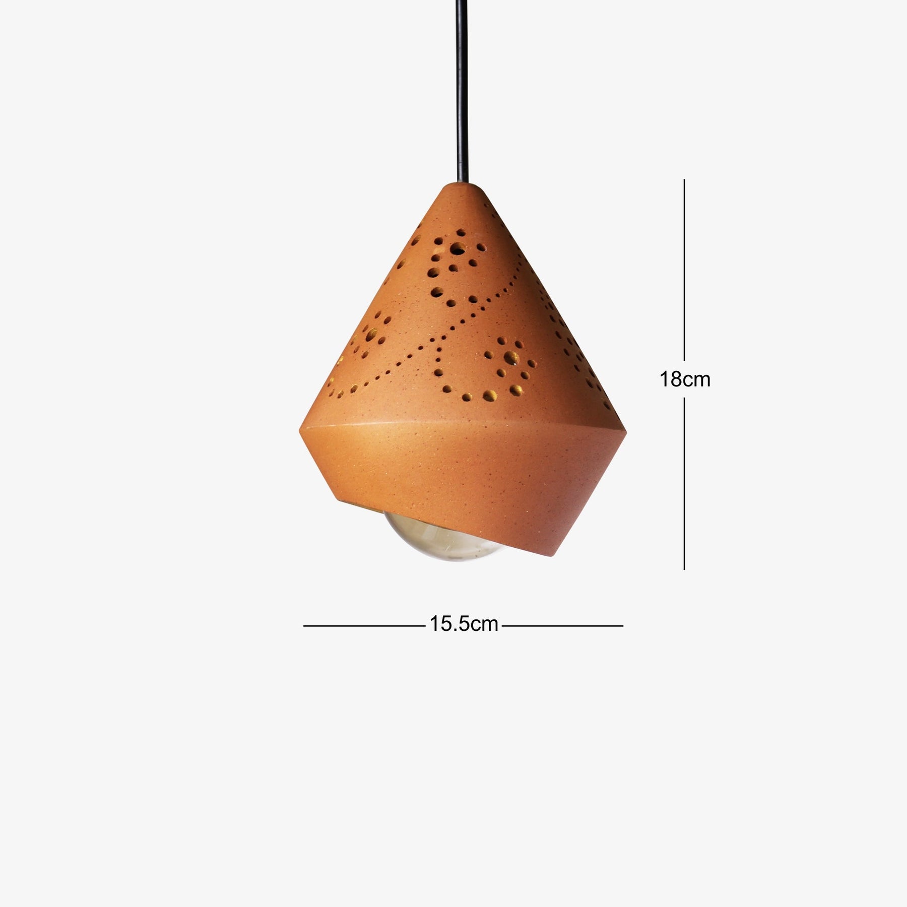 “KONE” : came from CONE. Size is little big helce ‘XL’. Looks beautiful & sturdy in any formal / institutional / reception environment if installed in Single or even cluster of multiple pieces. It is a modern design along with the touch of Indian art through perforated textures. The Light Shade is made of Terracotta Which has a Natural raw earthy look and the inner walls are painted golden with White border on bottom edge surface. The complete light unit is assembled together with B22/E27 holder & spacer with 6mm dia CE marked PVC wires which can straightway be hanged from ceiling with a help of a MS powder coated canopy as given. Bulb costs are not included with this product price.