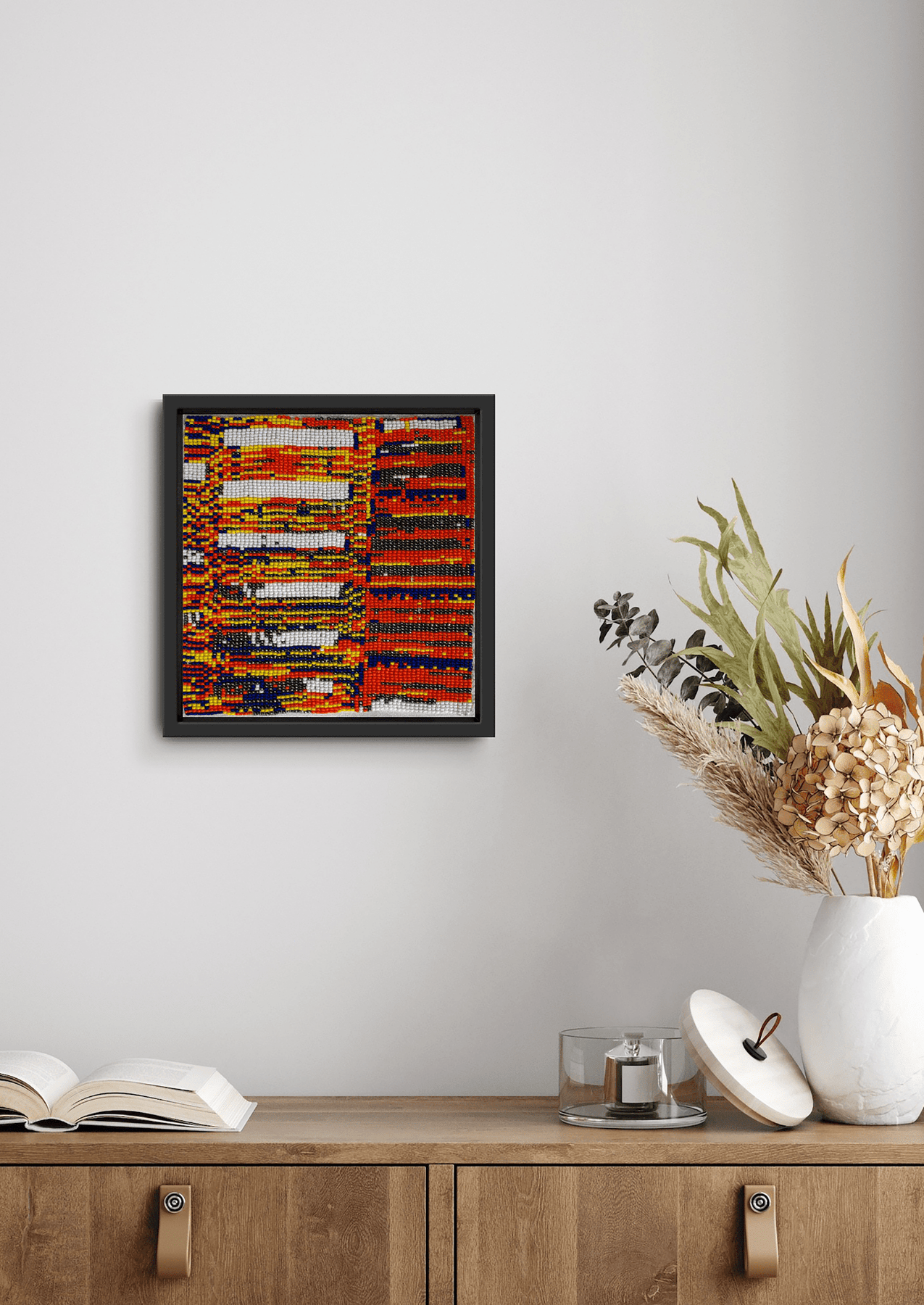 About the Collection: Handwoven on simple wooden looms by artisans in Bhavnagar, Gujarat, this piece embodies India’s fading bead-loom tradition. Tiny glass beads are woven into intricate patterns inspired by nature and geometry, preserving a craft once used to create torans that symbolized welcome and good fortune. Each artwork tells a quiet story — a meditative play of texture, light, and patience.
