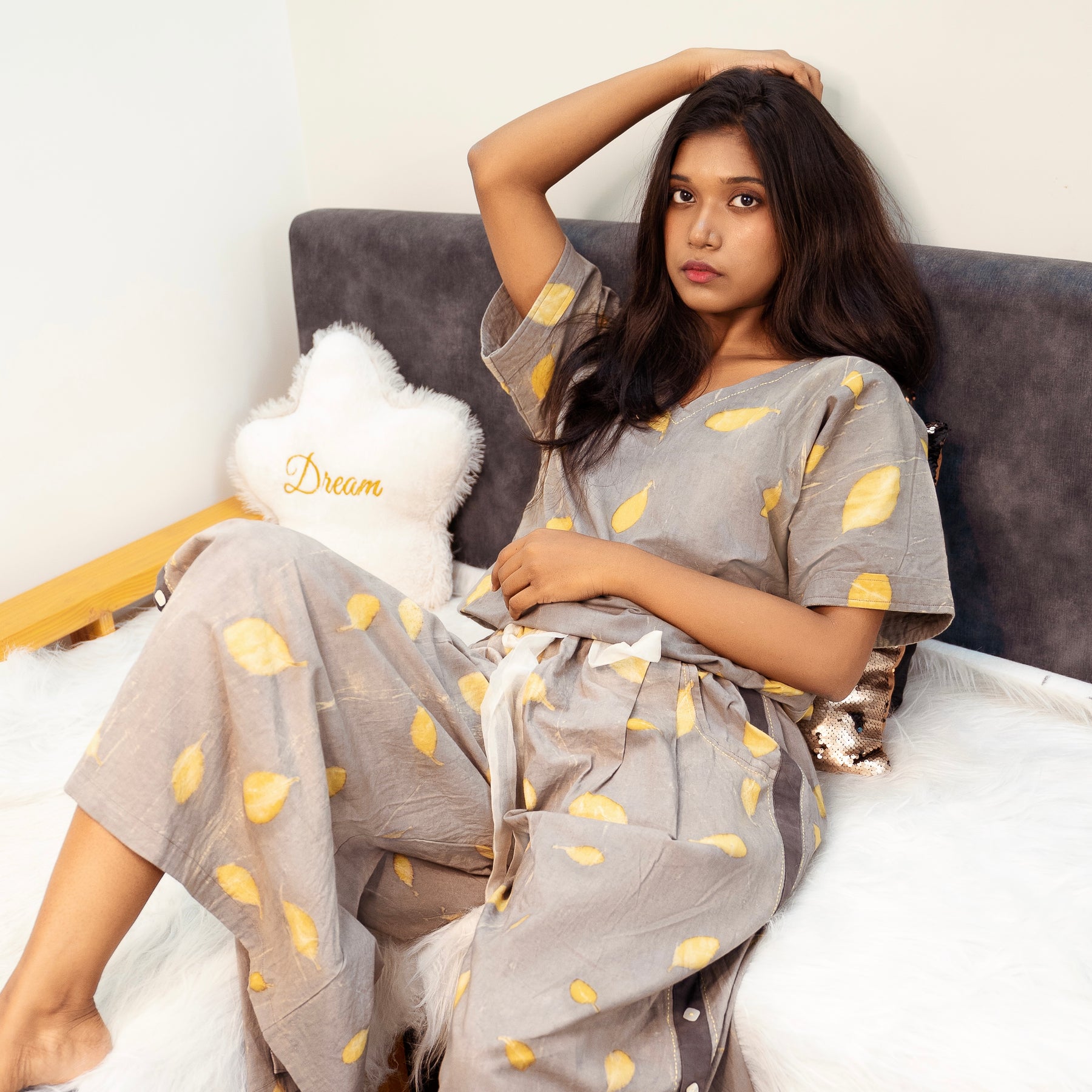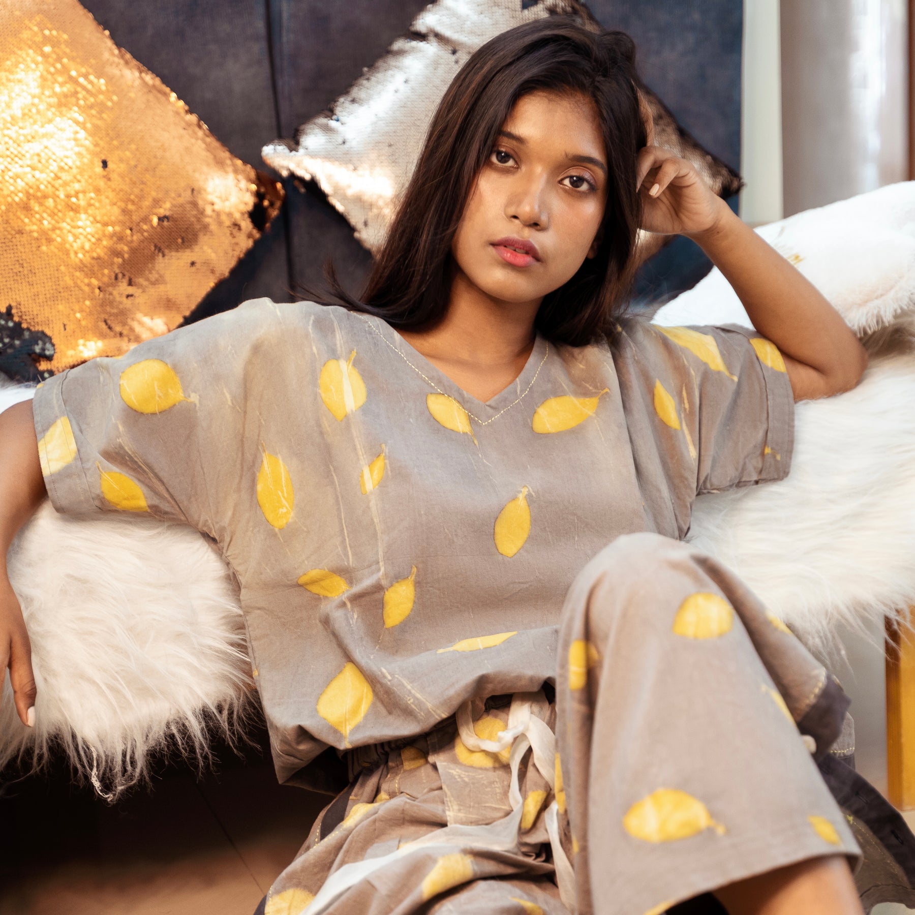 This v-neck comfortable top is made of soft organic cotton dyed and printed with natural materials like leaves using botanical printing technique. Featuring cross belts on back making it more stylish. Very comfortable for home office purpose. Can be pair with our lounge shorts or any lounge long pants.
