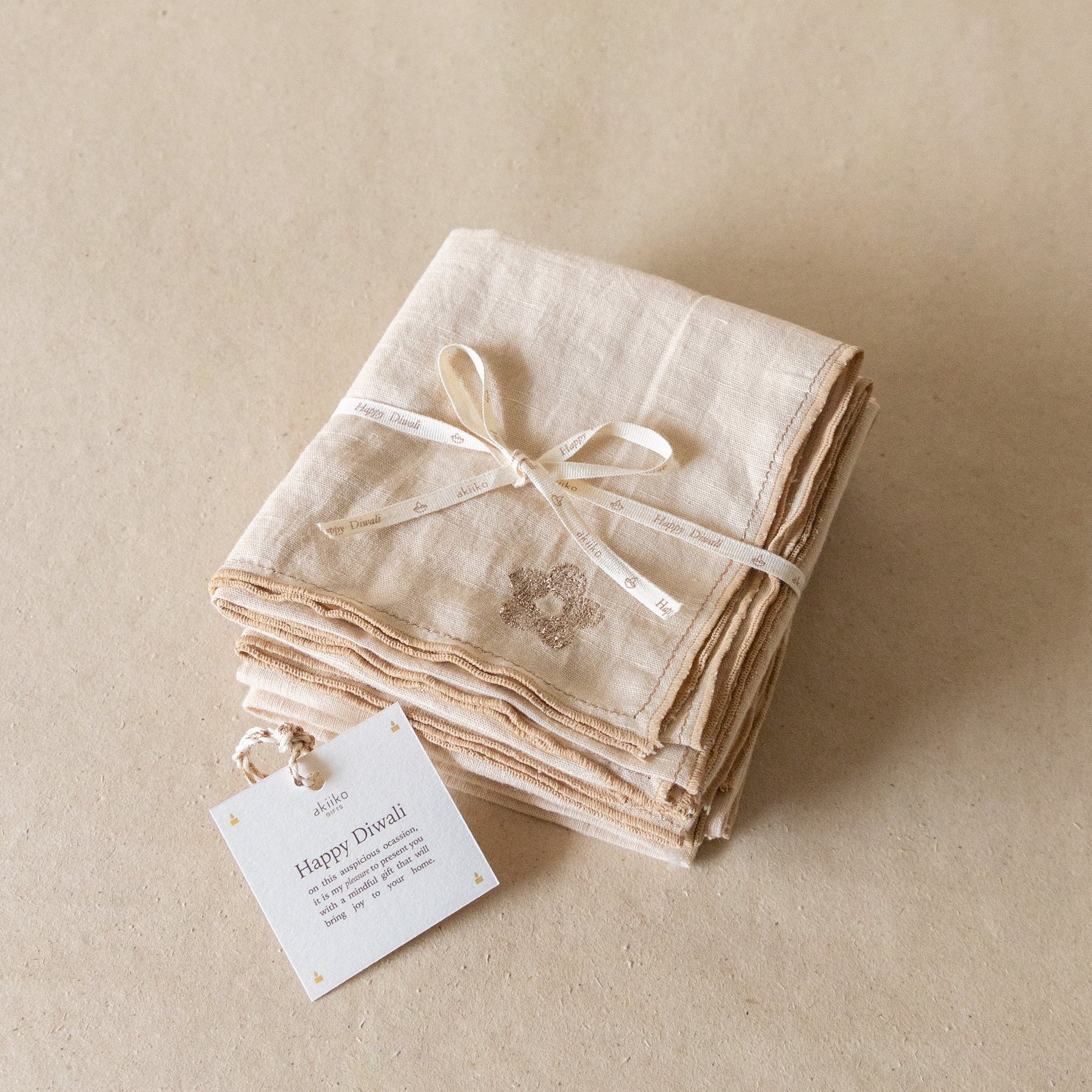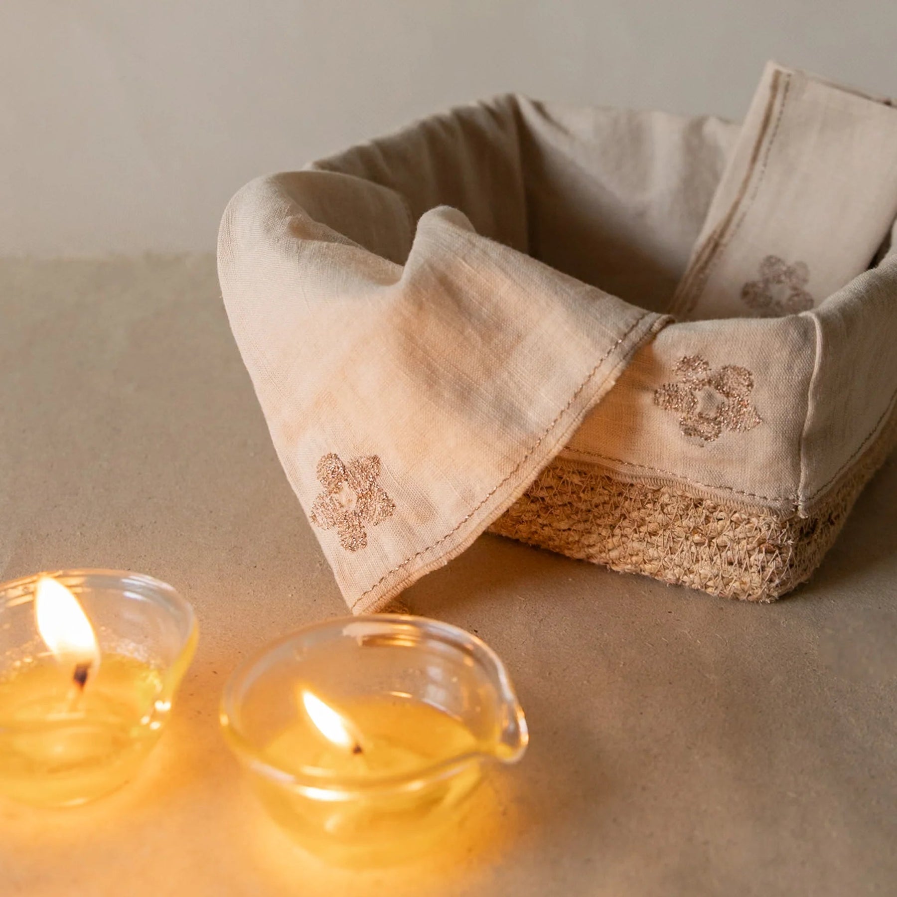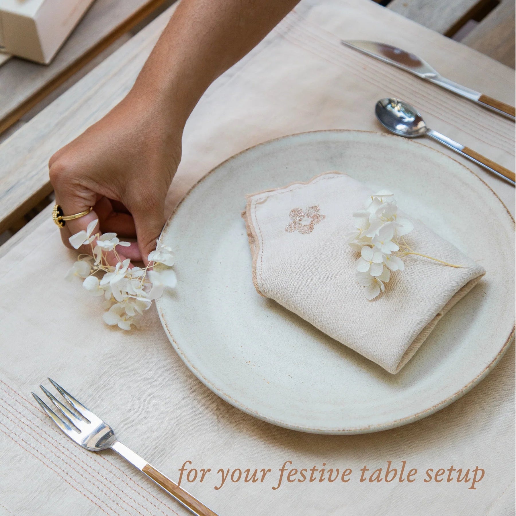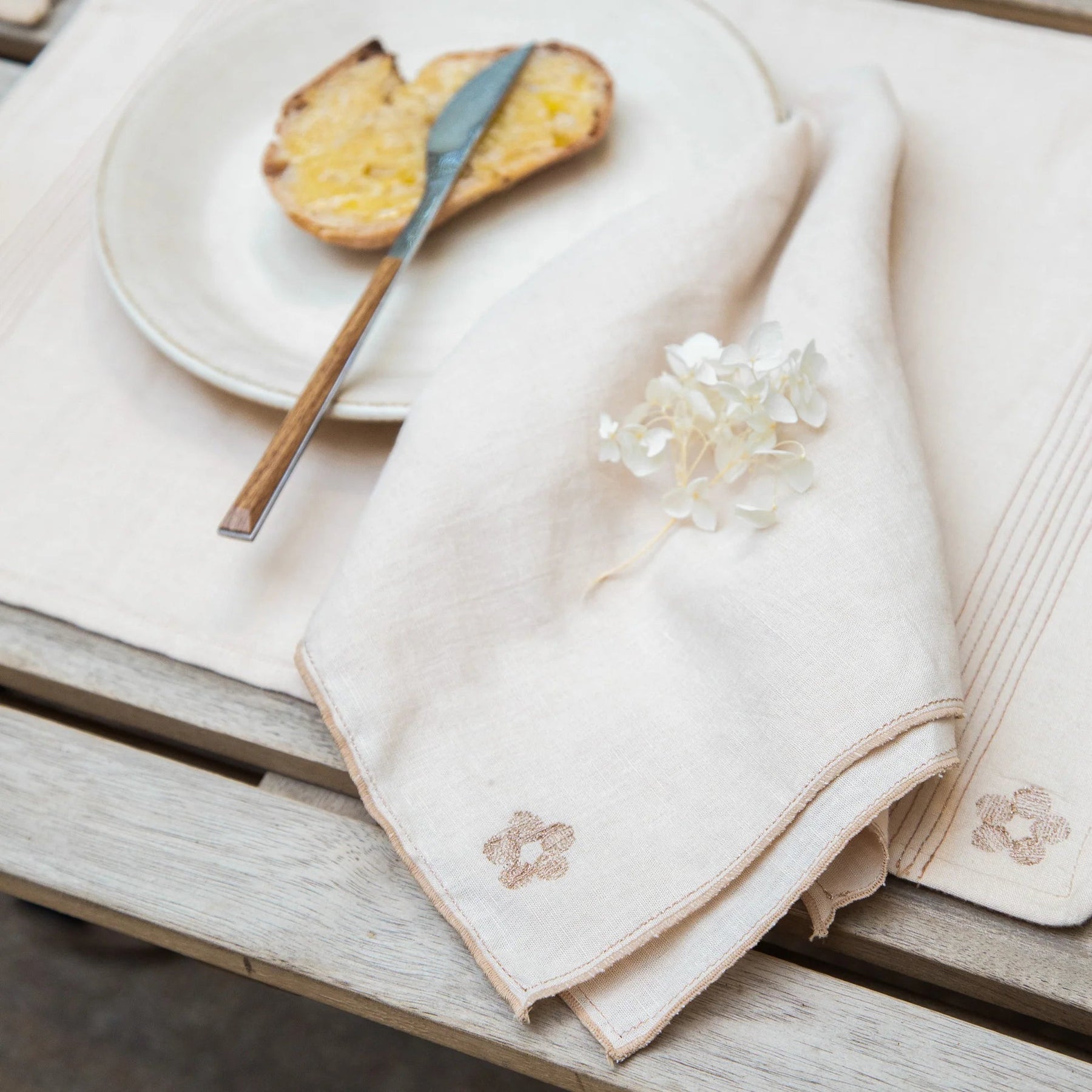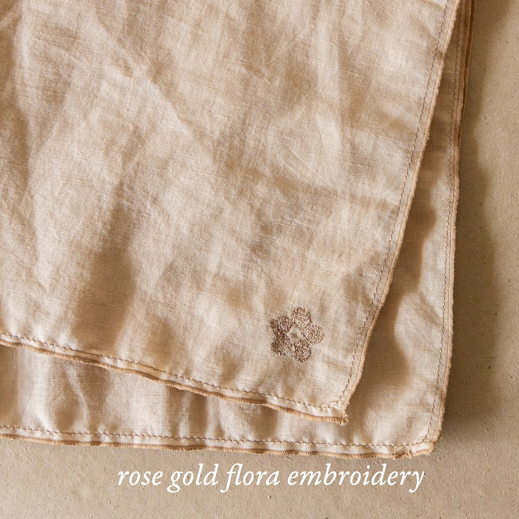 Crafted from a soft linen and cotton blend, they are light, absorbent, and finished with delicate rosegold floral embroidery, a subtle accent that adds charm to your table.