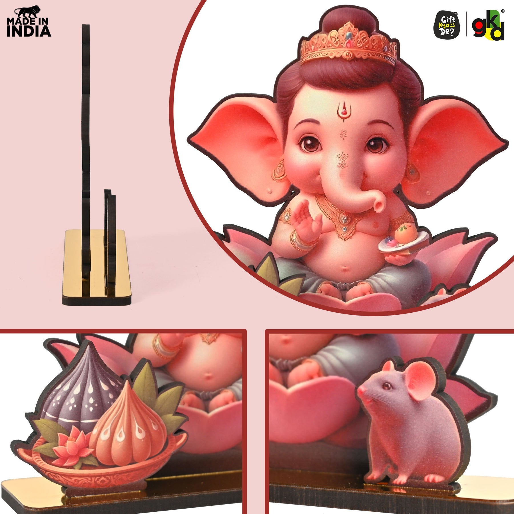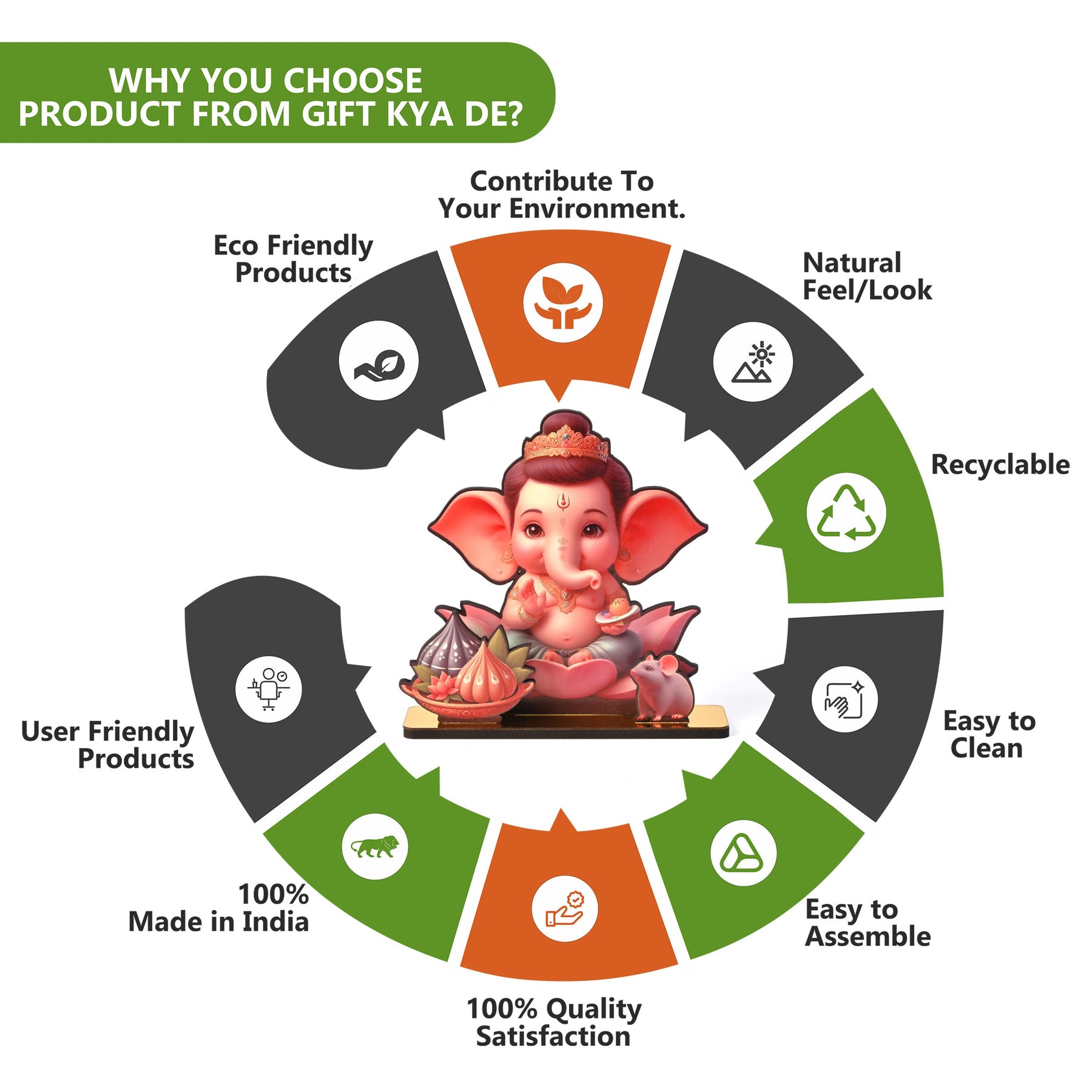 Gift Kya De Lord Ganesh Wooden Table Top Frame with Modak and Mouse | Divine Ganesha Idol for Home, Office & Gift Purposes | Spiritual Home Decor 15 X 13 cm