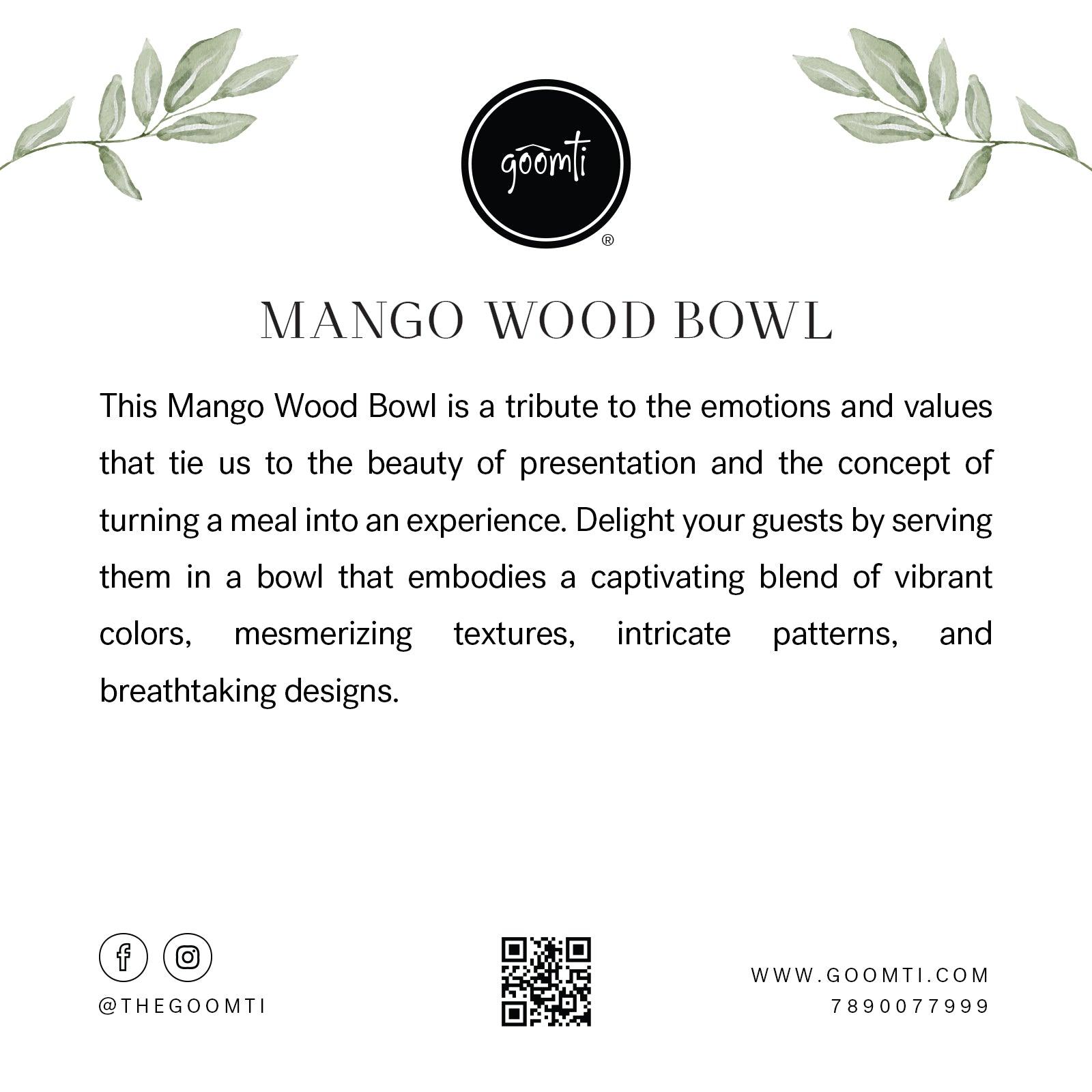 This Mango Wood Bowl is a tribute to the emotions and values that tie us to the beauty of presentation and the concept of turning a meal into an experience. Delight your guests by serving them in a bowl that embodies a captivating blend of vibrant colors, mesmerizing textures, intricate patterns, and breathtaking designs.