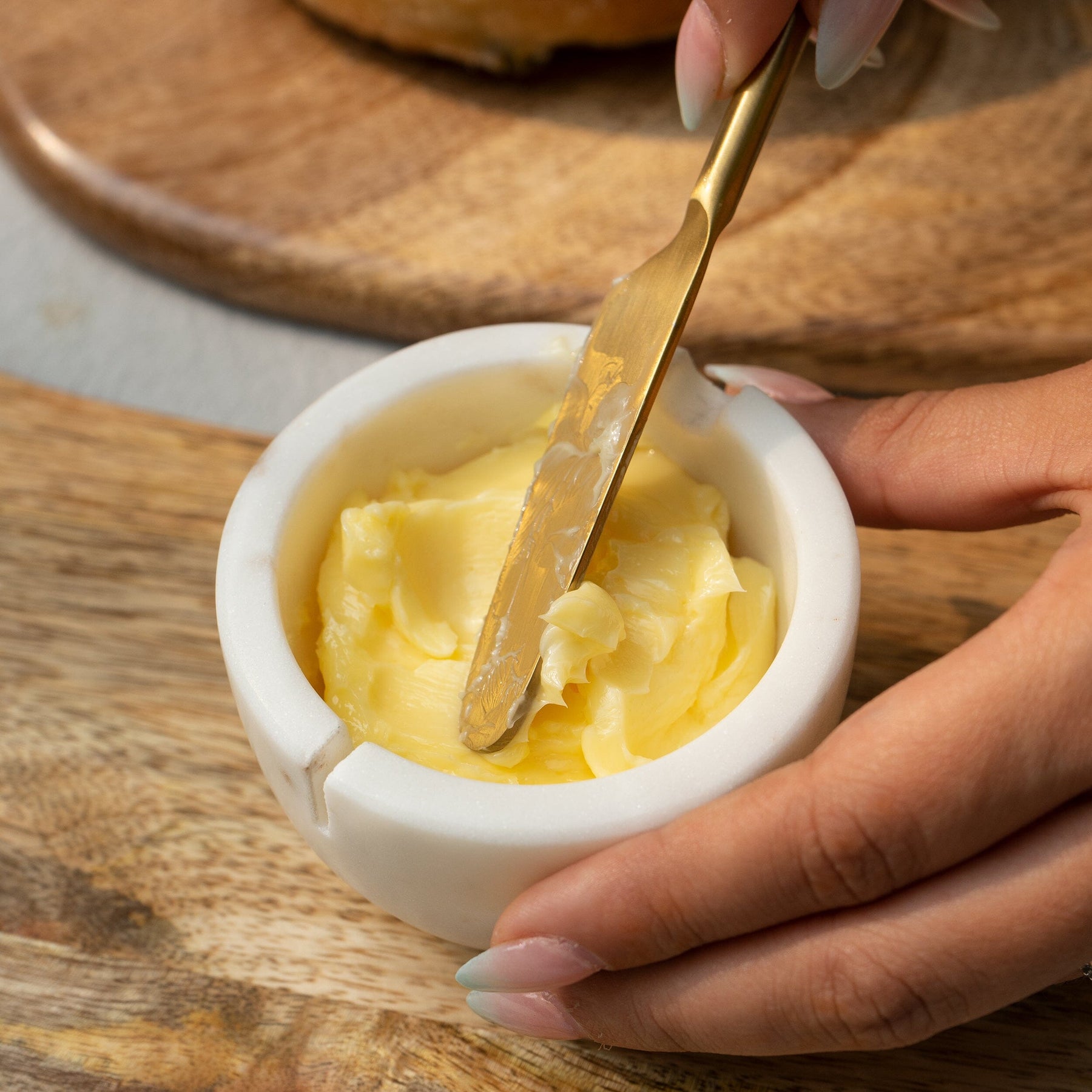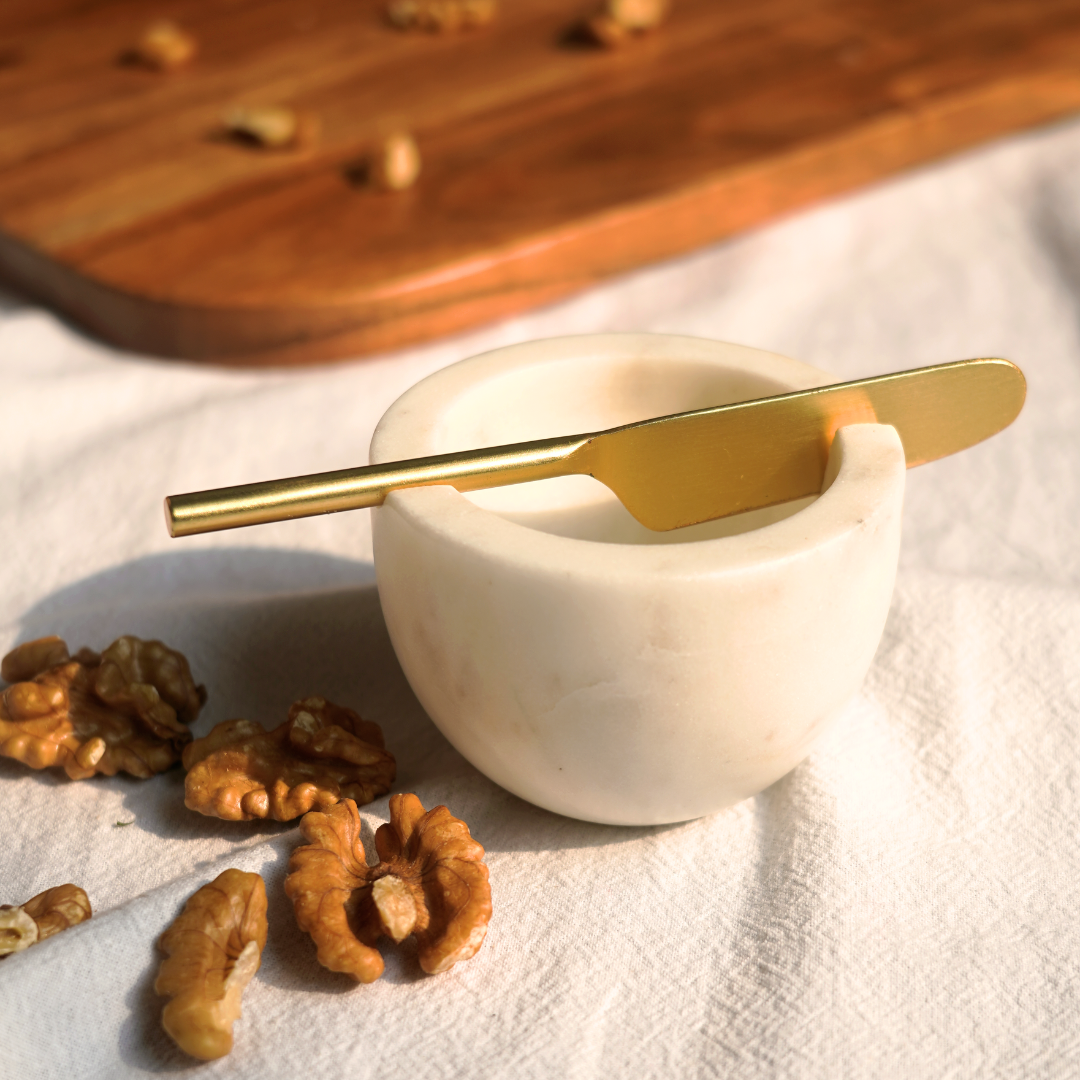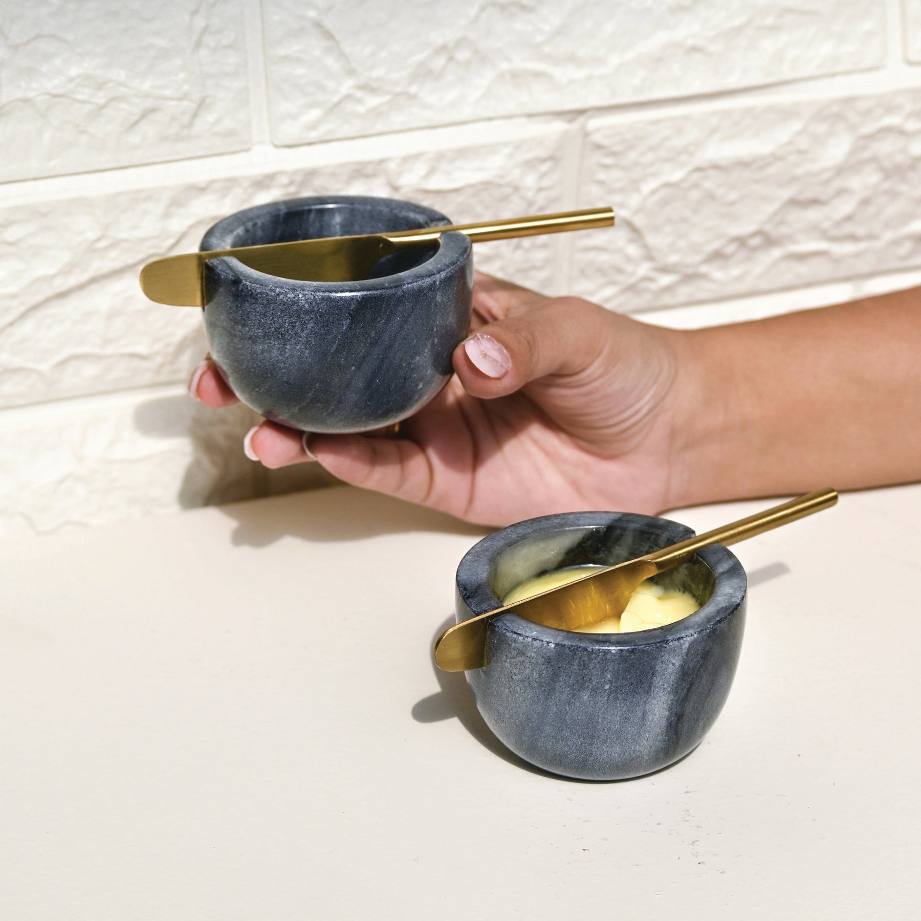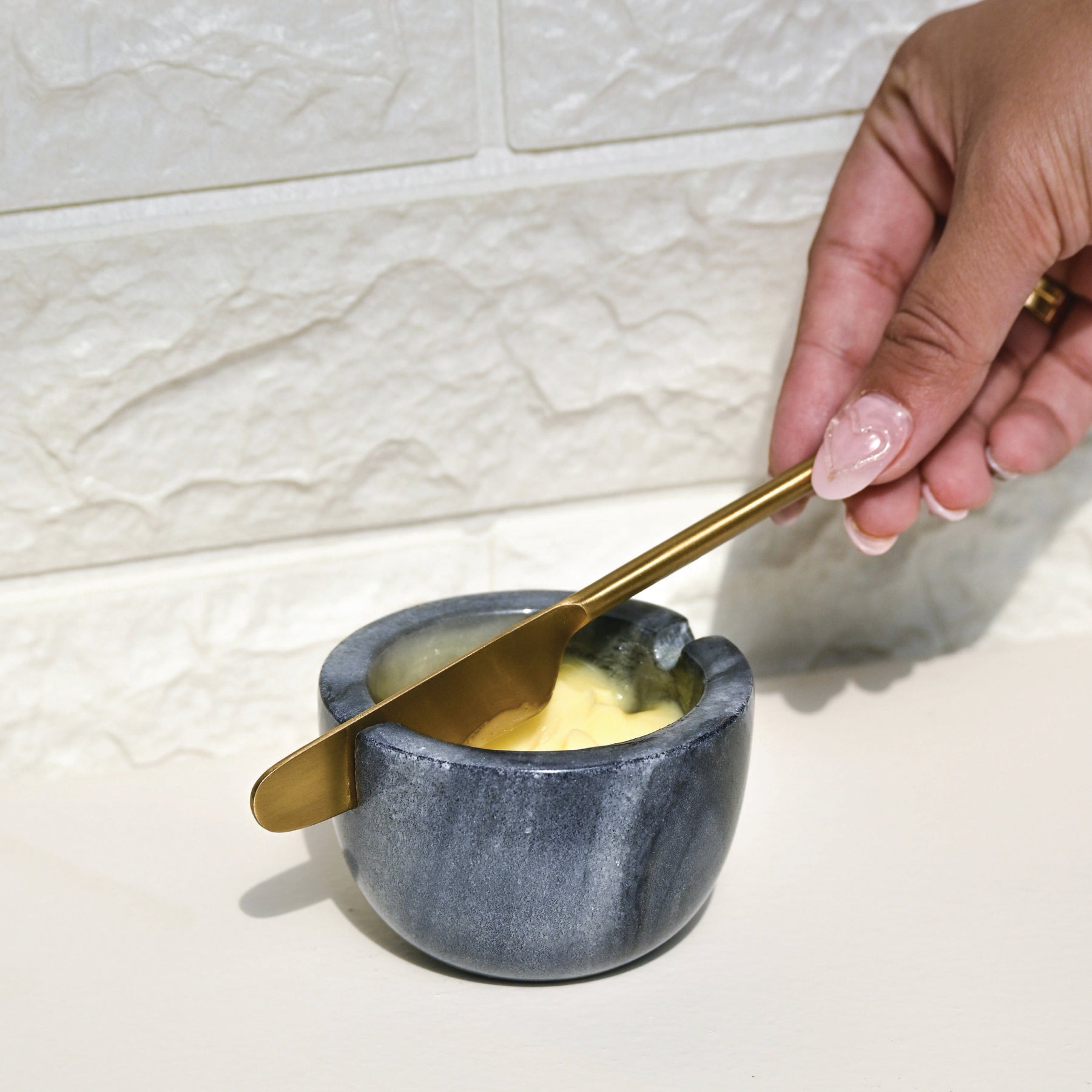 - Crafted out of fine marble in two colors - white and dark grey, this butter dish comes complete with a gold knife that sits neatly atop the bowl