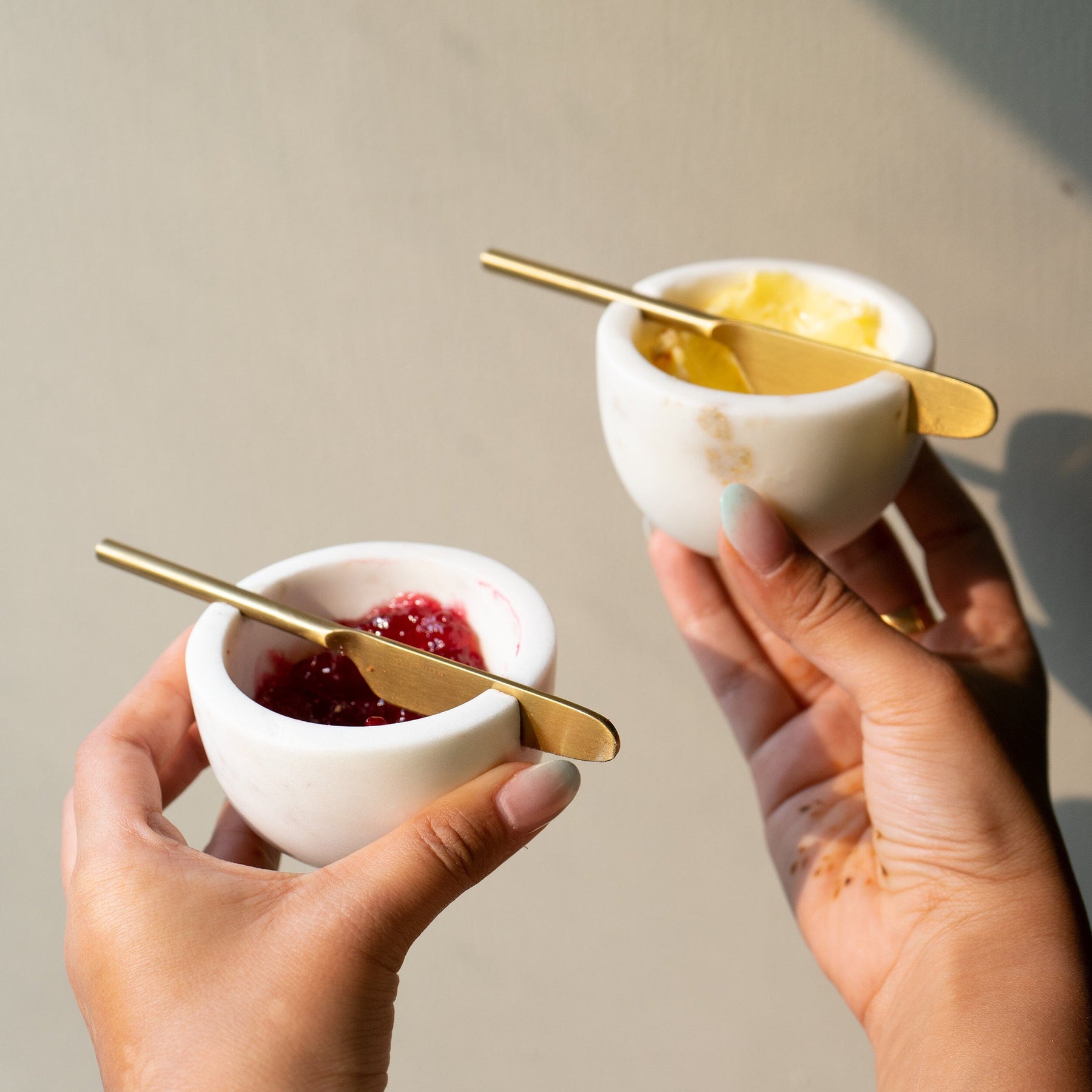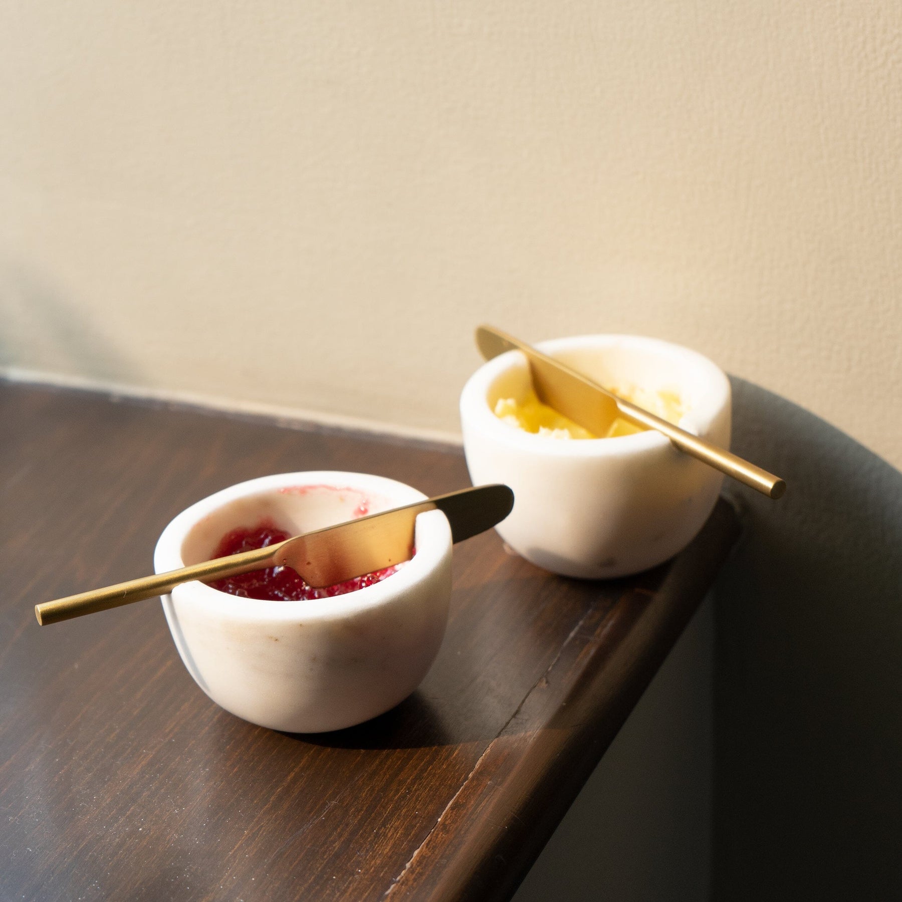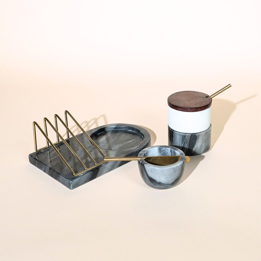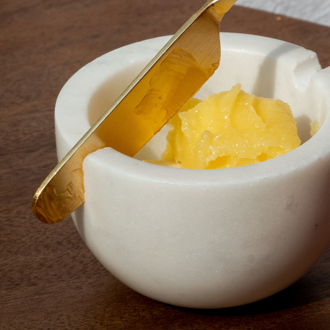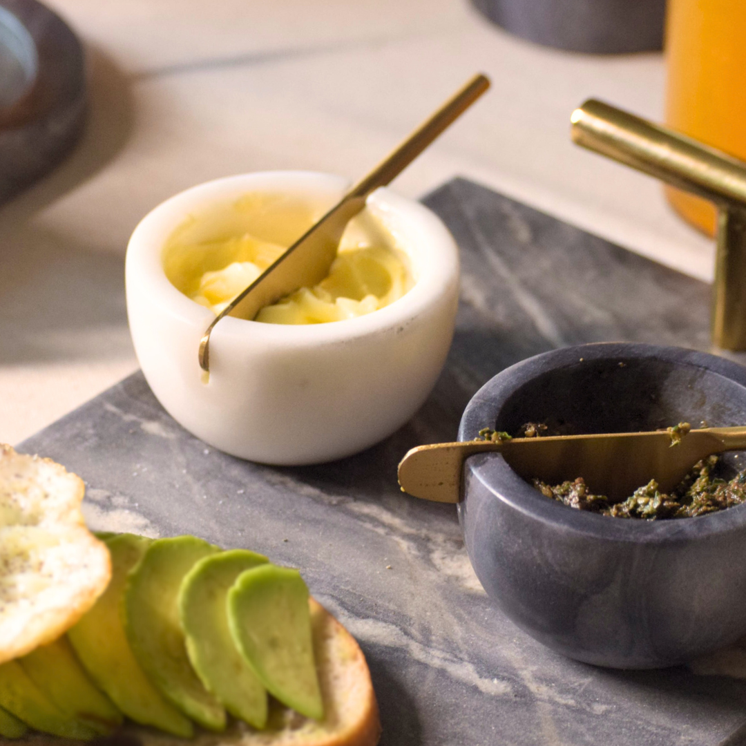 - Crafted out of fine marble in two colors - white and dark grey, this butter dish comes complete with a gold knife that sits neatly atop the bowl