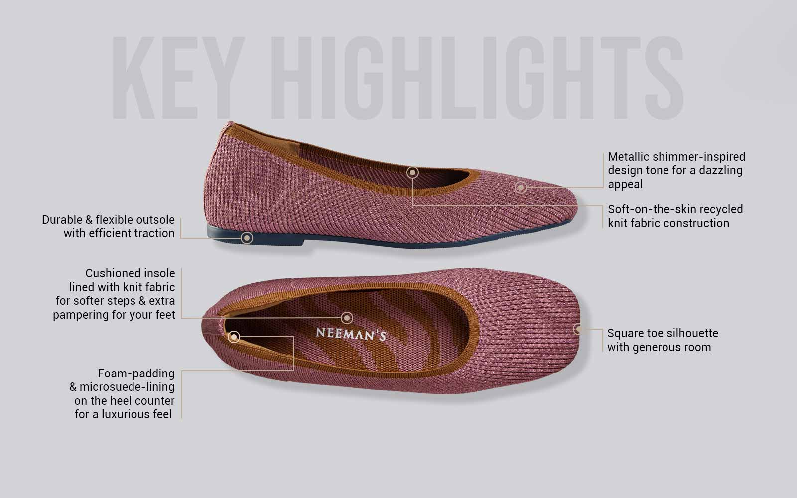 Ladies, we know flats keep you in constant company wherever you go. So, we made a version that adds a pop of cushiony joy to your steps, is pretty to look at & convenient to slip on, blends & transitions seamlessly into multiple roles, and is kind & enduring on our planet. Meet the Metallic Square Flats!