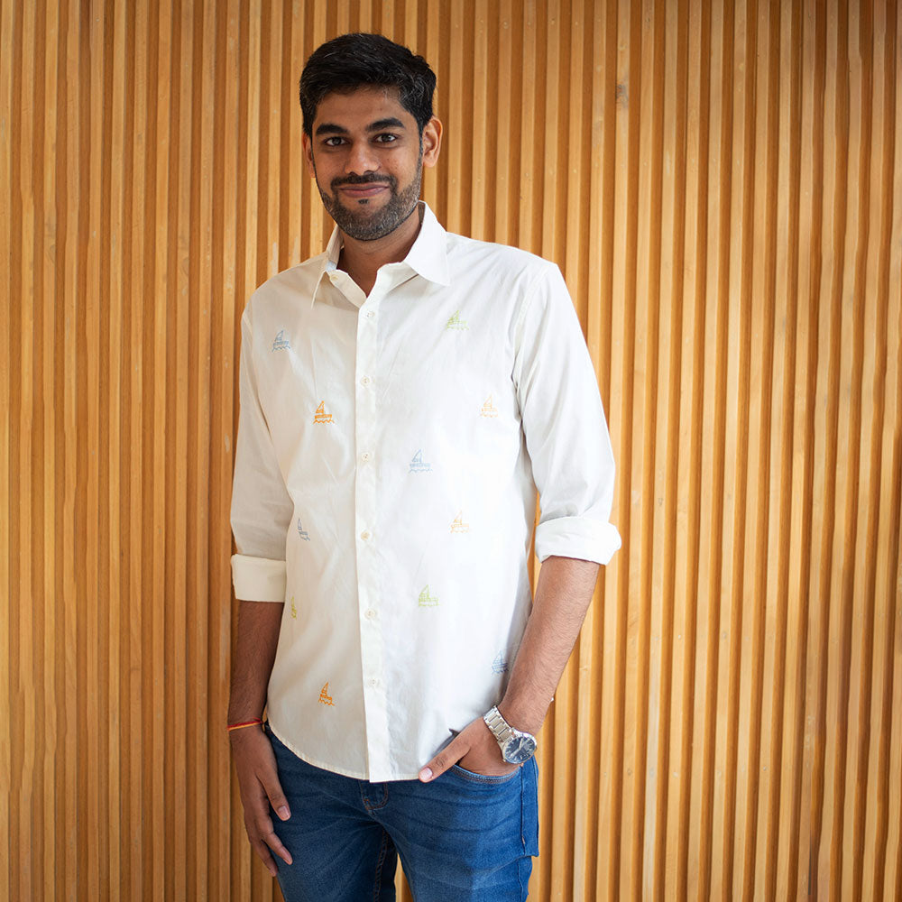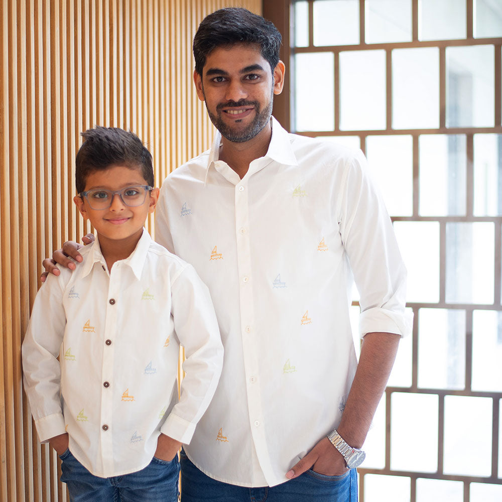 Set sail in style! Featuring hand-embroidered sailboats in soft pastel hues, this breezy shirt brings playful coastal vibes to everyday wear. Made in breathable organic cotton in fresh white and deep navy.