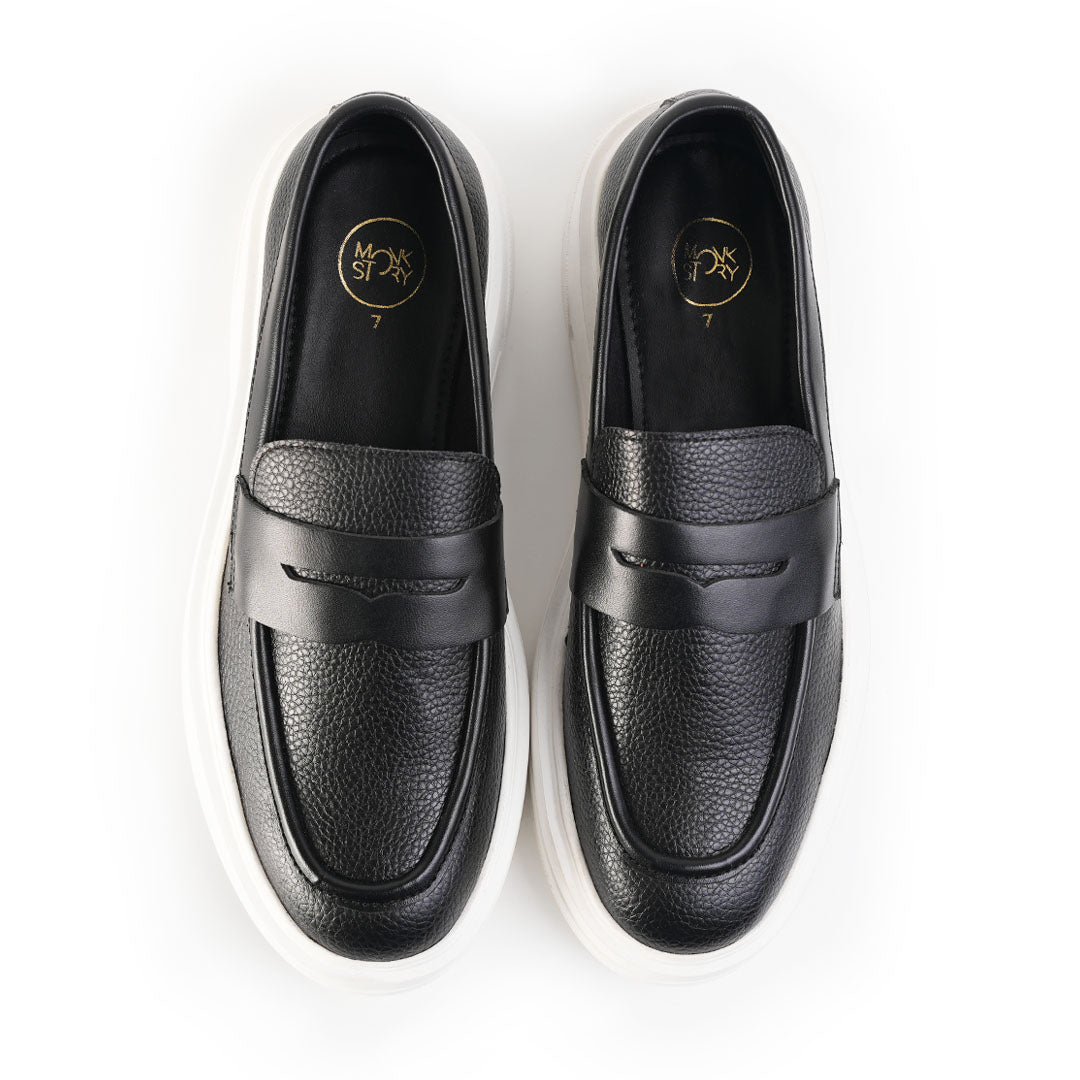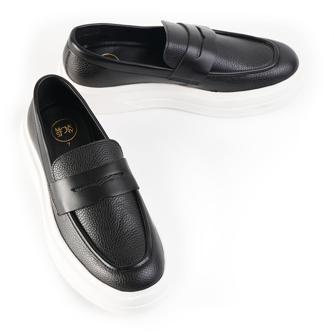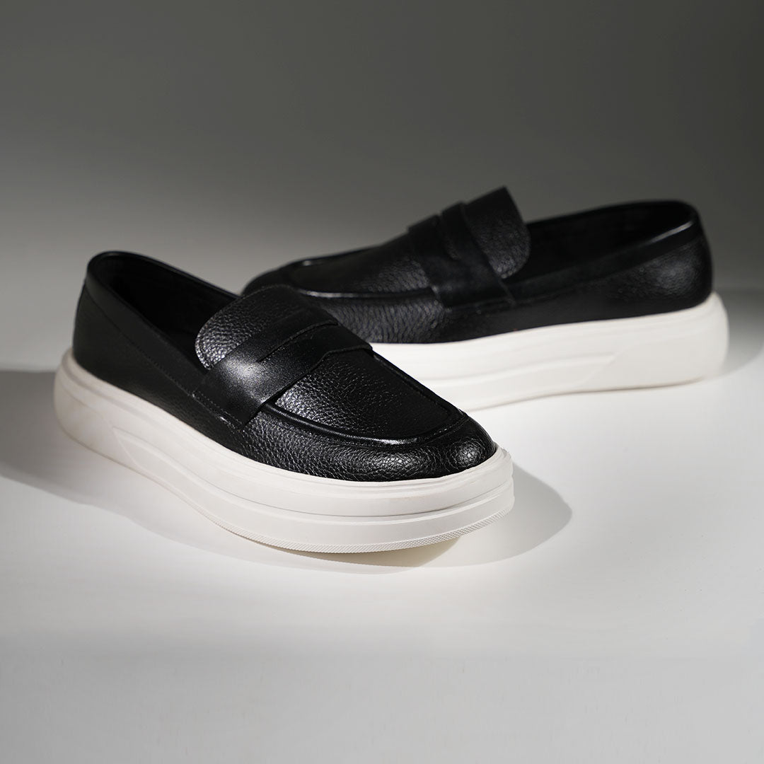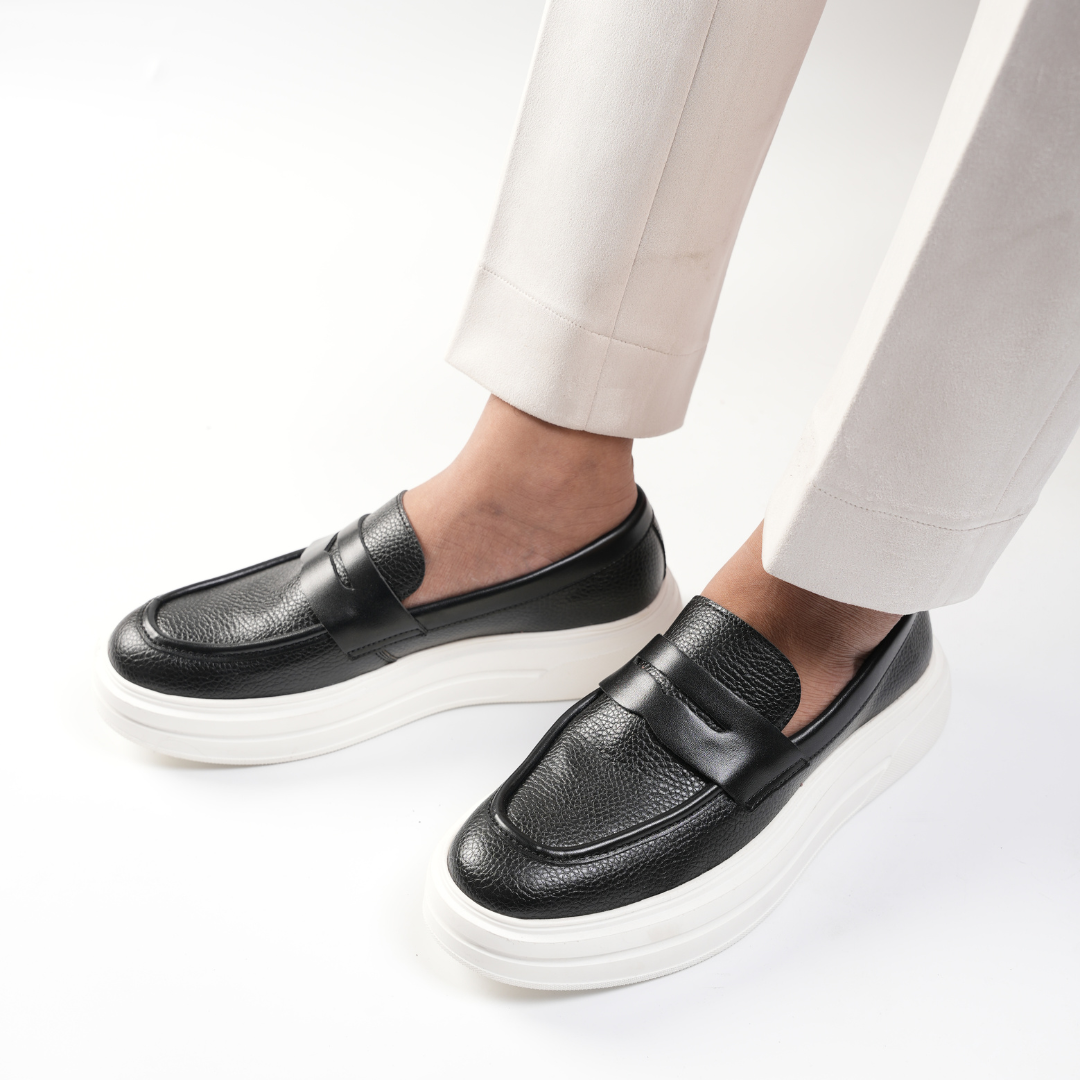 A timeless black penny loafer designed for the modern gentleman. Crafted with premium vegan leather, it features a sleek finish, a classic penny strap, and a lightweight yet durable sole. Perfect for formal and semi-formal occasions.