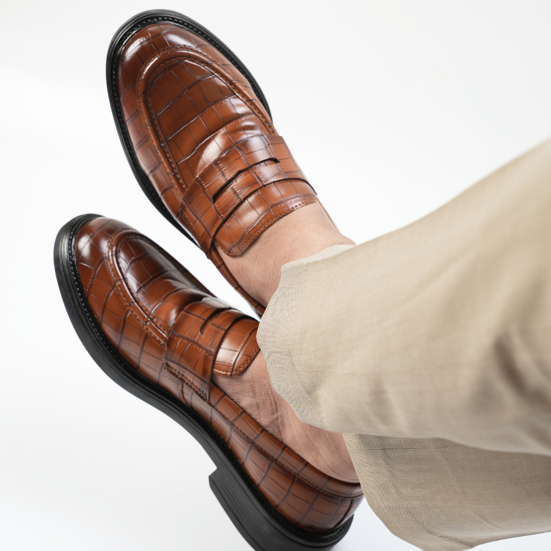 Step into effortless sophistication with our Penny Tan Loafers. Featuring a striking croco-textured vegan leather upper, these loafers exude refined elegance. The deep brown shade adds a touch of vintage charm, while the cushioned insole ensures all-day comfort. Perfect for both formal and smart-casual occasions, these loafers are a must-have for those who appreciate classic style with a modern twist.