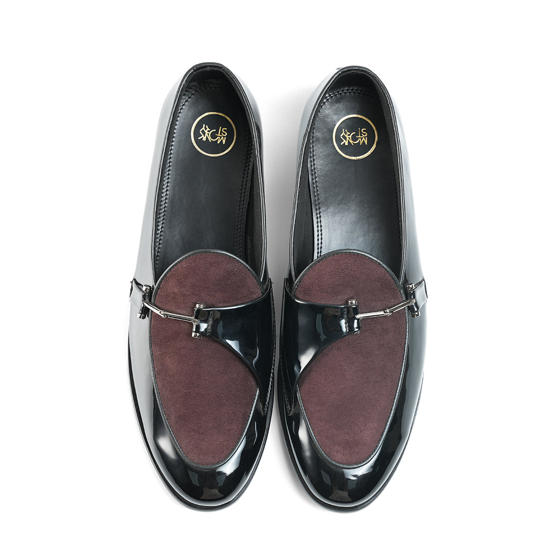 Elevate your formal and semi-formal style with the Eclecta Glossy Side Buckle Slip-Ons. A perfect fusion of sophistication and modern edge, these slip-ons feature a striking contrast of high-gloss patent and velvety suede. The metal side buckle adds a bold statement, making them the perfect footwear for those who appreciate elegance with a hint of extravagance.