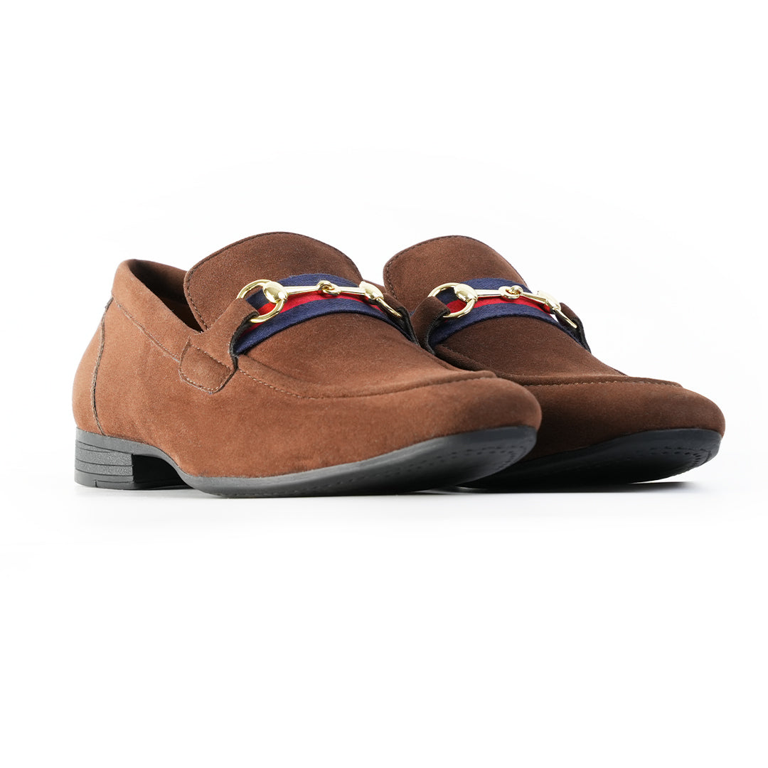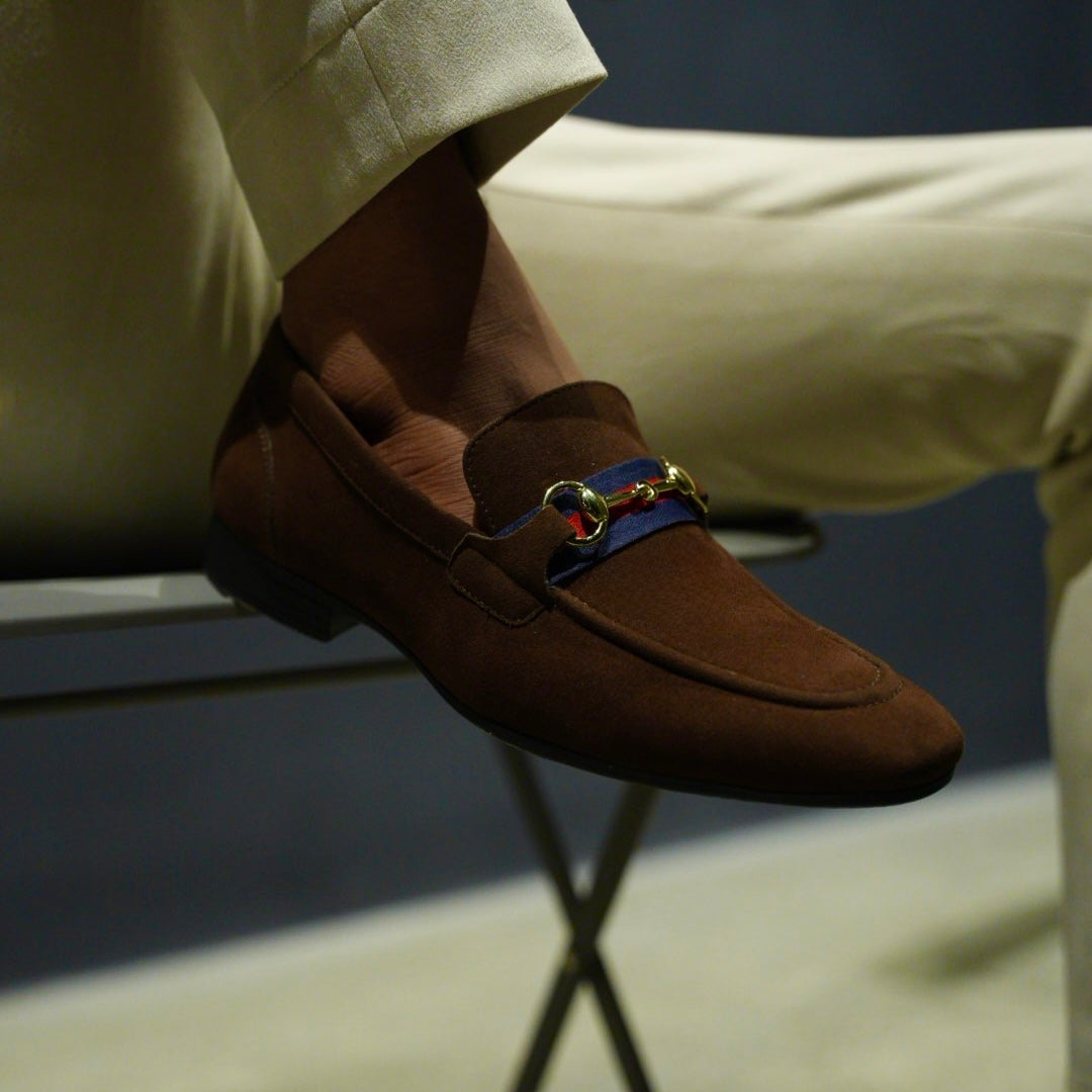 Channeling old-world charm with modern refinement, these brown horsebit loafers are built for men who appreciate quiet luxury. Crafted from premium vegan suede, the rich chocolate upper is accented with a signature tricolour grosgrain ribbon and gold-toned horsebit hardware—an ode to heritage style with a conscious twist. Underneath, a minimalist black sole keeps things grounded and versatile.