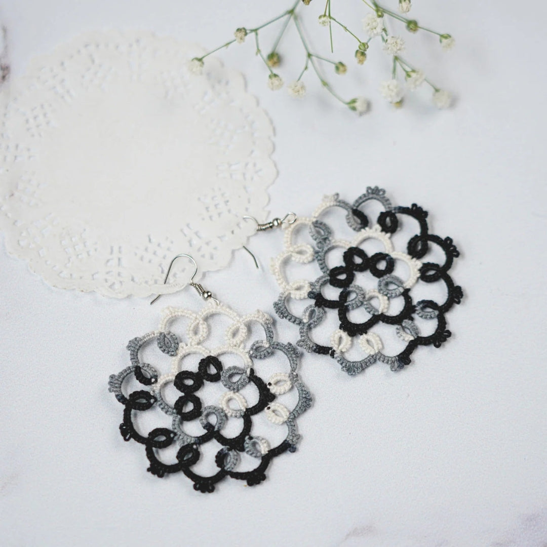 Beautifully crafted with cotton thread using the age-old technique of tatting, these earrings feature intricate lacework created stitch by stitch with shuttle tatting. Handmade with great care, each pair is exclusively crafted using this traditional method. These super cool, extremely lightweight earrings are versatile enough to complement any attire, ensuring you can wear them all day with ease. As artisanal items entirely made and decorated by hand, small imperfections denote the originality of the product. So, hop on board and add a touch of artisanal charm to your ensemble!
