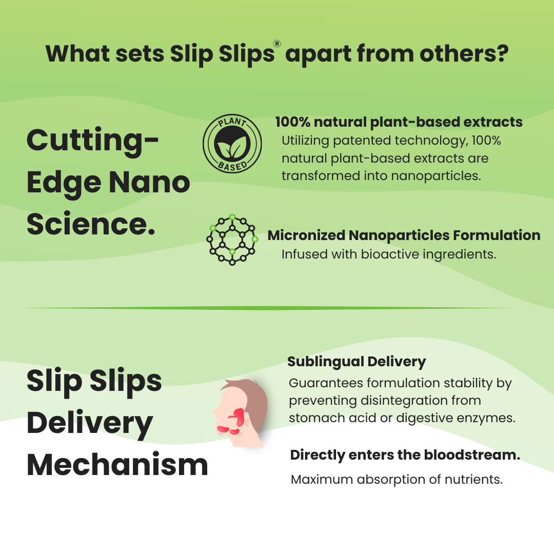 Slip Slips uses the power of nanotechnology to make living healthy easier. These quick-dissolving strips turn essential vitamins and herbs into nanoparticles that melt on your tongue for an enjoyable and fun way to absorb all their goodness!