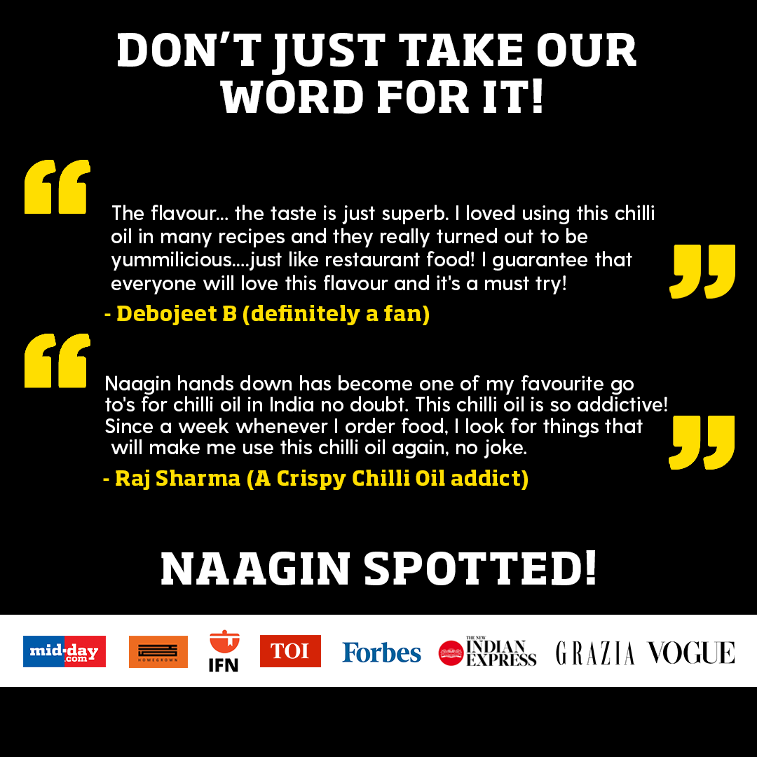 Naagin Crispy Chilli Oil brings out the best of almost any pairing you can think of. Built on a base of global favourite Guntur chillies, our newest kitchen and dining table must-have is a special blend of crispy-crunchy, slow-roasted flavours and a solid dose of umami you can savour. While most chilli oils are just infusions, we bring you a crispy classic which is 100% Vegan, and has no added sugars and no transfat. Ethically sourced and locally made, our Crispy Chilli Oil has 100% natural ingredients, real vegetables, and original flavours born from our obsessive passion to create unique products that our customers will love.